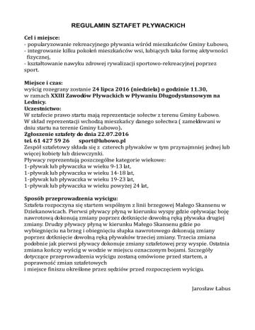 REGULAMIN SZTAFET PŁYWACKICH Cel i miejsce: - popularyzowanie rekreacyjnego pływania wśród mieszkańców Gminy Łubowo, - integrowanie kilku pokoleń mieszkańców wsi, lubiących taka formę aktywności fizycznej, - kształtowanie nawyku zdrowej rywalizacji sportowo-rekreacyjnej poprzez sport. Miejsce i czas: wyścig rozegrany zostanie 24 lipca 2016 (niedziela) o godzinie 11.30, w ramach XXIII Zawodów Pływackich w Pływaniu Długodystansowym na Lednicy. Uczestnictwo: W sztafecie prawo startu mają reprezentacje sołectw z terenu Gminy Łubowo. W skład reprezentacji wchodzą mieszkańcy danego sołectwa ( zameldowani w dniu startu na terenie Gminy Łubowo). Zgłoszenie sztafety do dnia 22.07.2016 tel. 61 427 59 26 [email protected] Zespół sztafetowy składa się z czterech pływaków w tym przynajmniej jednej lub więcej kobiety lub dziewczynki. Pływacy reprezentują poszczególne kategorie wiekowe: 1-pływak lub pływaczka w wieku 9-13 lat, 1-pływak lub pływaczka w wieku 14-18 lat, 1-pływak lub pływaczka w wieku 19-23 lat, 1-pływak lub pływaczka w wieku powyżej 24 lat, Sposób przeprowadzenia wyścigu: Sztafeta rozpoczyna się startem wspólnym z linii brzegowej Małego Skansenu w Dziekanowicach. Pierwsi pływacy płyną w kierunku wyspy gdzie opływając boję nawrotową dokonują zmiany poprzez dotknięcie dowolną ręką pływaka drugiej zmiany. Drudzy pływacy płyną w kierunku Małego Skansenu gdzie po wybiegnięciu na brzeg i obiegnięciu słupka nawrotowego dokonują zmiany poprzez dotknięcie dowolną ręką pływaków trzeciej zmiany. Trzecia zmiana podobnie jak pierwsi pływacy dokonuje zmiany sztafetowej przy wyspie. Ostatnia zmiana kończy wyścig w wodzie w miejscu oznaczonym bojami. Szczegóły dotyczące przeprowadzenia wyścigu zostaną omówione przed startem, a poprawność zmian sztafetowych i miejsce finiszu określone przez sędziów przed rozpoczęciem wyścigu. Jarosław Łabus
