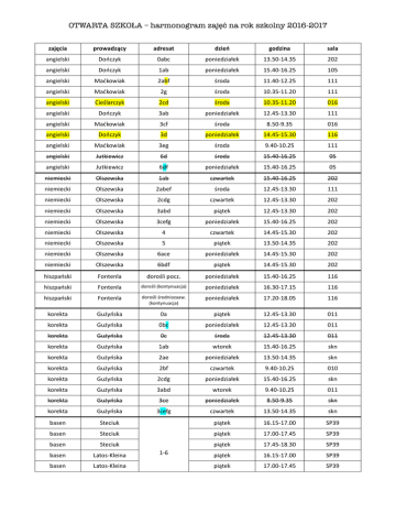 OTWARTA SZKOðA – harmonogram zajęć na rok szkolny 2016-2017 zajęcia prowadzący adresat dzień godzina sala angielski Dończyk 0abc poniedziałek 13.50-14.35 202 angielski Dończyk 1ab poniedziałek 15.40-16.25 105 angielski Maćkowiak 2abf środa 11.40-12.25 111 angielski Maćkowiak 2g środa 10.35-11.20 111 angielski Cieślarczyk 2cd środa 10.35-11.20 016 angielski Dończyk 3ab poniedziałek 12.45-13.30 111 angielski Maćkowiak 3cf środa 8.50-9.35 016 angielski Dończyk 3d poniedziałek 14.45-15.30 116 angielski Maćkowiak 3eg środa 9.40-10.25 111 angielski Jutkiewicz 6d środa 15.40-16.25 05 angielski Jutkiewicz 6df poniedziałek 15.40-16.25 05 niemiecki Olszewska 1ab czwartek 15.40-16.25 202 niemiecki Olszewska 2abef środa 12.45-13.30 111 niemiecki Olszewska 2cdg czwartek 12.45-13.30 202 niemiecki Olszewska 3abd piątek 12.45-13.30 202 niemiecki Olszewska 3cefg poniedziałek 15.40-16.25 202 niemiecki Olszewska 4 czwartek 14.45-15.30 202 niemiecki Olszewska 5 piątek 13.50-14.35 202 niemiecki Olszewska 6ace poniedziałek 14.45-15.30 202 niemiecki Olszewska 6bdf piątek 14.45-15.30 202 hiszpański Fontenla doroślipocz. poniedziałek 15.40-16.25 116 hiszpański Fontenla dorośli(kontynuacja) poniedziałek 16.30-17.15 116 hiszpański Fontenla dorośliśredniozaaw. (kontynuacja) poniedziałek 17.20-18.05 116 korekta Gużyńska 0a piątek 12.45-13.30 011 korekta Gużyńska 0bc poniedziałek 12.45-13.30 011 korekta Gużyńska 0c środa 12.45-13.30 011 korekta Gużyńska 1ab wtorek 15.40-16.25 skn korekta Gużyńska 2ae poniedziałek 13.50-14.35 skn korekta Gużyńska 2bf czwartek 9.40-10.25 010 korekta Gużyńska 2cdg poniedziałek 15.40-16.25 skn korekta Gużyńska 3abd wtorek 9.40-10.25 011 korekta Gużyńska 3ce poniedziałek 8.50-9.35 skn korekta Gużyńska 3cefg czwartek 13.50-14.35 skn basen Steciuk piątek 16.15-17.00 SP39 basen Steciuk piątek 17.00-17.45 SP39 basen Steciuk piątek 17.45-18.30 SP39 basen Latos-Kleina piątek 16.15-17.00 SP39 basen Latos-Kleina 1-6 piątek 17.00-17.45 SP39 OTWARTA SZKOðA – harmonogram zajęć na rok szkolny 2016-2017 basen Latos-Kleina basen Steciuk basen Steciuk basen Steciuk basen Steciuk basen piątek 17.45-18.30 SP39 sobota 11.00-11.45 SP39 sobota 11.45-12.30 SP39 sobota 12.30-13.15 SP39 sobota 13.15-14.00 SP39 Latos-Kleina sobota 11.00-11.45 SP39 basen Latos-Kleina sobota 11.45-12.30 SP39 basen Latos-Kleina sobota 12.30-13.15 SP39 basen Latos-Kleina sobota 13.15-14.00 SP39 unihokej Gużyńska 1-3 poniedziałek 14.45-15.30 salagimn.nowa unihokej Ławicka 4-6 środa 15.30-16.30 salagimn.nowa koszykówka Budzisz 4-6 wtorek 15.30-17.00 salagimn.nowa siatkówka Gajzler 1-3 czwartek 13.50-14.35 010 siatkówka Gajzler absolwenciSP6 czwartek 15.40-16.25 salagimn.nowa rugbytag Gajzler chłopcy1-3 czwartek 14.45-15.30 salagimn.nowa zumbafiitness Gęga dorośli środa 17.45-18.30 salakorekcyjna nowa szachy Sikora poniedziałek 11.40-12.25 203 szachy Sikora poniedziałek 12.45-13.30 203 szachy Sikora poniedziałek 13.50-14.35 203 szachy Sikora 0-6 poniedziałek 14.45-15.30 203 szachy Sikora wtorek 12.45-13.30 203 szachy Sikora wtorek 13.50-14.35 203 szachy Sikora wtorek 14.45-15.30 203 szachy Sikora wtorek 15.40-16.25 203 Krosniata Kłodzińska 1-6 czwartek 15.40-17.20 stołówka gitara Hendzel 1-3 poniedziałek 10.35-11.20 203 gitara Kosińska 4-6 zapisyprzyjmowaneprzezprowadzącą: keyboard Kosińska 1-6 logopedia Krenska 0-3 warsztaty teatralne ChojnowskaGąsiorek dorośli terminspotkańzostanieustalonyna 1szychzajęciach6.10.2016r ogodz.17.00 204 kreatywne warsztaty rozwoju manualnego Jesionowska 2-3 czwartek13.00-13.45 czwartek14.00-14.45 111 warsztaty świąteczne Jesionowska dorośli dorośli+dzieci 10.12(1spotkanie=90minut) 1.04(1spotkanie=90minut) n 1-6 [email protected] wtorek,piątek 8.00-15.00 ustalane indywidualnie zprowadzącą ż 208 OTWARTA SZKOðA – harmonogram zajęć na rok szkolny 2016-2017 LEGENDA: abc–nowezajęcia abc–zajęciaprzeniesione,grupypołączone abc–zajęciawykluczonezofertyzewzględunabraklubniskiezainteresowanie