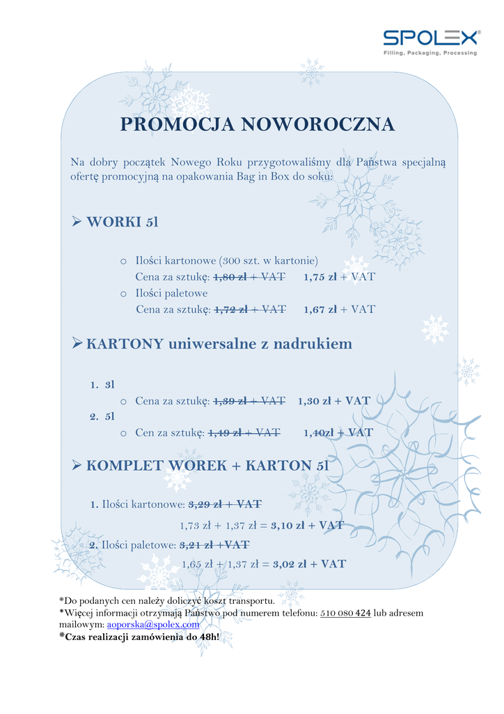 PROMOCJA NOWOROCZNA Na dobry początek Nowego Roku przygotowaliśmy dla Państwa specjalną ofertę promocyjną na opakowania Bag in Box do soku: WORKI 5l o Ilości kartonowe (300 szt. w kartonie) Cena za sztukę: 1,80 zł + VAT 1,75 zł + VAT o Ilości paletowe Cena za sztukę: 1,72 zł + VAT 1,67 zł + VAT KARTONY uniwersalne z nadrukiem 1. 3l o Cena za sztukę: 1,39 zł + VAT 1,30 zł + VAT 2. 5l o Cen za sztukę: 1,49 zł + VAT 1,40zł + VAT KOMPLET WOREK + KARTON 5l 1. Ilości kartonowe: 3,29 zł + VAT 1,73 zł + 1,37 zł = 3,10 zł + VAT 2. Ilości paletowe: 3,21 zł +VAT 1,65 zł + 1,37 zł = 3,02 zł + VAT *Do podanych cen należy doliczyć koszt transportu. *Więcej informacji otrzymają Państwo pod numerem telefonu: 510 080 424 lub adresem mailowym: [email protected] *Czas realizacji zamówienia do 48h!