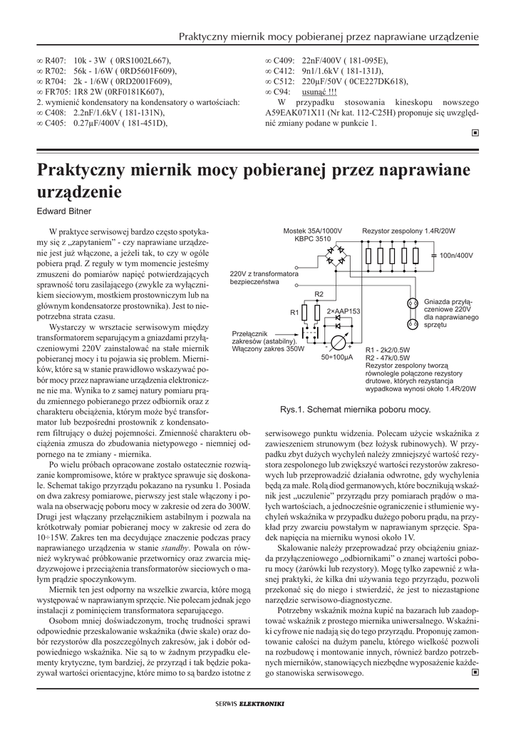 Praktyczny miernik mocy pobieranej przez naprawiane urz¹dzenie • R407: 10k - 3W ( 0RS1002L667), • R702: 56k - 1/6W ( 0RD5601F609), • R704: 2k - 1/6W ( 0RD2001F609), • FR705: 1R8 2W (0RF0181K607), 2. wymieniæ kondensatory na kondensatory o wartociach: • C408: 2.2nF/1.6kV ( 181-131N), • C405: 0.27µF/400V ( 181-451D), • • • • C409: 22nF/400V ( 181-095E), C412: 9n1/1.6kV ( 181-131J), C512: 220µF/50V ( 0CE227DK618), C94: usun¹æ !!! W przypadku stosowania kineskopu nowszego A59EAK071X11 (Nr kat. 112-C25H) proponuje siê uwzglêdniæ zmiany podane w punkcie 1. } Praktyczny miernik mocy pobieranej przez naprawiane urz¹dzenie Edward Bitner Rezystor zespolony 1.4R/20W Mostek 35A/1000V W praktyce serwisowej bardzo czêsto spotykaKBPC 3510 my siê z zapytaniem - czy naprawiane urz¹dzenie jest ju¿ w³¹czone, a je¿eli tak, to czy w ogóle 100n/400V pobiera pr¹d. Z regu³y w tym momencie jestemy 220V z transformatora zmuszeni do pomiarów napiêæ potwierdzaj¹cych bezpieczeñstwa sprawnoæ toru zasilaj¹cego (zwykle za wy³¹czniR2 kiem sieciowym, mostkiem prostowniczym lub na Gniazda przy³¹g³ównym kondensatorze prostownika). Jest to nieczeniowe 220V 2×AAP153 R1 potrzebna strata czasu. dla naprawianego sprzêtu Wystarczy w wrsztacie serwisowym miêdzy Prze³¹cznik transformatorem separuj¹cym a gniazdami przy³¹zakresów (astabilny). + czeniowymi 220V zainstalowaæ na sta³e miernik W³¹czony zakres 350W R1 - 2k2/0.5W 50÷100µA R2 - 47k/0.5W pobieranej mocy i tu pojawia siê problem. MierniRezystor zespolony tworz¹ ków, które s¹ w stanie prawid³owo wskazywaæ porównolegle po³¹czone rezystory bór mocy przez naprawiane urz¹dzenia elektroniczdrutowe, których rezystancja wypadkowa wynosi oko³o 1.4R/20W ne nie ma. Wynika to z samej natury pomiaru pr¹du zmiennego pobieranego przez odbiornik oraz z Rys.1. Schemat miernika poboru mocy. charakteru obci¹¿enia, którym mo¿e byæ transformator lub bezporedni prostownik z kondensatorem filtruj¹cy o du¿ej pojemnoci. Zmiennoæ charakteru obserwisowego punktu widzenia. Polecam u¿ycie wskanika z ci¹¿enia zmusza do zbudowania nietypowego - niemniej odzawieszeniem strunowym (bez ³o¿ysk rubinowych). W przypadku zbyt du¿ych wychyleñ nale¿y zmniejszyæ wartoæ rezypornego na te zmiany - miernika. stora zespolonego lub zwiêkszyæ wartoci rezystorów zakresoPo wielu próbach opracowane zosta³o ostatecznie rozwi¹wych lub przeprowadziæ dzia³ania odwrotne, gdy wychylenia zanie kompromisowe, które w praktyce sprawuje siê doskonabêd¹ za ma³e. Rol¹ diod germanowych, które bocznikuj¹ wskale. Schemat takigo przyrz¹du pokazano na rysunku 1. Posiada nik jest uczulenie przyrz¹du przy pomiarach pr¹dów o maon dwa zakresy pomiarowe, pierwszy jest stale w³¹czony i po³ych wartociach, a jednoczenie ograniczenie i st³umienie wywala na obserwacjê poboru mocy w zakresie od zera do 300W. chyleñ wskanika w przypadku du¿ego poboru pr¹du, na przyDrugi jest w³¹czany prze³¹cznikiem astabilnym i pozwala na k³ad przy zwarciu powsta³ym w naprawianym sprzêcie. Spakrótkotrwa³y pomiar pobieranej mocy w zakresie od zera do dek napiêcia na mierniku wynosi oko³o 1V. 10÷15W. Zakres ten ma decyduj¹ce znaczenie podczas pracy Skalowanie nale¿y przeprowadzaæ przy obci¹¿eniu gniaznaprawianego urz¹dzenia w stanie standby. Powala on rówda przy³¹czeniowego odbiornikami o znanej wartoci pobonie¿ wykrywaæ próbkowanie przetwornicy oraz zwarcia miêru mocy (¿arówki lub rezystory). Mogê tylko zapewniæ z w³adzyzwojowe i przeci¹¿enia transformatorów sieciowych o masnej praktyki, ¿e kilka dni u¿ywania tego przyrz¹du, pozwoli ³ym pr¹dzie spoczynkowym. przekonaæ siê do niego i stwierdziæ, ¿e jest to niezast¹pione Miernik ten jest odporny na wszelkie zwarcia, które mog¹ narzêdzie serwisowo-diagnostyczne. wystêpowaæ w naprawianym sprzêcie. Nie polecam jednak jego Potrzebny wskanik mo¿na kupiæ na bazarach lub zaadopinstalacji z pominiêciem transformatora separuj¹cego. towaæ wskanik z prostego miernika uniwersalnego. WskaniOsobom mniej dowiadczonym, trochê trudnoci sprawi ki cyfrowe nie nadaj¹ siê do tego przyrz¹du. Proponujê zamonodpowiednie przeskalowanie wskanika (dwie skale) oraz dotowanie ca³oci na du¿ym panelu, którego wielkoæ pozwoli bór rezystorów dla poszczególnych zakresów, jak i dobór odna rozbudowê i montowanie innych, równie¿ bardzo potrzebpowiedniego wskanika. Nie s¹ to w ¿adnym przypadku elenych mierników, stanowi¹cych niezbêdne wyposa¿enie ka¿dementy krytyczne, tym bardziej, ¿e przyrz¹d i tak bêdzie pokago stanowiska serwisowego. } zywa³ wartoci orientacyjne, które mimo to s¹ bardzo istotne z SERWIS ELEKTRONIKI