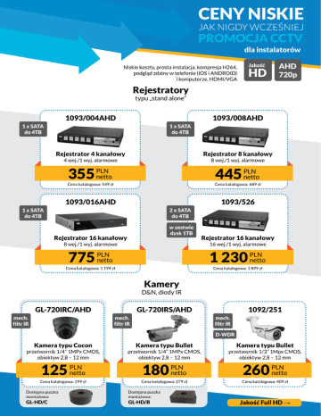 CENY NISKIE PROMOCJA CCTV dla instalatorów Niskie koszty, prosta instalacja, kompresja H264, podgląd zdalny w telefonie (iOS i ANDROID) i komputerze, HDMI/VGA Jakość HD AHD 720p Rejestratory typu „stand alone” 1093/004AHD 1093/008AHD 1 x SATA do 4TB 1 x SATA do 4TB Rejestrator 4 kanałowy Rejestrator 8 kanałowy 4 wej./1 wyj. alarmowe 8 wej./1 wyj. alarmowe 355 PLN netto 445 PLN netto Cena katalogowa: 549 zł Cena katalogowa: 689 zł 1093/016AHD 1093/526 1 x SATA do 4TB 2 x SATA do 4TB w zestwie dysk 1TB Rejestrator 16 kanałowy Rejestrator 16 kanałowy 8 wej./1 wyj. alarmowe 16 wej./1 wyj. alarmowe 775 PLN netto 1 230 PLN netto Cena katalogowa: 1 199 zł Cena katalogowa: 1 899 zł Kamery D&N, diody IR GL-720IRC/AHD mech. filtr IR GL-720IRS/AHD mech. filtr IR 1092/251 mech. filtr IR D-WDR Kamera typu Cocon Kamera typu Bullet Kamera typu Bullet przetwornik 1/4” 1MPx CMOS, obiektyw 2,8 – 12 mm przetwornik 1/4” 1MPx CMOS, obiektyw 2,8 – 12 mm przetwornik 1/3” 1Mpx CMOS, obiektyw 2,8 – 12 mm 125 PLN netto 180 PLN netto 260 PLN netto Cena katalogowa: 199 zł Cena katalogowa: 279 zł Cena katalogowa: 409 zł Dostępna puszka montażowa: Dostępna puszka montażowa: GL-HD/C GL-HD/B Jakość Full HD → Niskie koszty, prosta instalacja, kompresja H264, podgląd zdalny w telefonie (iOS i ANDROID) i komputerze, HDMI/VGA Jakość FullHD AHD 1080p Rejestratory 1 x SATA do 6TB 1093/530 2 x SATA do 16TB 1093/531 2 x SATA do 16TB 1093/532 Rejestrator 4 kanałowy Rejestrator 8 kanałowy Rejestrator 16 kanałowy 4 wej./1 wyj. alarmowe 8 wej./1 wyj. alarmowe 16 wej./1 wyj. alarmowe 385 PLN netto 700 PLN netto Cena katalogowa: 589 zł Cena katalogowa: 1 079 zł 1 300 PLN netto Cena katalogowa: 1 999 zł Kamery D&N, diody IR GL-1080IRC/AHD mech. filtr IR GL-1080IRS/AHD mech. filtr IR 1092/254H mech. filtr IR D-WDR Kamera typu Cocon Kamera typu Bullet Kamera typu Bullet przetwornik 1/2,7” 2MPx CMOS obiektyw 2,8 – 12 mm przetwornik 1/2,7” 2MPx CMOS obiektyw 2,8 – 12 mm przetwornik 1/2,7” 2Mpx CMOS obiektyw 2,8 – 12 mm 180 PLN netto 235 PLN netto 325 PLN netto Cena katalogowa: 299 zł Cena katalogowa: 389 zł Cena katalogowa: 499 zł Dostępna puszka montażowa: Dostępna puszka montażowa: GL-HD/C GL-HD/B Regulamin promocji: 1. 2. 3. 4. 5. Organizatorem promocji jest MIWI-URMET Sp. z o.o. z siedzibą w Łodzi przy ul. Pojezierskiej 90a, NIP: 726-000-02-88. Promocja kierowana jest jedynie do Instalatorów – firm zajmujących się instalacją telewizji przemysłowej. Czas trwania promocji: 18.07 – 31.08.2016 r. lub do wyczerpania zapasów magazynowych. Promocja nie łączy się z innymi promocjami ani rabatami. W razie pytań lub wątpliwości należy kontaktować się z Działem CCTV (tel.: 42 616 10 92, [email protected]) MIWI URMET Sp. z o. o. 91-341 Łódź, ul. Pojezierska 90A | tel. 42 616 10 92 | [email protected] | www.miwiurmet.pl