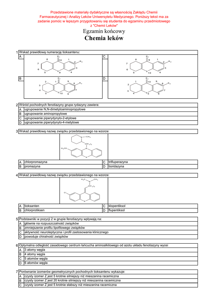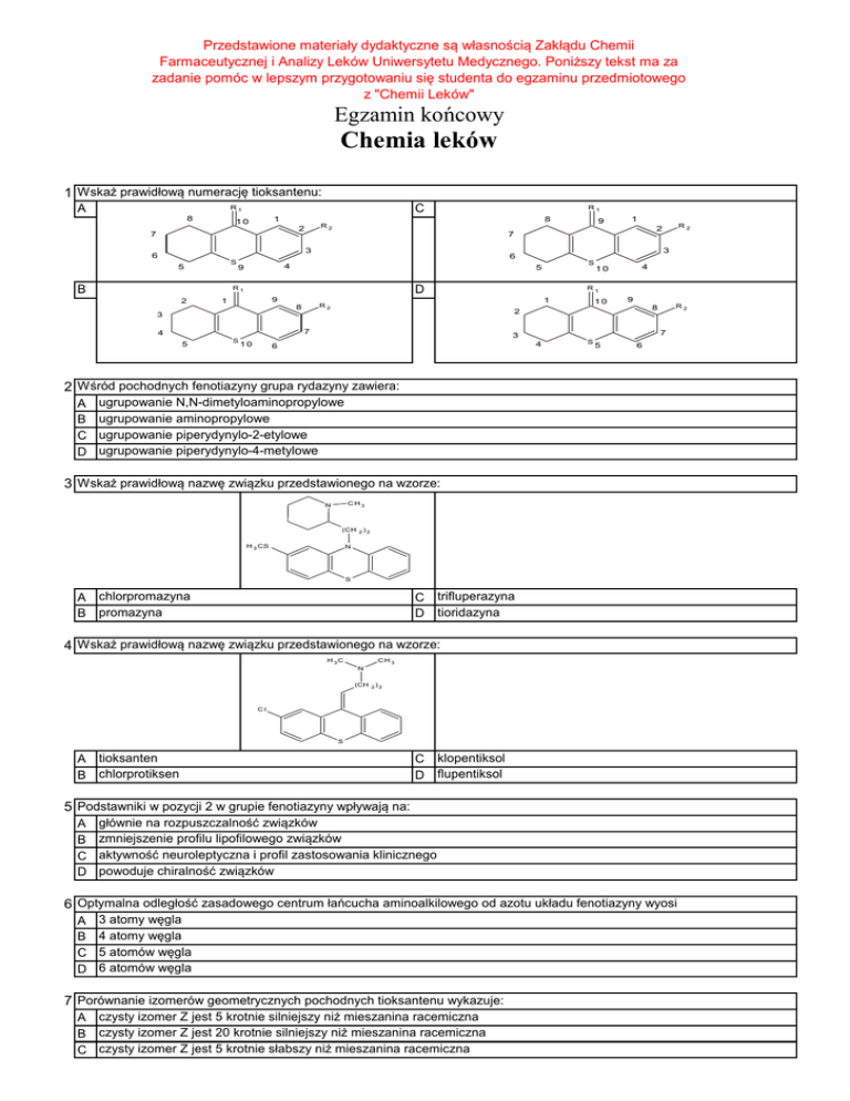 Przedstawione materiały dydaktyczne są własnością Zakłądu Chemii Farmaceutycznej i Analizy Leków Uniwersytetu Medycznego. Poniższy tekst ma za zadanie pomóc w lepszym przygotowaniu się studenta do egzaminu przedmiotowego z "Chemii Leków" Egzamin końcowy Chemia leków 1 Wskaż prawidłową numerację tioksantenu: A C R1 8 R1 8 1 10 2 7 S 5 B D 1 R2 8 10 10 9 7 3 4 6 R2 8 2 7 4 4 10 R1 9 1 S S 5 3 5 3 6 R1 2 R2 2 4 9 1 7 3 6 9 R2 S 5 6 2 Wśród pochodnych fenotiazyny grupa rydazyny zawiera: A B C D ugrupowanie N,N-dimetyloaminopropylowe ugrupowanie aminopropylowe ugrupowanie piperydynylo-2-etylowe ugrupowanie piperydynylo-4-metylowe 3 Wskaż prawidłową nazwę związku przedstawionego na wzorze: CH3 N (CH H 3 CS 2)2 N S A chlorpromazyna B promazyna C D trifluperazyna tioridazyna 4 Wskaż prawidłową nazwę związku przedstawionego na wzorze: H 3C CH3 N (CH 2)2 Cl S A tioksanten B chlorprotiksen C D klopentiksol flupentiksol 5 Podstawniki w pozycji 2 w grupie fenotiazyny wpływają na: A B C D głównie na rozpuszczalność związków zmniejszenie profilu lipofilowego związków aktywność neuroleptyczna i profil zastosowania klinicznego powoduje chiralność związków 6 Optymalna odległość zasadowego centrum łańcucha aminoalkilowego od azotu układu fenotiazyny wyosi A B C D 3 atomy węgla 4 atomy węgla 5 atomów węgla 6 atomów węgla 7 Porównanie izomerów geometrycznych pochodnych tioksantenu wykazuje: A czysty izomer Z jest 5 krotnie silniejszy niż mieszanina racemiczna B czysty izomer Z jest 20 krotnie silniejszy niż mieszanina racemiczna C czysty izomer Z jest 5 krotnie słabszy niż mieszanina racemiczna D czysty izomer Z jest 20 krotnie słabszy niż mieszanina racemiczna 8 Haloperidol należy do pochodnych: A B C D indolu tioksantenu dibenzoepiny butyrofenonu 9 Wskaż prawidłową nazwę związku przedstawionego na wzorze: O O O S NH N H 2N OCH 3 CH3 A flupentiksol B bromperidol C D sulpiryd chlorpromazyna 10 Wskaż prawidłową nazwę układu występującego w TLPD przedstawionego na wzorze: O R A dibenzo[b,f]azepina B dibenzo[b,e]oksepina C D dibenzo[a,e]tiepina dibenzo[b,e]diazepina 11 TLPD. Pochodna z II-rzędową grupą aminową wpływa: A B C D silniej na napęd psychoruchowy niż pochodna z III-rzędową grupą aminową silniej na działanie p/lękowe słabiej na działanie p/lękowe słabiej na napęd psychoruchowy niż pochodna z III-rzędową grupą aminową 12 Fluoksetyna i fluwoksamina należą do: A B C D leków p/depresyjnych anksjolityków leków nasennych neuroleptyków 13 Mechanizm selegiliny polega na A B C D wychwycie serotoniny wychwycie noradrenaliny hamowaniu receptora dopaminowego hamowaniu monoaminooksydazy 14 Wskaż prawidłową nazwę związku przedstawionego na wzorze: H 3C N CH3 O (H 2 C) 2 N N CH3 A opipramol B klomipramina C D dibenzepina imipramina 15 Obecność ugrupowania N-metyloaminowego w położeniu 2 u pochodnych 1,4-benzodiazepiny powoduje: A B C D zmniejszenie aktywności pochodnych zmianę kierunku działania zmniejszenie lipofilności możliwość otrzymywania rozpuszczalnego w wodzie chlorowodorku 16 Wskaż prawidłową numerację diazepamu: A C Cl 7 Cl 3 4 2 6 1 5 CH3 1 N 5 CH3 N 2 4 O N O N 3 6 B Cl D 7 6 Cl 5 7 6 7 5 4 1 CH3 CH3 N N 2 4 1 O N 3 N 3 2 O 17 Grupa funkcyjna przy atomie azotu ugrupowania laktamowego pochodnej 1,4-benzodiazepiny: A B C D zmienia mechanizm działania warukuje zwiększoną aktywność w porównaniu do pochodnych niepodstawionych warunkuje zmianę kierunku działania w porównaniu do pochodnych niepodstawionych odpowiedzi A i B są prawidłowe 18 Wskaż prawidłową nazwę związku przedstawionego na wzorze: Cl NH O N Cl A oksazepam B estazolam OH C D lorazepam bromazepam C D leków p/depresyjnych anksjolityków 19 Meprobamat należy do A leków uspokajających B leków nasennych 20 Wskaż wzór kofeiny: A O H 3C N O CH3 C O N HN N N O N CH3 B D O O H N N H N HN N N CH3 O H 3C CH3 N N O CH3 N N CH3 21 Zmiany w strukturze chemicznej pochodnych kwasu barbiturowego zwiększające lipofilność: A B C D przyspieszają początek działania skracają czas działania nasilają aktywność nasenną wszystkie odpowiedzi są prawidłowe 22 Wprowadzenie podstawnika nienasyconego w pochodnych kwasu barbiturowego A B C D skraca czas działania związku odpowiedzi A i C są prawidłowe zwiększa aktywność związku zmienia metabolizm związku 23 Suma atomów węgla obydwu podstawników przy C5 w pochodnych kwasu barbiturowego powinna wynosić (leki nasenne) A 2 do 5 B 3 do 6 C 5 do 9 D 6 do 10 24 Atom fluorowca w podstawniku 5-alkilowym w pochodnych kwasu barbiturowego (leki nasenne) A B C D zwiększa aktywność zmniejsza działanie nasenne zmienia kierunek działania zmniejsza aktywność 25 Zolpidem i nitrazepam należą do A leków p/nowotworowych B anksjolityków C D leków p/depresyjnych leków nasennych 26 Noradrenalina: A B C D stosuje się ją w postaci racematu stosuje się ją jako izomer R(-) stosuje się ją jako izomer R(+) stosuje się ją jako izomer S(-) 27 Nafazolina działa na receptory A B C D alfa (1) i alfa (2) adrenergiczne tylko na receptory alfa (1) adrenergiczne tylko na receptory alfa (2) adrenergiczne na receptory beta 28 Wskaż prawidłową nazwę związku przedstawionego na wzorze: HO OH NH HO H 3C A izoprenalina B orcyprenalina C D dobutamina bametan 29 Do leków sympatykomimetycznych o działaniu pośrednim należą A B C D efedryna foledryna amezyna wszystkie odpowiedzi są prawidłowe 30 Kwas lizergowy należy do A B C D alfa sympatykolityków alfa adrenolityków beta adrenolityków odpowiedzi A i B są prawidłowe 31 Wskaż lek który nie należy do beta blokerów A salbutamol B sotalol C D izoprenalina alprenolol 32 Który z poniżej przedstawionych preparatów nie jest kardioselektywny A acebutolol B pindolol C D metoprolol bisoprolol 33 Wskaż prawidłową nazwę związku przedstawionego na wzorze: OH CH3 O H 3C A atenolol O NH CH3 NH C praktolol B acebutolo