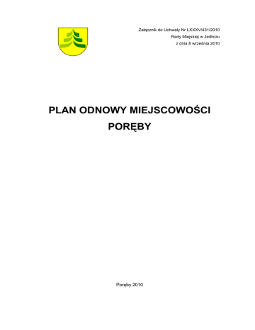Załącznik do Uchwały Nr LXXXV/431/2010 Rady Miejskiej w Jedliczu z dnia 8 września 2010 PLAN ODNOWY MIEJSCOWOŚCI PORĘBY Poręby 2010 SPIS TREŚCI ROZDZIAŁ 1. CHARAKTERYSTYKA MIEJSCOWOŚCI ....................................... 4 1.1 PołoŜenie ............................................................................................................................... 4 1. 2 Historia wsi Poręby .................................................................................................................... 5 1.3 Planowane kierunki rozwoju miejscowości Poręby................................................................. 6 ROZDZIAŁ 2. INWENTARYZACJA ZASOBÓW SŁUśĄCYCH ODNOWIE MIEJSCOWOŚCI PORĘBY .................................................................................... 7 2.1 Zasoby przyrodnicze ................................................................................................................... 7 2.2 Kapitał społeczny i ludzki ........................................................................................................... 7 Wykres 1. Liczba mieszkańców Gminy Jedlicze w latach 2007-2009 (stan na 31.12.2009) ....... 8 Tabela 1. Liczba ludności mieszkańców Gminy Jedlicze w latach 2007-2009 w podziale na miejscowości (stan na 30.11.2009) ................................................................................................. 8 2.3 Infrastruktura społeczna i techniczna ....................................................................................... 9 2.4 Gospodarka odpadami................................................................................................................ 9 2.5 Komunikacja................................................................................................................................. 9 2.6 Gospodarka i rolnictwo ............................................................................................................... 9 2.7 Kultura ........................................................................................................................................ 10 ROZDZIAŁ 3. ANALIZA SWOT ........................................................................... 11 ROZDZIAŁ 4. OPIS PLANOWANYCH ZADAŃ INWESTYCYJNYCH I PRZEDSIĘWZIĘĆ W LATACH 2010-2016 ........................................................... 13 2 WSTĘP Zmiany systemowe, które nastąpiły po 1989 roku przyniosły powrót do instytucji samorządu terytorialnego. W ten oto sposób stworzono bardziej wymagającą sytuację społeczno - gospodarczą społeczności lokalnych. W ramach przeprowadzonych reform jednostek samorządu terytorialnego, gminy i sołectwa przejęły część zadań, pozostających dotychczas w gestii organów administracji państwowej. Celem reformy było wprowadzenie samorządności na najniŜsze szczeble samorządów lokalnych. WaŜnym zadaniem jest odpowiednie zmotywowanie mieszkańców i samych instytucji do aktywności na rzecz środowiska, miasta, wsi. Przystąpienie Polski do Unii Europejskiej w maju 2004 roku wprowadziło wiele zmian dotyczących zarządzania i funkcjonowania jednostek samorządu terytorialnego. Były one potrzebne do sprawnego i efektywnego wykorzystania szansy, jaką daje członkostwo. Okres 2007-2013 to niepowtarzalna szansa zarówno dla całego kraju, jak i naszego regionu. To fundusze unijne przyczyniają się do wzrostu gospodarczego i rozwoju, dlatego naleŜy zadbać o jak najefektywniejsze ich pozyskanie i wykorzystanie. Celem działania Gminy Jedlicze, jako jednostki samorządu terytorialnego, jest realizacja zadań własnych oraz zleconych z zakresu administracji rządowej, a przez to zaspokojenie potrzeb mieszkańców. Mając w planach dalszy dynamiczny rozwój całej gminy, czyni się starania o pozyskanie dodatkowych źródeł finansowania, tak ze środków krajowych, jak i z funduszy strukturalnych. Gmina Jedlicze zaplanowała szereg przedsięwzięć, które pozwolą jej na rozwój społeczno-gospodarczy. Są wśród nich działania związane z rozwojem infrastruktury technicznej, poprawą ochrony środowiska, poprawą otoczenia kulturalnego, turystycznego, sportowego. W niniejszym opracowaniu przedstawiona zostanie charakterystyka miejscowości Poręby, jego historia oraz współczesny obraz wsi, przegląd dostępnych zasobów miejscowości, biorąc pod uwagę z jednej strony atuty i mocne strony wsi, z drugiej – wszelkie czynniki ograniczające jej rozwój. 3 Rozdział 1. CHARAKTERYSTYKA MIEJSCOWOŚCI 1.1 PołoŜenie Poręby to jedno z sołectw leŜących na terenie Gminy Jedlicze w powiecie krośnieńskim, w województwie podkarpackim. LeŜy w północnej strefie PłaskowyŜu Kobylańskiego. Na wschód od wioski ciągnie się, sięgający aŜ pod Zręcin (gm. Chorkówka), pas lasu. W okolicy górują wzniesienia 362 m npm (tuŜ nad wioską) i 385 m npm nad przysiółkiem Przylaski (administracyjnie przynaleŜny do miejscowości Zręcin). Graniczy z miejscowościami: Chlebną (pn-zach, zach), Piotrówką (pd-zach), Podniebylem (pd), Długiem (wsch), śarnowcem i Jedliczem (pn-wsch). Poręby leŜą na wysokości około 260 - 340 m npm. Miejscowość Poręby połoŜona jest około 4 km na południe od Jedlicza i 15 km od Krosna. Liczba jej mieszkańców wynosi 370 osób (stan na 31.12.2009). Całkowita powierzchnia wsi wynosi ok. 1,65 km2. Rys. 1 Obszar Gminy Jedlicze 4 Ludność Poręb ma dostęp do Domu Ludowego, remizy Ochotniczej StraŜy PoŜarnej, Świetlicy Opiekuńczo-Wychowawczej i sklepu spoŜywczo – przemysłowego. Część mieszkańców znajduje zatrudnienie w przedsiębiorstwach na terenie gminy, pozostali dojeŜdŜają głównie do zakładów pracy w Krośnie i Jaśle. 1. 2 Historia wsi Poręby Wieś Poręby, jako samodzielna jednostka administracyjna, powstała w 1947 roku. Do tego czasu wieś była przysiółkiem Długiego, stąd teŜ znaczna część historii obu miejscowości jest wspólna. Miejscowość D