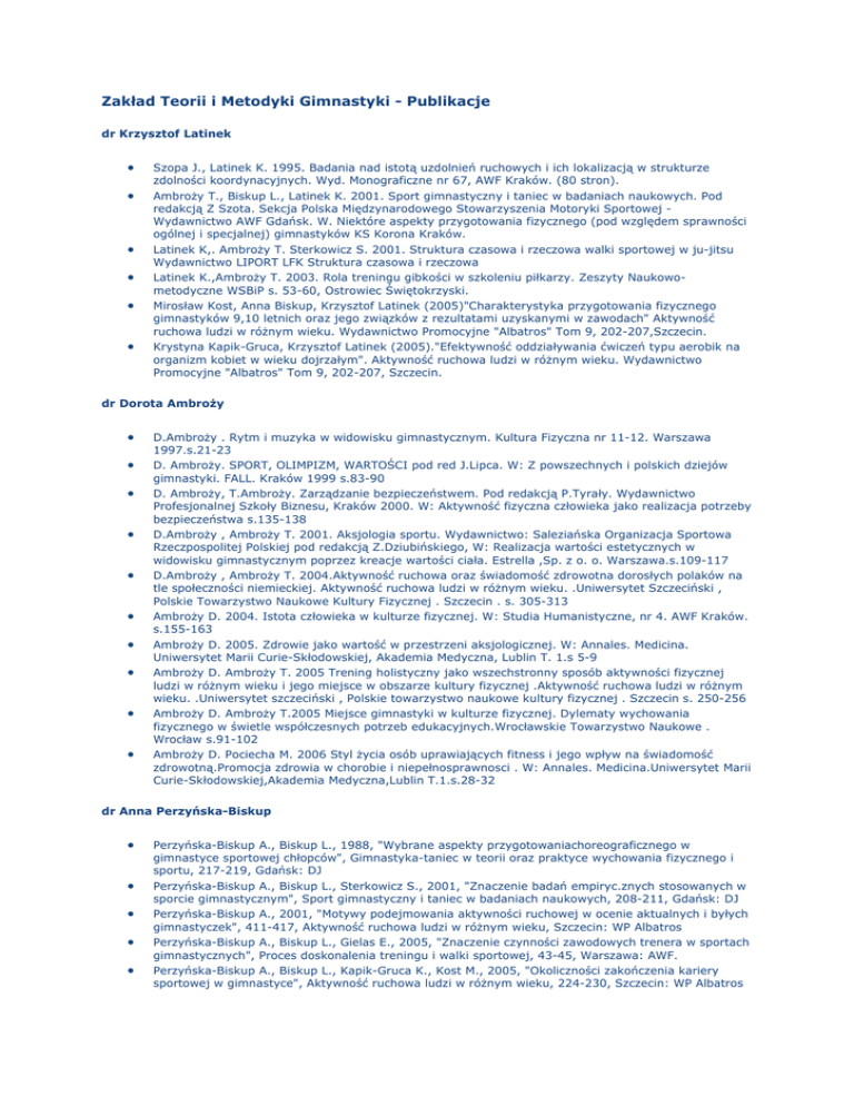 Zakład Teorii i Metodyki Gimnastyki - Publikacje dr Krzysztof Latinek • • • • • • Szopa J., Latinek K. 1995. Badania nad istotą uzdolnień ruchowych i ich lokalizacją w strukturze zdolności koordynacyjnych. Wyd. Monograficzne nr 67, AWF Kraków. (80 stron). Ambroży T., Biskup L., Latinek K. 2001. Sport gimnastyczny i taniec w badaniach naukowych. Pod redakcją Z Szota. Sekcja Polska Międzynarodowego Stowarzyszenia Motoryki Sportowej Wydawnictwo AWF Gdańsk. W. Niektóre aspekty przygotowania fizycznego (pod względem sprawności ogólnej i specjalnej) gimnastyków KS Korona Kraków. Latinek K,. Ambroży T. Sterkowicz S. 2001. Struktura czasowa i rzeczowa walki sportowej w ju-jitsu Wydawnictwo LIPORT LFK Struktura czasowa i rzeczowa Latinek K.,Ambroży T. 2003. Rola treningu gibkości w szkoleniu piłkarzy. Zeszyty Naukowometodyczne WSBiP s. 53-60, Ostrowiec Świętokrzyski. Mirosław Kost, Anna Biskup, Krzysztof Latinek (2005)"Charakterystyka przygotowania fizycznego gimnastyków 9,10 letnich oraz jego związków z rezultatami uzyskanymi w zawodach" Aktywność ruchowa ludzi w różnym wieku. Wydawnictwo Promocyjne "Albatros" Tom 9, 202-207,Szczecin. Krystyna Kapik-Gruca, Krzysztof Latinek (2005)."Efektywność oddziaływania ćwiczeń typu aerobik na organizm kobiet w wieku dojrzałym". Aktywność ruchowa ludzi w różnym wieku. Wydawnictwo Promocyjne "Albatros" Tom 9, 202-207, Szczecin. dr Dorota Ambroży • • • • • • • • • • D.Ambroży . Rytm i muzyka w widowisku gimnastycznym. Kultura Fizyczna nr 11-12. Warszawa 1997.s.21-23 D. Ambroży. SPORT, OLIMPIZM, WARTOŚCI pod red J.Lipca. W: Z powszechnych i polskich dziejów gimnastyki. FALL. Kraków 1999 s.83-90 D. Ambroży, T.Ambroży. Zarządzanie bezpieczeństwem. Pod redakcją P.Tyrały. Wydawnictwo Profesjonalnej Szkoły Biznesu, Kraków 2000. W: Aktywność fizyczna człowieka jako realizacja potrzeby bezpieczeństwa s.135-138 D.Ambroży , Ambroży T. 2001. Aksjologia sportu. Wydawnictwo: Saleziańska Organizacja Sportowa Rzeczpospolitej Polskiej pod redakcją Z.Dziubińskiego, W: Realizacja wartości estetycznych w widowisku gimnastycznym poprzez kreacje wartości ciała. Estrella ,Sp. z o. o. Warszawa.s.109-117 D.Ambroży , Ambroży T. 2004.Aktywność ruchowa oraz świadomość zdrowotna dorosłych polaków na tle społeczności niemieckiej. Aktywność ruchowa ludzi w różnym wieku. .Uniwersytet Szczeciński , Polskie Towarzystwo Naukowe Kultury Fizycznej . Szczecin . s. 305-313 Ambroży D. 2004. Istota człowieka w kulturze fizycznej. W: Studia Humanistyczne, nr 4. AWF Kraków. s.155-163 Ambroży D. 2005. Zdrowie jako wartość w przestrzeni aksjologicznej. W: Annales. Medicina. Uniwersytet Marii Curie-Skłodowskiej, Akademia Medyczna, Lublin T. 1.s 5-9 Ambroży D. Ambroży T. 2005 Trening holistyczny jako wszechstronny sposób aktywności fizycznej ludzi w różnym wieku i jego miejsce w obszarze kultury fizycznej .Aktywność ruchowa ludzi w różnym wieku. .Uniwersytet szczeciński , Polskie towarzystwo naukowe kultury fizycznej . Szczecin s. 250-256 Ambroży D. Ambroży T.2005 Miejsce gimnastyki w kulturze fizycznej. Dylematy wychowania fizycznego w świetle współczesnych potrzeb edukacyjnych.Wrocławskie Towarzystwo Naukowe . Wrocław s.91-102 Ambroży D. Pociecha M. 2006 Styl życia osób uprawiających fitness i jego wpływ na świadomość zdrowotną.Promocja zdrowia w chorobie i niepełnosprawnosci . W: Annales. Medicina.Uniwersytet Marii Curie-Skłodowskiej,Akademia Medyczna,Lublin T.1.s.28-32 dr Anna Perzyńska-Biskup • • • • • Perzyńska-Biskup A., Biskup L., 1988, "Wybrane aspekty przygotowaniachoreograficznego w gimnastyce sportowej chłopców", Gimnastyka-taniec w teorii oraz praktyce wychowania fizycznego i sportu, 217-219, Gdańsk: DJ Perzyńska-Biskup A., Biskup L., Sterkowicz S., 2001, "Znaczenie badań empiryc.znych stosowanych w sporcie gimnastycznym", Sport gimnastyczny i taniec w badaniach naukowych, 208-211, Gdańsk: DJ Perzyńska-Biskup A., 2001, "Motywy podejmowania aktywności ruchowej w ocenie aktualnych i byłych gimnastyczek", 411-417, Aktywność ruchowa ludzi w różnym wieku, Szczecin: WP Albatros Perzyńska-Biskup A., Biskup L., Gielas E., 2005, "Znaczenie czynności zawodowych trenera w sportach gimnastycznych", Proces doskonalenia treningu i walki sportowej, 43-45, Warszawa: AWF. Perzyńska-Biskup A., Biskup L., Kapik-Gruca K., Kost M., 2005, "Okoliczności zakończenia kariery sportowej w gimnastyce", Aktywność ruchowa ludzi w różnym wieku, 224-230, Szczecin: WP Albatros • • • • Perzyńska-Biskup A., Biskup L., Kost M., 2005, "Wartość zdrowia w hierarchii pozostałych wartości życiowych, realizowanych w kobiecym środowisku gimnastycznym", 300-3003, Annales Sektio D Medicina, Vol. LX, SUPPL. XVI, N4, Lublin: wyd. Uniwersytetu Marii Curie-Skłodowskiej Perzyńska-Biskup A, Biskup L., Matusik S., 2005, "Przyczyny odchodzenia kobiet od sportu", 304-307, Annales Sektio D Medicina, Vol. LX, SUPPL. XVI, N4, Lublin: wyd. Uniwersytetu Marii CurieSkłodowskiej Perzyńska - Biskup A, Biskup L., 2006, "Czynniki inspirujące do podejmowania wyczynowej aktywności sportowej, w opinii zawodniczek gimnastyki", 48-50 Annales Sektio D Medicina, Vol. LX, SUPPL. XVI, N6, Lublin: wyd. Uniwersytetu Marii Curie-Skłodowskiej Perzyńska - Biskup A, Biskup L., Kapik - Gruca K, 2006, "Obciążenia treningowe w sporcie gimnastycznym", 44-47 Annales Sektio D Medicina, Vol. LX, SUPPL. XVI, N6, Lublin: wyd. Uniwersytetu Marii Curie-Skłodowskiej mgr Dorota Lipka-Nowak • • • • • • • • • D.Lipka Nowak, D.Studnicka, Aktywność ruchowa jako metoda utrzymywania zdrowia i kondycji fizycznej kobiet dojrzałych, Wydawnictwo Monograficzne Tom 7 "Aktywność ruchowa ludzi w rożnym wieku", Szczecin 2002, s. 64-70 D.Lipka Nowak, D. Dudek, 2005, Styl życia i uwarunkowania zachowań zdrowotnych studentów, Annales Medicina Sectio D "Promocja zdrowi