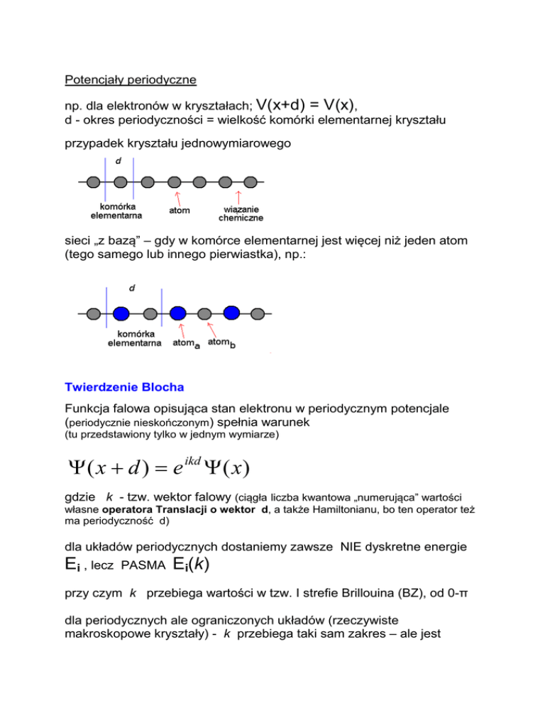 Potencjały periodyczne np. dla elektronów w kryształach; V(x+d) = V(x), d - okres periodyczności = wielkość komórki elementarnej kryształu przypadek kryształu jednowymiarowego sieci „z bazą” – gdy w komórce elementarnej jest więcej niż jeden atom (tego samego lub innego pierwiastka), np.: Twierdzenie Blocha Funkcja falowa opisująca stan elektronu w periodycznym potencjale (periodycznie nieskończonym) spełnia warunek (tu przedstawiony tylko w jednym wymiarze) Ψ ( x + d ) = e ikd Ψ ( x) gdzie k - tzw. wektor falowy (ciągła liczba kwantowa „numerująca” wartości własne operatora Translacji o wektor d, a także Hamiltonianu, bo ten operator też ma periodyczność d) dla układów periodycznych dostaniemy zawsze NIE dyskretne energie Ei , lecz PASMA Ei(k) przy czym k przebiega wartości w tzw. I strefie Brillouina (BZ), od 0-π dla periodycznych ale ograniczonych układów (rzeczywiste makroskopowe kryształy) - k przebiega taki sam zakres – ale jest dyskretne – tyle różnych wartości k ile komórek elementarnych w krysztale – czyli dla makroskopowego kawałka kryształu – bardzo dużo; k – numeruje stany elektronowe w ramach pasm te stany obsadzamy elektronami z powłok walencyjnych atomów tworzących kryształ numeracja PASM wynika z kwantowej numeracji stanów H dla danej komórki elementarnej metale, półprzewodniki, izolatory np.: w 1D: 1 atom w komórce elementarnej, n elektronów w atomie => przy N komórkach n*N elektronów, w pasmie mamy 2*N /spin/ stanów o różnych wart. k n*N elektronami obsadzamy kolejne stany w kolejnych pasmach • • parzysta liczba elektronów => półprzewodnik / izolator nieparzysta => metal ( w 2D lub 3D niekoniecznie ) • metale, izolatory, półprzewodniki - poziom Fermiego: w metalu: najwyższy energetycznie stan obsadzony w T=0K w półprzewodniku – różnie; Co to znaczy metal - przewodnik ? Do przewodzenia prądu potrzebne są swobodne elektrony. Swobodne to takie, które pod wpływem pola elektrycznego mogą być przyspieszane, tzn. ich energia może sukcesywnie przyrastać o dowolnie małą wartość. A to oznacza, że powyżej poziomu Fermiego musi istnieć continuum nieobsadzonych stanów. Przestrzenie modelowe. Zamiast rozwiązywać równanie różniczkowe (1) można przybliżyć funkcję falową w skończonej bazie funkcji (np. wzajemnie ortogonalnych i unormowanych - ortonormalnych) N Ψ = ∑ ciϕi i =1 I przybliżyć poszukiwaną energię układu jako E =< ψ | H | ψ > W bazie funkcji (3) φ , < ψ | H |ψ > HΨ (x) = EΨ (x) H a zagadnienie macierzy hamiltonianu (2) przyjmuje postać MACIERZY postać zagadnienia własnego dla H ij =< ϕ i | H | ϕ j > c1 H11 ... H1n c1 ... ... ... ... = E ... cn H n1 ... H nn cn rozwiązanie polega na ZDIAGONALIZOWANIU macierzy H otrzymujemy N rozwiązań degeneracja) Ei (niektóre mogą się powtarzać – dla układów periodycznych Hij - zależą od k , zatem Ei = Ei(k) Atomy, molekuły Atom wodoru - Energia potencjalna elektronu e w polu dodatnio naładowanego jądra V = V(x,y,z)=V(r) Ze 2 Z V (r ) = − w j.at. = − , Z - liczba protonów w jądrze 4πε 0 r r – zależy tylko od odległości elektronu od jądra r schematycznie V(r) wygląda tak: Ze 2 1 En = − 2a 0 n 2 , h2 ≈ 50 pm a0 = me 2 E0 – ok. -13.6 eV Ale, hamiltonian atomu wodoru komutuje z operatorem dowolnych obrotów wokół osi przechodzącej przez jądro atomu wodoru stany własne (poziomy energetyczne) są więc numerowane przez „n” – tzw. główną liczbę kwantową, ale dodatkowo też przez tzw. orbitalną liczbę kwantową „l” , która opisuje zachowanie (własności) kolejnych funkcji falowych przy obrotach dla danego n jej wartości są l = 0 – (n-1) i odpowiednio są nazywane 0 – s, 1 – p, 2 – d, …. Funkcje falowe stanów numerowane są ostatecznie 3-ma indeksami n, l, m energie w atomie wodoru zależą tylko od n a w innych atomach od n i l , En,l w sferycznym układzie współrzędnych Funkcje daje się rozseparować na część radialną i kątową ψ(x,y,z) = ψ(r, Θ, ϕ) = Rn(r) Yl,m(Θ,ϕ) = ψn,l,m Kolejne funkcje radialne znów przypominają „fale” a części kątowe pozwalają łatwo wyjaśniać tworzenie się wiązań chemicznych poprzez budowę tzw. orbitali hybrydyzowanych Atomy wieloelektronowe Tu energie zależą od n i od l 1s, 2s, 2p, 3s, 3p, 3d, ….. dla wyższych n odstępstwa spowodowane oddziaływaniem miedzy elektronami Orbitale zhybrydyzowane Gdy energie orbitali nl i nl’ są porównywalne lub takie same (tylko w wodorze) to można tworzyć kombinacje liniowe takich orbitali (związane jest to z faktem, że funkcje do zdegenerowanych energii tworzą bazy podprzestrzeni) np. Φs = ns + np oraz Φs = ns - np (tzw. hybrydyzacja sp) wyjaśniają trwałość wiązania np. w molekule F2 (1s22s22p5) co to znaczy trwałość wiązania? F F nakładające się orbitale tworzą orbital molekularny, tzw. wiążący, w którym gęstość ładunku elektronowego pomiędzy jądrami jest największa – dzięki czemu „klasycznie” utrzymuje” dodatnio naładowane jądra (czyli odpychające się) w stałej, ale „wiążącej” odległości hybrydyzacja sp2 wiązanie i trwałość molekuły C2H4 C: 1s22s22p2 , H: 1S 2s i 2p bardzo bliskie energie z: 2s + 2px + 2py tworzymy w węglu 3 nowe orbitale zhybrydyzowane φ1 = 1 3 (s + 2 px ) φ2 = 1 6 ( 2s − px + 3 p y ) φ3 = 1 6 ( 2s + px − 3 p y ) φ4 = p z Pz - prostopadły do płaszcyzny przed utworzeniem wiązań po utworzeniu wiązań – orbitali molekularnych pomiędzy atomami (w rzeczywistości jednak hybrydyzacja jest typu sp3 i dwa orbitale zhybrydyzowane tworzą podwójne wiązanie pomiędzy węglami) podobnie w benzenie C6H6 wiązanie i trwałość grafitu (grafenu) - C – 1s22s22p2 walencyjne elektrony - 2s22p2 sp2 – po jednym elektronie walencyjnym z każdego atomu – orbital molekularny utworzony z dwóch orbitali zhybrydyzowanych sp2 sąsiednich atomów – wiązanie 