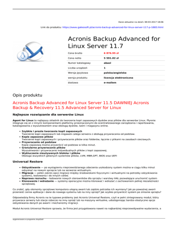 Dane aktualne na dzień: 08-03-2017 18:06 Link do produktu: https://www.galeosoft.pl/acronis-backup-advanced-for-linux-server-117-p-1883.html Acronis Backup Advanced for Linux Server 11.7 Cena brutto 6 876.95 zł Cena netto 5 591.02 zł Numer katalogowy abasl Liczba urządzeń 1 Wersja językowa polska/angielska wersja produktu licencja elektroniczna dostawa e-mailem Opis produktu Acronis Backup Advanced for Linux Server 11.5 DAWNIEJ Acronis Backup & Recovery 11.5 Advanced Server for Linux Najlepsze rozwiązanie dla serwerów Linux Agent for Linux to najlepszy składnik do tworzenia kopii zapasowych dysków oraz plików dla serwerów Linux. Płynnie integruje się on z innymi komponentami platformy przeznaczonymi do scentralizowanego zarządzania i raportowania, katalogowania z wyszukiwaniem oraz obsługą dysków, taśm i magazynu online. Szybkie i proste tworzenie kopii zapasowych Tworzenie kopii zapasowych lub migawek całego serwera z obsługą przywracania od podstaw. Kopie zapasowe plików Tworzenie kopii zapasowych i przywracanie plików oraz folderów, łącznie z plikami na zasobach sieciowych. Przywracanie od podstaw Kopię zapasową można przywrócić od podstaw w kilka minut. Granularne przywracanie plików Wyszukiwanie i przywracanie indywidualnych plików z kopii zapasowej. Wykluczanie nieużywanych bloków i plików Obsługa wszystkich głównych systemów plików, LVM, MBR,GPT, BIOS oraz UEFI Universal Restore Odzyskiwanie — po wystąpieniu nieprzewidzianego zdarzenia uszkodzony system można w ciągu kilku minut odzyskać na nowym sprzęcie lub na serwerze wirtualnym. Migracja — pełen zakres opcji migracji między środowiskami fizycznymi i wirtualnymi na potrzeby odzyskiwania systemu, testowania i do innych celów. Naprawa rozruchu – ładowanie nowych sterowników dla sprzętu i warstwy HAL pozwalające uruchomić system Klonowanie i wdrażanie — systemy operacyjne można klonować i wdrażać z zachowaniem pełnej niezależności sprzętowej. Co zrobić, gdy elementy sprzętowe komputera ulegną awarii lub zajdzie potrzeba ich wymiany? Jak po poważnej awarii przenieść cenne aplikacje i dane do nowego systemu lub na inny sprzęt? Jak szybko przywrócić system po zmianie sprzętu? Odpowiedzią firmy Acronis na te typowe problemy jest Acronis Universal Restore, czyli w pełni zintegrowany moduł, który przywraca serwery lub stacje robocze na inny sprzęt lub na maszyny wirtualne, udostępniając bardzo elastyczne opcje odzyskiwania danych po awarii i mechanizmy migracji. Moduł Acronis Universal Restore sprawia, że firma jest przygotowana nawet na najbardziej nieprzewidywalne wydarzenia, a wygenerowano w programie shopGold jednocześnie nie musi kupować ani utrzymywać identycznych komputerów zapasowych. Cały proces zaczyna się w chwili, gdy za pomocą programu Acronis Backup & Recovery tworzony jest specjalny obraz, w którym dane nie są już powiązane z wyposażeniem sprzętowym pierwotnego komputera. Moduł Acronis Universal Restore wczytuje do obrazu sterowniki nowego sprzętu, tak aby obraz pochodzący z wcześniejszej platformy sprzętowej umożliwił bezproblemowe przywrócenie komputera na nowej platformie: wraz z systemem operacyjnym, aplikacjami, danymi i wszystkimi poprzednimi ustawieniami. Procedurę odzyskiwania można wykonać w ciągu kilku minut w istniejącym systemie, w nowym systemie z innym sprzętem lub na serwerze wirtualnym. W tym celu należy: Uruchomić nowy system za pomocą utworzonego nośnika startowego programu Acronis Backup & Recovery 11.5 i z menu wybrać opcję odzyskiwania. Wybrać obraz do przywrócenia. Moduł Acronis Universal Restore rozpocznie proces przywracania, wykryje sprzęt i zainstaluje odpowiednie sterowniki dla warstwy abstrakcji sprzętowej (HAL). W wyniku tych czynności na nowej platformie sprzętowej powstanie idealnie funkcjonujący system. Deduplikacja Opcjonalny moduł Acronis Backup & Recovery® 11.5 Deduplication zawiera przystępne cenowo programowe funkcje deduplikacji na poziomie plików i bloków, przeznaczone dla stacji roboczych i serwerów. Dzięki temu umożliwia przedsiębiorstwom różnej wielkości maksymalne wykorzystanie infrastruktury pamięci masowej, a przez to ograniczenie kosztów i zwiększenie pojemności. Opcjonalny moduł firmy Acronis do deduplikacji pozwala zmniejszyć ilość miejsca wymaganego na magazynowanie danych o 90% lub więcej, ponieważ eliminuje repliki identycznych plików lub bloków w lokalizacji źródłowej lub docelowej. Jeśli w węźle magazynowania istnieją już określone dane, tworzony jest tylko link wiążący je z klientem kopii zapasowej. Moduł Acronis Backup & Recovery 11.5 Deduplication współpracuje z każdym produktem Acronis Backup & Recovery 11.5 Advanced Platform. Oszczędność zasobów i niższe koszty Moduł Acronis Backup & Recovery 11.5 Deduplication umożliwia przedsiębiorstwom różnej wielkości optymalne wykorzystanie pamięci masowej podczas tworzenia kopii zapasowych i odzyskiwania danych. Narzędzie to pozwala administratorom IT obniżyć koszty na cztery sposoby: Cena zależna od liczby komputerów, a nie od pojemności pamięci masowej czy liczby procesorów Zmniejszenie ilości miejsca na dysku potrzebnego do przechowywania kopii zapasowych Wzrost liczby kopii zapasowych możliwych do zapisania w istniejących magazynach danych Zwolnienie pasma sieciowego przeznaczonego na transmisję danych i poprawa szybkości transferu Główne korzyści Niższe ogólne koszty pamięci masowej Eliminując nadmiarowe kopie zapasowe, można przechowywać mniej danych oraz zaoszczędzić miejsce w pamięci masowej i zmniejszyć koszty operacyjne Bardziej „ekologiczna" działalność IT Deduplikacja danych jest korzystniejsza dla środowiska, ponieważ zmniejsza zużycie energii elektrycznej i ilość sprzętu wymaganego do tworzenia kopii zapasowych w środowisku IT. Szybsze odzyskiwanie Ścisła integracja z produktami Acronis Back