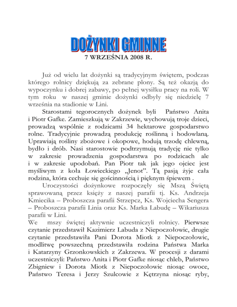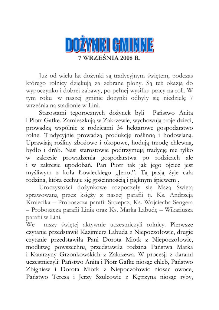 7 WRZEŚNIA 2008 R. JuŜ od wielu lat doŜynki są tradycyjnym świętem, podczas którego rolnicy dziękują za zebrane plony. Są teŜ okazją do wypoczynku i dobrej zabawy, po pełnej wysiłku pracy na roli. W tym roku w naszej gminie doŜynki odbyły się niedzielę 7 września na stadionie w Lini. Starostami tegorocznych doŜynek byli Państwo Anita i Piotr Gafke. Zamieszkują w Zakrzewie, wychowują troje dzieci, prowadzą wspólnie z rodzicami 34 hektarowe gospodarstwo rolne. Tradycyjnie prowadzą produkcję roślinną i hodowlaną. Uprawiają rośliny zboŜowe i okopowe, hodują trzodę chlewną, bydło i drób. Nasi starostowie podtrzymują tradycję nie tylko w zakresie prowadzenia gospodarstwa po rodzicach ale i w zakresie upodobań. Pan Piotr tak jak jego ojciec jest myśliwym z koła Łowieckiego „Jenot”. Tą pasją Ŝyje cała rodzina, która cechuje się gościnnością i pięknym śpiewem . Uroczystości doŜynkowe rozpoczęły się Mszą Świętą sprawowaną przez księŜy z naszej parafii tj. Ks. Andrzeja Kmiecika – Proboszcza parafii Strzepcz, Ks. Wojciecha Sengera – Proboszcza parafii Linia oraz Ks. Marka Labudę – Wikariusza parafii w Lini. We mszy świętej aktywnie uczestniczyli rolnicy. Pierwsze czytanie przedstawił Kazimierz Labuda z Niepoczołowic, drugie czytanie przedstawiła Pani Dorota Miotk z Niepoczołowic, modlitwę powszechną przedstawiła rodzina Państwa Marka i Katarzyny Grzonkowskich z Zakrzewa. W procesji z darami uczestniczyli: Państwo Anita i Piotr Gafke niosąc chleb, Państwo Zbigniew i Dorota Miotk z Niepoczołowic niosąc owoce, Państwo Teresa i Jerzy Szulcowie z Kętrzyna niosąc ryby, Państwo Joanna i Robert Kostrzewa wraz z córką reprezentując gminne koło pszczelarzy nieśli świecę z wosku pszczelego, miód i wino. Dzieci z Zespołu Kaszëbskô Rozëzna ofiarowały kwiaty. W czasie mszy świętej zostały pobłogosławione wieńce doŜynkowe i chleb. Chór „Pięciolinia” z Lini uświetnił tę uroczystość pięknym śpiewem. Po mszy świętej starostowie doŜynek przekazali Gospodarzowi gminy – Wójtowi Łukaszowi Jabłońskiemu oraz Przewodniczącemu Rady Gminy Linia Stanisławowi Bigusowi symboliczny i pobłogosławiony chleb doŜynkowy słowami: „ Gospodarzu naszej Gminy przekazujemy Ci ten pachnący bochen chleba, upieczony z tegorocznego ziarna, które wzrastało i dojrzewało na naszej ukochanej kaszubskiej ziemi. Prosimy Cię dziel go mądrze i sprawiedliwie aby nie zabrakło go na Ŝadnym stole.” Następnie słowa do rolników i zgromadzonych gości skierował Wójt Gminy Pan Łukasz Jabłoński. W swoim wystąpieniu Wójt Gminy podziękował serdecznie rolnikom za ogromny trud i wysiłek przy trudnych w bieŜącym roku Ŝniwach. śyczył rolnikom i wszystkim gościom zdrowia i sukcesów. Chleb upieczony z tegorocznej mąki, który Wójt otrzymał, został sprawiedliwie podzielony i rozdany wśród tak licznie przybyłych gości i uczestników doŜynek. Z duŜą wprawą w dzieleniu pomagali Przewodniczący Rady, starostowie doŜynek i ich asystenci. Nieodłącznym atrybutem doŜynek są wieńce, które zostały przygotowane przez sołectwa: Kętrzyno, Zakrzewo, SmaŜyno, Strzepcz, Linia i Tłuczewo. Wykonane z duŜą starannością i pomysłem wieńce doŜynkowe, oceniła komisja konkursowa w składzie: 1. 2. 3. 4. Łukasz Jabłoński – Wójt Gminy Linia Mirosława Kuberna – Radna Powiatu Wejherowo Stanisław Bigus – Przewodniczący Rady Gminy Linia Państwo Anita i Piotr Gafke - Starostowie DoŜynek Komisja miała niezwykle trudne zadanie, bowiem wszystkie wieńce prezentowały się niezwykle okazale. W ocenie komisji konkursowej najpiękniejszym, najbogatszym w elementach konstrukcyjnych i wystroju był wieniec z Kętrzyna, II miejsce – Linia, III miejsce Tłuczewo. W nagrodę Wójt wręczył przedstawicielom sołectw nagrody pienięŜne; za pierwsze miejsce kwotę 500 zł, za drugie 400 zł i za trzecie 300 zł. Pozostałe sołectwa otrzymały takŜe nagrody za udział w konkursie w wysokości 200 zł na sołectwo. Wójt Gminy wraz z Przewodniczącym Rady Gminy ogłosili wyniki corocznego konkursu na najpiękniejszą wieś Gminy Linia. W tym roku I miejsce zdobyło Zakrzewo, II miejsce – Strzepcz, III miejsce – Linia. Komisja zwróciła szczególną uwagę na zaangaŜowanie mieszkańców w upiększaniu swojej wsi. Nagrody finansowe zostaną ujęte w przyszłorocznym budŜecie i przeznaczone na estetyzację wsi. Dla uczestników DoŜynek przygotowano program artystyczny, w którym wystąpiły: Kabaret „Labud” z Tłuczewa, Grupa LIGO Zespół OCTAVA Zespół KUBRYK Andrzej Rybiński – Gwiazda Wieczoru. Oprócz występów artystycznych organizatorzy przygotowali bardzo duŜo konkursów dla róŜnych grup wiekowych. Nie zawiodły teŜ stoiska sołeckie, które cechuje prawdziwy kunszt kucharski, cukierniczy i rękodzielniczy. Na stoiskach prezentowały się Koło Gospodyń Wiejskich ze Strzepcza, Sołectwo Kobylasz – Potęgowo oraz Pan Józef Janca z miodem. Oblegane teŜ było stoisko Stowarzyszenia „Bądźmy Razem”, które przygotowało loterię fantową – zbierając na realizację celów statutowych, głównie pomoc dla dzieci niepełnosprawnych. Organizatorzy obawiając się deszczowej pogody zadbali o rozstawienie namiotów, ławek i stołów. Przepięknie prezentowało się wesołe miasteczko, szczególnie w porze wieczornej, a bawili się tam świetnie nie tylko najmłodsi. Szczególne podziękowania kierujemy do straŜaków, którzy jak zwykle stanęli na wysokości zadania, pilnowali porządku, kierowali ruchem, wskazywali miejsca parkingowe. Bez ich zaangaŜowania i poświecenia wolnego czasu organizacja tych doŜynek nie mogłaby przebiegać bez zakłóceń. Dziękujemy teŜ Wam drodzy mieszkańcy i rolnicy, Ŝe przyjęliście nasze zaproszenie i mogliśmy tak licznie wspólnie obchodzić tegoroczne „Święto Plonów”. Zapraszamy za rok! Zapraszamy do galerii z
