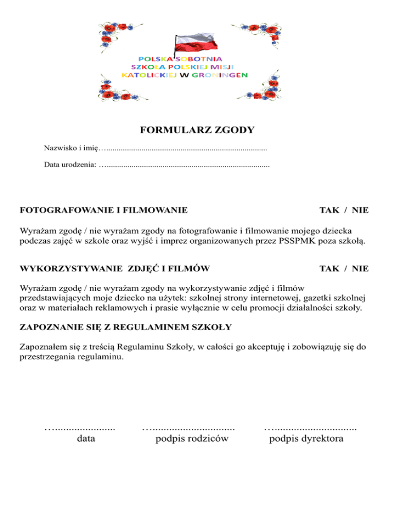 FORMULARZ ZGODY Nazwisko i imię….............................................................................. Data urodzenia: …............................................................................... FOTOGRAFOWANIE I FILMOWANIE TAK / NIE Wyrażam zgodę / nie wyrażam zgody na fotografowanie i filmowanie mojego dziecka podczas zajęć w szkole oraz wyjść i imprez organizowanych przez PSSPMK poza szkołą. WYKORZYSTYWANIE ZDJĘĆ I FILMÓW TAK / NIE Wyrażam zgodę / nie wyrażam zgody na wykorzystywanie zdjęć i filmów przedstawiających moje dziecko na użytek: szkolnej strony internetowej, gazetki szkolnej oraz w materiałach reklamowych i prasie wyłącznie w celu promocji działalności szkoły. ZAPOZNANIE SIĘ Z REGULAMINEM SZKOŁY Zapoznałem się z treścią Regulaminu Szkoły, w całości go akceptuję i zobowiązuję się do przestrzegania regulaminu. …...................... data ….............................. podpis rodziców ….............................. podpis dyrektora