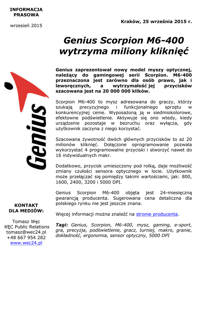 INFORMACJA PRASOWA wrzesień 2015 Kraków, 25 września 2015 r. Genius Scorpion M6-400 wytrzyma miliony kliknięć Genius zaprezentował nowy model myszy optycznej, należący do gamingowej serii Scorpion. M6-400 przeznaczona jest zarówno dla osób prawo, jak i leworęcznych, a wytrzymałość jej przycisków szacowana jest na 20 000 000 klików. Scorpion M6-400 to mysz adresowana do graczy, którzy szukają precyzyjnego i funkcjonalnego sprzętu w konkurencyjnej cenie. Wyposażoną ją w siedmiokolorowe, efektowne podświetlenie. Aktywuje się ono wtedy, kiedy urządzenie pozostaje w bezruchu oraz wyłącza, gdy użytkownik zaczyna z niego korzystać. Szacowana żywotność dwóch głównych przycisków to aż 20 milionów kliknięć. Dołączone oprogramowanie pozwala wykorzystać 4 programowalne przyciski i stworzyć nawet do 16 indywidualnych makr. Dodatkowo, przycisk umieszczony pod rolką, daje możliwość zmiany czułości sensora optycznego w locie. Użytkownik może przełączać się pomiędzy takimi wartościami, jak: 800, 1600, 2400, 3200 i 5000 DPI. KONTAKT DLA MEDIÓW: Tomasz Węc WĘC Public Relations [email protected] +48 667 954 282 www.wec24.pl Genius Scorpion M6-400 objęta jest 24-miesięczną gwarancją producenta. Sugerowana cena detaliczna dla polskiego rynku nie jest jeszcze znana. Więcej informacji można znaleźć na stronie producenta. Tagi: Genius, Scorpion, M6-400, mysz, gaming, e-sport, gra, precyzja, podświetlenie, gracz, turniej, makro, granie, dokładność, ergonomia, sensor optyczny, 5000 DPI INFORMACJA PRASOWA wrzesień 2015 O marce Genius Genius to przede wszystkim wysokiej jakości akcesoria komputerowe i urządzenia cyfrowe. Oferta firmy zawiera zarówno typowe produkty przeznaczone do użytku domowego (głośniki, klawiatury, myszy), jak i wyroby dedykowane (akcesoria dla graczy). Produkty sygnowane marką Genius cieszą się nienaganną opinią wśród użytkowników, głównie ze względu na doskonałą jakość, przy zachowaniu konkurencyjnych cen. Więcej informacji na stronie: global.geniusnet.com KONTAKT DLA MEDIÓW: Tomasz Węc WĘC Public Relations [email protected] +48 667 954 282 www.wec24.pl