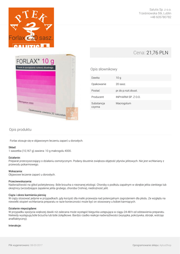 Salutis Sp. z o.o. Trześniowska 59i, Lublin +48 605780782 Forlax x 20 sasz. Cena: 21,76 PLN Opis słownikowy Dawka 10 g Opakowanie 20 sasz. Postać pr.do p.rozt.doust. Producent INPHARM SP. Z O.O. Substancja czynna Macrogolum Opis produktu Forlax stosuje się w objawowym leczeniu zaparć u dorosłych. Skład: 1 saszetka (10,167 g) zawiera: 10 g makrogolu 4000. Działanie: Preparat przeczyszczający o działaniu osmotycznym. Podany doustnie zwiększa objętość płynów jelitowych. Nie jest wchłaniany z przewodu pokarmowego. Wskazania: Objawowe leczenie zaparć u dorosłych. Przeciwwskazania: Nadwrażliwość na glikol polietylenowy. Bóle brzucha o nieznanej etiologii. Choroby o podłożu zapalnym w obrębie jelita cienkiego lub okrężnicy (wrzodziejące zapalenie jelita grubego, choroba Crohna), niedrożność jelit. Ciąża i okres karmienia piersią: W ciąży stosować jedynie w przypadkach, gdy korzyść dla matki przeważa nad potencjalnym zagrożeniem dla płodu. Ze względu na niewielki stopień wchłaniania preparatu w razie konieczności może być on stosowany u kobiet karmiących. Działanie niepożądane: W przypadku spożycia większej dawki niż zalecana może wystąpić biegunka ustępująca w ciągu 24-48 h od odstawienia preparatu. Niekiedy występują bóle brzucha lub bóle żołądkowe. Bardzo rzadko reakcje nadwrażliwości (wysypka, pokrzywka, obrzęk, wstrząs anafilaktyczny). Interakcje: Plik wygenerowano: 08-03-2017 Oprogramowanie sklepu: AptusShop Salutis Sp. z o.o. Trześniowska 59i, Lublin +48 605780782 Preparat może zaburzać wchłanianie jednocześnie podawanych leków (należy je podawać co najmniej 2 h przed lub 2 h po przyjęciu preparatu). Dawkowanie: Doustnie, 1-2 saszetki na dobę. Efekt działania występuje po 24-48 h po podaniu preparatu. Zawartość saszetki należy rozpuścić w szklance wody. Plik wygenerowano: 08-03-2017 Powered by TCPDF (www.tcpdf.org) Oprogramowanie sklepu: AptusShop