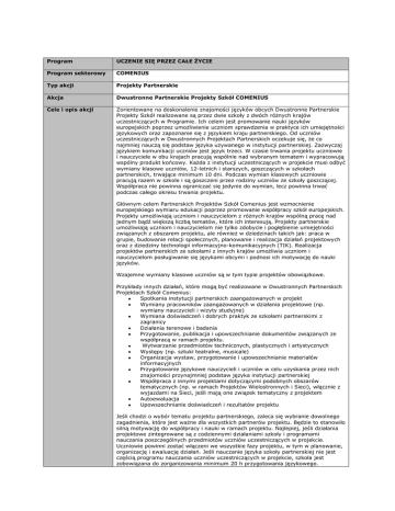 Program UCZENIE SIĘ PRZEZ CAŁE ŻYCIE Program sektorowy COMENIUS Typ akcji Projekty Partnerskie Akcja Dwustronne Partnerskie Projekty Szkół COMENIUS Cele i opis akcji Zorientowane na doskonalenie znajomości języków obcych Dwustronne Partnerskie Projekty Szkół realizowane są przez dwie szkoły z dwóch różnych krajów uczestniczących w Programie. Ich celem jest promowanie nauki języków europejskich poprzez umożliwienie uczniom sprawdzenia w praktyce ich umiejętności językowych oraz zapoznanie się z językiem kraju partnerskiego. Od uczniów uczestniczących w Dwustronnych Projektach Partnerskich oczekuje się, że co najmniej nauczą się podstaw języka używanego w instytucji partnerskiej. Zazwyczaj językiem komunikacji uczniów jest język trzeci. W czasie trwania projektu uczniowie i nauczyciele w obu krajach pracują wspólnie nad wybranym tematem i wypracowują wspólny produkt końcowy. Każda z instytucji uczestniczących w projekcie musi odbyć wymiany klasowe uczniów, 12-letnich i starszych, goszczących w szkołach partnerskich, trwające minimum 10 dni. Podczas wymian klasowych uczniowie pracują razem w szkole i są goszczeni przez rodziny uczniów ze szkoły goszczącej. Współpraca nie powinna ograniczać się jedynie do wymian, lecz powinna trwać podczas całego okresu trwania projektu. Głównym celem Partnerskich Projektów Szkół Comenius jest wzmocnienie europejskiego wymiaru edukacji poprzez promowanie współpracy szkół europejskich. Projekty umożliwiają uczniom i nauczycielom z różnych krajów wspólną pracę nad jednym bądź większą liczbą tematów, które ich interesują. Projekty partnerskie umożliwiają uczniom i nauczycielom nie tylko zdobycie i pogłębienie umiejętności związanych z obszarem projektu, ale również w dziedzinach takich jak: praca w grupie, budowanie relacji społecznych, planowanie i realizacja działań projektowych oraz z dziedziny technologii informacyjno-komunikacyjnych (TIK). Realizacja projektów partnerskich ze szkołami z innych krajów umożliwia uczniom i nauczycielom posługiwanie się językami obcymi i podnosi ich motywację do nauki języków. Wzajemne wymiany klasowe uczniów są w tym typie projektów obowiązkowe. Przykłady innych działań, które mogą być realizowane w Dwustronnych Partnerskich Projektach Szkół Comenius: Spotkania instytucji partnerskich zaangażowanych w projekt Wymiany pracowników zaangażowanych w działania projektowe (np. wymiany nauczycieli i wizyty studyjne) Wymiana doświadczeń i dobrych praktyk ze szkołami partnerskimi z zagranicy Działania terenowe i badania Przygotowanie, publikacja i upowszechnianie dokumentów związanych ze współpracą w ramach projektu. Wytwarzanie przedmiotów technicznych, plastycznych i artystycznych Występy (np. sztuki teatralne, musicale) Organizacja wystaw, przygotowanie i upowszechnianie materiałów informacyjnych Przygotowanie językowe nauczycieli i uczniów w celu uzyskania przez nich znajomości przynajmniej podstaw języka instytucji partnerskiej Współpraca z innymi projektami dotyczącymi podobnych obszarów tematycznych (np. w ramach Projektów Wielostronnych i Sieci), włącznie z wyjazdami na Sieci, jeśli mają one związek tematyczny z projektem Autoewaluacja Upowszechnianie doświadczeń i rezultatów projektu Jeśli chodzi o wybór tematu projektu partnerskiego, zaleca się wybranie dowolnego zagadnienia, które jest ważne dla wszystkich partnerów projektu. Będzie to stanowiło silną motywację do współpracy i nauki w ramach projektu. Najlepiej, jeśli działania projektowe zintegrowane są z codziennymi działaniami szkoły i programami nauczania poszczególnych przedmiotów uczniów uczestniczących w projekcie. Uczniowie powinni zostać włączeni we wszystkie fazy projektu, w tym w planowanie, organizację i ewaluację działań. Jeśli nauczanie języka szkoły partnerskiej nie jest częścią programu nauczania uczniów uczestniczących w projekcie, szkoła jest zobowiązana do zorganizowania minimum 20 h przygotowania językowego. Kto może skorzystać Kto może złożyć wniosek PRIORYTETY Jak składać wniosek Pracownicy oraz uczniowie szkół uczestniczących w projekcie, jak również pośrednio społeczność lokalna Szkoły (instytucje zapewniające edukację ogólną, zawodową i techniczną od przedszkola do szkoły ponadgimnazjalnej oraz, wyjątkowo w przypadku Dwustronnych Projektów Partnerskich, instytucje pozaszkolne oferujące praktykę rzemieślniczą). Prosimy skontaktować się z Narodową Agencją w celu sprawdzenia czy zostały ustalone priorytety narodowe. Nie ma priorytetów europejskich dla Dwustronnych Projektów Partnerskich Szkół. Jest to akcja zdecentralizowana. Wnioski należy przesyłać do polskiej Narodowej Agencji na adres: Fundacja Rozwoju Systemu Edukacji Narodowa Agencja Programu “Uczenie się przez całe życie” Ul. Mokotowska 43 00-551 Warszawa Z dopiskiem: „Comenius – Wniosek Partnerskie Projekty Szkół” Więcej informacji można znaleźć na stronie internetowej Narodowej Agencji Procedura NA1 selekcyjna: Termin składania wniosków: 21 lutego 2013 Czas trwania Minimalny czas 2 lata trwania: Maksymalny czas 2 lata trwania: Komentarz dot. brak czasu trwania: POSTANOWIENIA FINANSOWE Więcej informacji można znaleźć w Części I, Rozdział 4. pt. „Postanowienia Finansowe” niniejszego Przewodnika Obowiązująca tabela Tabela 4 (e) finansowa (e): Maksymalne Nie dotyczy dofinansowanie w EUR: Uwagi dot. Finansowanie w DPPS oparte jest na z góry ustalonych zryczałtowanych kwotach, finansowania: których wysokość zależy od liczby mobilności zaplanowanych przez instytucję wnioskującą. Przez mobilność rozumiemy podróż zagraniczną pracowników lub uczniów w celu uczestnictwa w działaniach partnerskich na terenie kraju partnerskiego. Instytucje zaangażowane w dany projekt partnerski mogą ubiegać się o różne kwoty dofinansow