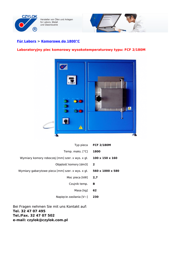 Für Labors > Komorowe do 1800°C Laboratoryjny piec komorowy wysokotemperaturowy typu: FCF 2/180M Typ pieca Temp. maks. [°C] Wymiary komory roboczej [mm] szer. x wys. x gł. Objętość komory [dm3] Wymiary gabarytowe pieca [mm] szer. x wys. x gł. Moc pieca [kW] Czujnik temp. Masa [kg] Napięcie zasilania [V~] Bei Fragen nehmen Sie mit uns Kontakt auf: Tel. 32 47 07 495 Tel./Fax. 32 47 07 502 e-mail: [email protected] FCF 2/180M 1800 100 x 150 x 160 2 560 x 1000 x 580 2,7 B 62 230