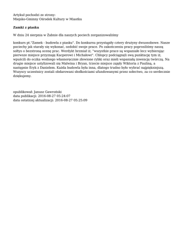 Artykuł pochodzi ze strony: Miejsko-Gminny Ośrodek Kultury w Miastku Zamki z piasku W dniu 24 sierpnia w Żabnie dla naszych pociech zorganizowaliśmy konkurs pt."Zamek - budowla z piasku". Do konkursu przystąpiły cztery drużyny dwuosobowe. Nasze pociechy jak starały się wykonać, ozdobić swoje prace. Po zakończeniu pracy poprosiliśmy naszą sołtys o bezstroną ocenę prac. Werdykt brzmiał iż, "wszystkie prace są wspaniałe lecz wybierając pierwsze miejsce przyznaję Kacperowi i Michałowi". Chłopcy podciągnęli swą punktację tym iż, wpuścili do oczka wodnego własnoręcznie złowione rybki oraz mieli wspaniałą inwencję twórczą. Na drugie miejsce ustylizowali się Malwina i Bryan, trzecie miejsce zajęły Wiktoria z Pauliną, a następnie Eryk z Danielem. Każda budowla była inna, dlatego trudno było wybrać najpiękniejszą. Wszyscy uczestnicy zostali obdarowani słodkościami ufundowanymi przez sołectwo, za co serdecznie dziękujemy. opublikował: Janusz Gawroński data publikacji: 2016-08-27 05:24:07 data ostatniej aktualizacji: 2016-08-27 05:25:09