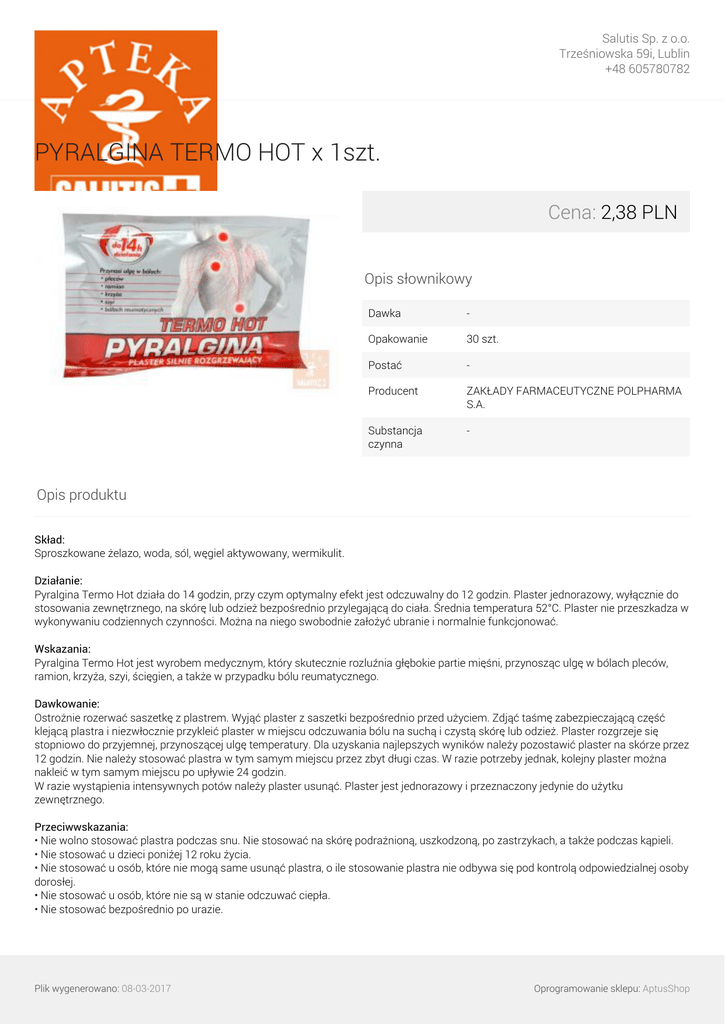 Salutis Sp. z o.o. Trześniowska 59i, Lublin +48 605780782 PYRALGINA TERMO HOT x 1szt. Cena: 2,38 PLN Opis słownikowy Dawka - Opakowanie 30 szt. Postać - Producent ZAKŁADY FARMACEUTYCZNE POLPHARMA S.A. Substancja czynna - Opis produktu Skład: Sproszkowane żelazo, woda, sól, węgiel aktywowany, wermikulit. Działanie: Pyralgina Termo Hot działa do 14 godzin, przy czym optymalny efekt jest odczuwalny do 12 godzin. Plaster jednorazowy, wyłącznie do stosowania zewnętrznego, na skórę lub odzież bezpośrednio przylegającą do ciała. Średnia temperatura 52°C. Plaster nie przeszkadza w wykonywaniu codziennych czynności. Można na niego swobodnie założyć ubranie i normalnie funkcjonować. Wskazania: Pyralgina Termo Hot jest wyrobem medycznym, który skutecznie rozluźnia głębokie partie mięśni, przynosząc ulgę w bólach pleców, ramion, krzyża, szyi, ścięgien, a także w przypadku bólu reumatycznego. Dawkowanie: Ostrożnie rozerwać saszetkę z plastrem. Wyjąć plaster z saszetki bezpośrednio przed użyciem. Zdjąć taśmę zabezpieczającą część klejącą plastra i niezwłocznie przykleić plaster w miejscu odczuwania bólu na suchą i czystą skórę lub odzież. Plaster rozgrzeje się stopniowo do przyjemnej, przynoszącej ulgę temperatury. Dla uzyskania najlepszych wyników należy pozostawić plaster na skórze przez 12 godzin. Nie należy stosować plastra w tym samym miejscu przez zbyt długi czas. W razie potrzeby jednak, kolejny plaster można nakleić w tym samym miejscu po upływie 24 godzin. W razie wystąpienia intensywnych potów należy plaster usunąć. Plaster jest jednorazowy i przeznaczony jedynie do użytku zewnętrznego. Przeciwwskazania: • Nie wolno stosować plastra podczas snu. Nie stosować na skórę podrażnioną, uszkodzoną, po zastrzykach, a także podczas kąpieli. • Nie stosować u dzieci poniżej 12 roku życia. • Nie stosować u osób, które nie mogą same usunąć plastra, o ile stosowanie plastra nie odbywa się pod kontrolą odpowiedzialnej osoby dorosłej. • Nie stosować u osób, które nie są w stanie odczuwać ciepła. • Nie stosować bezpośrednio po urazie. Plik wygenerowano: 08-03-2017 Oprogramowanie sklepu: AptusShop Salutis Sp. z o.o. Trześniowska 59i, Lublin +48 605780782 • Nie stosować podczas równoczesnego miejscowego stosowania na skórę różnego rodzaju produktów leczniczych lub równocześnie z innymi źródłami ciepła. Przed użyciem zapoznaj się z ulotką dołączoną do opakowania, która zawiera wskazania, przeciwwskazania, dane dotyczące działań niepożądanych i dawkowanie oraz informacje dotyczące stosowania i przechowywania produktu leczniczego, bądź skonsultuj się z lekarzem lub farmaceutą, gdyż każdy lek niewłaściwie stosowany zagraża Twojemu życiu lub zdrowiu. Plik wygenerowano: 08-03-2017 Powered by TCPDF (www.tcpdf.org) Oprogramowanie sklepu: AptusShop