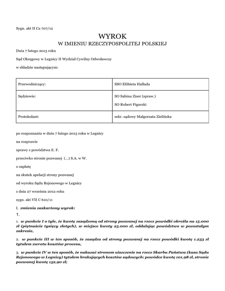 Sygn. akt II Ca 707/12 WYROK W IMIENIU RZECZYPOSPOLITEJ POLSKIEJ Dnia 7 lutego 2013 roku Sąd Okręgowy w Legnicy II Wydział Cywilny Odwoławczy w składzie następującym: Przewodniczący: SSO Elżbieta Hallada Sędziowie: SO Sabina Ziser (spraw.) SO Robert Figurski Protokolant: sekr. sądowy Małgorzata Zielińska po rozpoznaniu w dniu 7 lutego 2013 roku w Legnicy na rozprawie sprawy z powództwa E. F. przeciwko stronie pozwanej (...) S.A. w W. o zapłatę na skutek apelacji strony pozwanej od wyroku Sądu Rejonowego w Legnicy z dnia 27 września 2012 roku sygn. akt VII C 610/11 I. zmienia zaskarżony wyrok: 1. 1. w punkcie I o tyle, że kwotę zasądzoną od strony pozwanej na rzecz powódki określa na 15.000 zł (piętnaście tysięcy złotych), w miejsce kwoty 25.000 zł, oddalając powództwo w pozostałym zakresie, 2. w punkcie III w ten sposób, że zasądza od strony pozwanej na rzecz powódki kwotę 1.233 zł tytułem zwrotu kosztów procesu, 3. w punkcie IV w ten sposób, że nakazać stronom uiszczenie na rzecz Skarbu Państwa (kasa Sądu Rejonowego w Legnicy) tytułem brakujących kosztów sądowych: powódce kwotę 101,98 zł, stronie pozwanej kwotę 152,90 zł; II. oddala apelację w pozostałej części; II. znosi wzajemnie między stronami koszty postępowania apelacyjnego. Sygn. akt II Ca 707/12 UZASADNIENIE Wyrokiem z dnia 27 września 2012 roku w Sąd Rejonowy w Legnicy zasądził od strony pozwanej (...) S.A. w W. na rzecz powódki E. F. kwotę 25.000 zł z odsetkami ustawowymi od 8.04.2011r. (punkt I), oddalił dalej idące powództwo (punkt II) i obciążył pozwaną zwrotem kosztów procesu na rzecz powódki w kwocie 3.667,00 zł (punkt III) a na rzecz Skarbu Państwa nakazał uiścić pozwanemu kwotę 254,88 zł. Zasądzone roszczenie oparł Sąd na przepisie art.446 § 1 i 4 k.c. i stanowi ono zadośćuczynienie za śmierć brata powódki T. F., który zginął w wypadku samochodowym dnia 12.12.2010r. spowodowanym przez kierowcę ubezpieczonego u strony pozwanej. Sąd Rejonowy uznał, że zadośćuczynienie za śmierć brata powódki winno wynosić 30.000,00 zł, przy uwzględnieniu takich ustalonych w procesie okoliczności, jak bardzo silna więź uczuciowa pomiędzy rodzeństwem i utrzymywanie stałych kontaktów. Skoro powódka otrzymała już z tego tytułu w toku postępowania likwidacyjnego kwotę 5.000,00 zł do zasądzenia pozostawała suma 25.000,00 zł wyczerpująca w całości jej żądanie zgłoszone w pozwie. Sąd pierwszej instancji nie uwzględnił całego żądania w zakresie odsetek oddalając w tym zakresie częściowo powództwo. Orzeczenie o kosztach procesu oparte zostało o przepis art.98 kpc. Jednocześnie Sąd nakazał stronie pozwanej uiszczenie na rzecz Skarbu Państwa kwoty 254,88 zł wydatkowanych tymczasowo ze środków budżetowych tego Sądu tytułem wynagrodzenia biegłego. Strona pozwana wniosła apelację od wyroku w części uwzględniającej powództwo i zasądzającej koszty postępowania (punkty I, III i IV) zarzucając naruszenie prawa materialnego - art.446§4 kc, a to poprzez zasądzenie rażąco wygórowanej kwoty tytułem zadośćuczynienia za śmierć brata. Ubezpieczyciel domagał się zmiany zaskarżonego wyroku poprzez zasądzenie kwoty 5.000,00 zł w miejsce kwoty 25.000,00 zł i oddalenie powództwa w pozostałym zakresie oraz zasądzenie zwrotu kosztów procesu i kosztów postępowania apelacyjnego. Ewentualnie wnosił o uchylenie zaskarżonego wyroku i przekazanie sprawy Sądowi pierwszej instancji do ponownego rozpoznania przy uwzględnieniu kosztów postępowania apelacyjnego. Sąd Okręgowy przyjmując za własne prawidłowe ustalenia faktyczne poczynione w pierwszej instancji zważył, co następuje: Apelacja jest częściowo uzasadniona. Zgodzić należy się z jej zarzutem, iż zadośćuczynienie na poziomie 30.000,00 zł, należne na podstawie art.446§4 k.c. z tytułu śmierci brata, jest w okolicznościach niniejszej sprawy nadmierne. Do takich wniosków uprawniają wyniki przeprowadzonego w pierwszej instancji postępowania dowodowego a w szczególności z zeznań świadków oraz opinii biegłego sądowego z zakresu psychologii. W szczególności wynika z nich, że w przypadku powódki przebieg żałoby po śmierci brata nie miał charakteru nietypowego. Powódka nie wymagała pomocy lekarskiej czy też terapii psychologicznej i z takiej pomocy też nie korzystała. Ponadto z treści opinii biegłego sądowego wynika, że w związku ze śmiercią brata nie doznała trwałego uszczerbku na zdrowiu czy też nie zaszły u niej zmiany psychofizyczne. Powódka powróciła do realizacji własnych potrzeb znajdując oparcie w pozostałych członkach rodziny. Wraz z narzeczonym mieszka w G. gdzie studiuje. W oparciu o takie ustalenia można stwierdzić, że krzywda powódki, wynikająca ze zdarzenia, za które odpowiedzialność ponosi strona pozwana, nie ma charakteru szczególnego, lecz typowy – właściwy dla rodzaju tego zdarzenia. Śmierci osoby najbliższej, co oczywiste, nie można i nie wolno wyrazić żadną kwotą pieniędzy i nie temu służy należne z woli ustawodawcy zadośćuczynienie. Świadczenie to ma być odpowiednie do doznanej krzywdy, której rozmiar zależy w szczególności od sposobu przebycia żałoby oraz wpływu straty osoby najbliższej na życie, zdrowie i samopoczucie osoby uprawnionej do takiego zadośćuczynienia. Przy typowym przebiegu żałoby powódki i braku wynikającego stąd uszczerbku na zdrowiu, czy szczególnych zmian w życiu, Sąd Okręgowy podziela pogląd strony pozwanej, że przyjęte przez Sąd Rejonowy zadośćuczynienie nie jest odpowiednie w rozumieniu art.446 § 4 kc. W ocenie Sądu odwoławczego kwotą adekwatną do ustalonych w sprawie okoliczności nie jest jednak kwota 10.000,00 zł, jak wskazuje to strona pozwana, albowiem suma na tym poziomie nie uwzględnia więzi powódki z bratem. Kwotą w przekonaniu Sądu Okręgowego odpowiednią jest suma 20