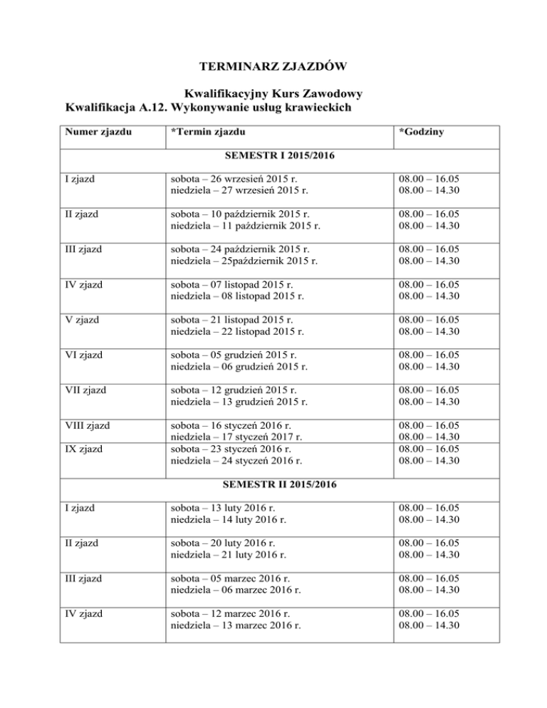 TERMINARZ ZJAZDÓW Kwalifikacyjny Kurs Zawodowy Kwalifikacja A.12. Wykonywanie usług krawieckich Numer zjazdu *Termin zjazdu *Godziny SEMESTR I 2015/2016 I zjazd sobota – 26 wrzesień 2015 r. niedziela – 27 wrzesień 2015 r. 08.00 – 16.05 08.00 – 14.30 II zjazd sobota – 10 październik 2015 r. niedziela – 11 październik 2015 r. 08.00 – 16.05 08.00 – 14.30 III zjazd sobota – 24 październik 2015 r. niedziela – 25październik 2015 r. 08.00 – 16.05 08.00 – 14.30 IV zjazd sobota – 07 listopad 2015 r. niedziela – 08 listopad 2015 r. 08.00 – 16.05 08.00 – 14.30 V zjazd sobota – 21 listopad 2015 r. niedziela – 22 listopad 2015 r. 08.00 – 16.05 08.00 – 14.30 VI zjazd sobota – 05 grudzień 2015 r. niedziela – 06 grudzień 2015 r. 08.00 – 16.05 08.00 – 14.30 VII zjazd sobota – 12 grudzień 2015 r. niedziela – 13 grudzień 2015 r. 08.00 – 16.05 08.00 – 14.30 VIII zjazd sobota – 16 styczeń 2016 r. niedziela – 17 styczeń 2017 r. sobota – 23 styczeń 2016 r. niedziela – 24 styczeń 2016 r. 08.00 – 16.05 08.00 – 14.30 08.00 – 16.05 08.00 – 14.30 IX zjazd SEMESTR II 2015/2016 I zjazd sobota – 13 luty 2016 r. niedziela – 14 luty 2016 r. 08.00 – 16.05 08.00 – 14.30 II zjazd sobota – 20 luty 2016 r. niedziela – 21 luty 2016 r. 08.00 – 16.05 08.00 – 14.30 III zjazd sobota – 05 marzec 2016 r. niedziela – 06 marzec 2016 r. 08.00 – 16.05 08.00 – 14.30 IV zjazd sobota – 12 marzec 2016 r. niedziela – 13 marzec 2016 r. 08.00 – 16.05 08.00 – 14.30 V zjazd sobota – 09 kwiecień 2016 r. niedziela – 10 kwiecień 2016 r. 08.00 – 16.05 08.00 – 14.30 VI zjazd sobota – 23 kwiecień 2016 r. niedziela – 24 kwiecień 2016 r. 08.00 – 16.05 08.00 – 14.30 VII zjazd sobota – 07 maj 2016 r. niedziela – 08 maj 2016 r. 08.00 – 16.05 08.00 – 14.30 VIII zjazd sobota –21 maj 2016 r. niedziela – 22 maj 2016 r. 08.00 – 16.05 08.00 – 14.30 IX zjazd sobota – 04 czerwiec 2016 r. niedziela – 05 czerwiec 2016 r. 08.00 – 16.05 08.00 – 14.30 X zjazd sobota – 18 czerwiec 2016 r. niedziela – 19 czerwiec 2016 r. 08.00 – 16.05 08.00 – 14.30 Numer zjazdu *Termin zjazdu *Godziny: (od – do ) SEMESTR III 2016/2017 I zjazd sobota – 10 wrzesień 2016 r. niedziela – 11 wrzesień 2016 r. II zjazd sobota – 17 wrzesień 2016 r. niedziela – 18 wrzesień 2016 r. III zjazd sobota – 01 październik 2016 r. niedziela – 02 październik 2016 r. IV zjazd sobota – 15 październik 2016 r. niedziela – 16 październik 2016 r. V zjazd sobota – 29 październik 2016 r. niedziela – 30 październik 2016 r. VI zjazd sobota – 19 listopad 2016 r. niedziela – 20 listopad 2016 r. VII zjazd sobota – 26 listopad 2016 r. niedziela – 27 listopad 2016 r. VIII zjazd sobota – 10 grudzień 2016 r. niedziela – 11 grudzień 2016 r. IX zjazd sobota – 17 grudzień 2016 r. niedziela – 18 grudzień 2016 r. 08.00 – 16.05 08.00 – 14.30 *Podane terminy i godziny zjazdów mogą ulec zmianie. TERMINARZ ZJAZDÓW Kwalifikacyjny Kurs Zawodowy Kwalifikacja A.12. Wykonywanie usług krawieckich Numer zjazdu *Termin zjazdu *Godziny SEMESTR I 2015/2016 I zjazd sobota – 26 wrzesień 2015 r. niedziela – 27 wrzesień 2015 r. 08.00 – 16.05 08.00 – 14.30 II zjazd sobota – 10 październik 2015 r. niedziela – 11 październik 2015 r. 08.00 – 16.05 08.00 – 14.30 III zjazd sobota – 24 październik 2015 r. niedziela – 25październik 2015 r. 08.00 – 16.05 08.00 – 14.30 IV zjazd sobota – 07 listopad 2015 r. niedziela – 08 listopad 2015 r. 08.00 – 16.05 08.00 – 14.30 V zjazd sobota – 21 listopad 2015 r. niedziela – 22 listopad 2015 r. 08.00 – 16.05 08.00 – 14.30 VI zjazd sobota – 05 grudzień 2015 r. niedziela – 06 grudzień 2015 r. 08.00 – 16.05 08.00 – 14.30 VII zjazd sobota – 12 grudzień 2015 r. niedziela – 13 grudzień 2015 r. 08.00 – 16.05 08.00 – 14.30 VIII zjazd sobota – 16 styczeń 2016 r. niedziela – 17 styczeń 2017 r. sobota – 23 styczeń 2016 r. niedziela – 24 styczeń 2016 r. 08.00 – 16.05 08.00 – 14.30 08.00 – 16.05 08.00 – 14.30 IX zjazd SEMESTR II 2015/2016 I zjazd sobota – 13 luty 2016 r. niedziela – 14 luty 2016 r. 08.00 – 16.05 08.00 – 14.30 II zjazd sobota – 20 luty 2016 r. niedziela – 21 luty 2016 r. 08.00 – 16.05 08.00 – 14.30 III zjazd sobota – 05 marzec 2016 r. niedziela – 06 marzec 2016 r. 08.00 – 16.05 08.00 – 14.30 IV zjazd sobota – 12 marzec 2016 r. niedziela – 13 marzec 2016 r. 08.00 – 16.05 08.00 – 14.30 V zjazd sobota – 09 kwiecień 2016 r. niedziela – 10 kwiecień 2016 r. 08.00 – 16.05 08.00 – 14.30 VI zjazd sobota – 23 kwiecień 2016 r. niedziela – 24 kwiecień 2016 r. 08.00 – 16.05 08.00 – 14.30 VII zjazd sobota – 07 maj 2016 r. niedziela – 08 maj 2016 r. 08.00 – 16.05 08.00 – 14.30 VIII zjazd sobota –21 maj 2016 r. niedziela – 22 maj 2016 r. 08.00 – 16.05 08.00 – 14.30 IX zjazd sobota – 04 czerwiec 2016 r. niedziela – 05 czerwiec 2016 r. 08.00 – 16.05 08.00 – 14.30 X zjazd sobota – 18 czerwiec 2016 r. niedziela – 19 czerwiec 2016 r. 08.00 – 16.05 08.00 – 14.30 *Podane terminy i godziny zjazdów mogą ulec zmianie.