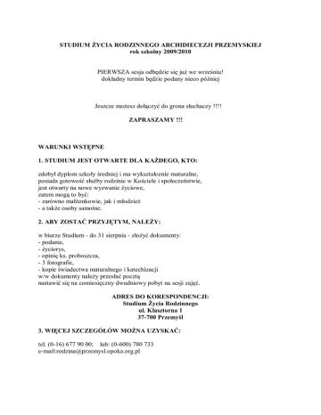 STUDIUM ŻYCIA RODZINNEGO ARCHIDIECEZJI PRZEMYSKIEJ rok szkolny 2009/2010 PIERWSZA sesja odbędzie się już we wrześniu! dokładny termin będzie podany nieco później Jeszcze możesz dołączyć do grona słuchaczy !!!! ZAPRASZAMY !!! WARUNKI WSTĘPNE 1. STUDIUM JEST OTWARTE DLA KAŻDEGO, KTO: zdobył dyplom szkoły średniej i ma wykształcenie maturalne, posiada gotowość służby rodzinie w Kościele i społeczeństwie, jest otwarty na nowe wyzwanie życiowe, zatem mogą to być: - zarówno małżonkowie, jak i młodzież - a także osoby samotne. 2. ABY ZOSTAĆ PRZYJĘTYM, NALEŻY: w biurze Studium - do 31 sierpnia - złożyć dokumenty: - podanie, - życiorys, - opinię ks. proboszcza, - 3 fotografie, - kopie świadectwa maturalnego i katechizacji w/w dokumenty należy przesłać pocztą nastawić się na comiesięczny dwudniowy pobyt na sesji zajęć. ADRES DO KORESPONDENCJI: Studium Życia Rodzinnego ul. Klasztorna 1 37-700 Przemyśl 3. WIĘCEJ SZCZEGÓŁÓW MOŻNA UZYSKAĆ: tel. (0-16) 677 90 00; lub: (0-600) 780 733 e-mail:[email protected] CO MI TO DA? 1. PROGRAM DWULETNIEGO STUDIUM OBEJMUJE WYBRANE ZAGADNIENIA Z ZAKRESU: teologii małżeństwa i rodziny, teologii biblijnej, zagadnień etyki i moralności, duchowości małżeńskiej i rodzinnej, prawa małżeńskiego i rodzinnego, psychologii małżeństwa, pedagogiki rodziny, medycyny i psychologii prenatalnej, zasad komunikacji międzyosobowej, poradnictwa i duszpasterstwa rodzin 2. FORMACJĘ APOSTOLSKĄ 3. DOŚWIADCZENIE SZKOŁY ŻYCIA I WSPÓLNOTY ŻYCZLIWYCH OSÓB 4. POCZUCIE WŁASNEJ WARTOŚCI I GODNOŚCI KAŻDEGO CZŁOWIEKA JAKI JEST JEGO POZIOM? Najlepiej o to zapytać samych absolwentów; dotychczas każdy z nich wyrażał radość i satysfakcję z powodu ukończenia naszej szkoły. Poziom wiedzy i ćwiczeń zapewnia kadra nauczycielska, starannie dobierana pod względem kompetencji osobowości. Stanowią ją profesorowie i absolwenci Wyższego Seminarium Duchownego, Katolickiego Uniwersytetu Lubelskiego, Uniwersytetu Wrocławskiego i innych szanowanych środowisk naukowych. Poza wykładami i ćwiczeniami zapewnia się także możliwości pogłębienia wiary i doświadczenie wspaniałej wspólnoty. Niecodzienny sposób sprawdzania wiedzy pozwala szybciej i łatwiej ją zasymilować i wykorzystać. PO UKOŃCZENIU STUDIUM... ci, którzy posiadają wykształcenie pedagogiczne, mają podstawę ubiegania się o kolejny stopień specjalizacji; małżonkowie mogą z entuzjazmem i nadzieją zacząć wszystko od nowa lub śmielej wędrować dalej; chętni do współpracy z duszpasterstwem rodzin są zaproszeni do pracy w poradniach rodzinnych; wychowawcy i nauczyciele lepiej spełniają swoją misję w rodzinie i w szkole; niektórzy zapragną kontynuować zdobywanie wiedzy i szukanie mądrości.