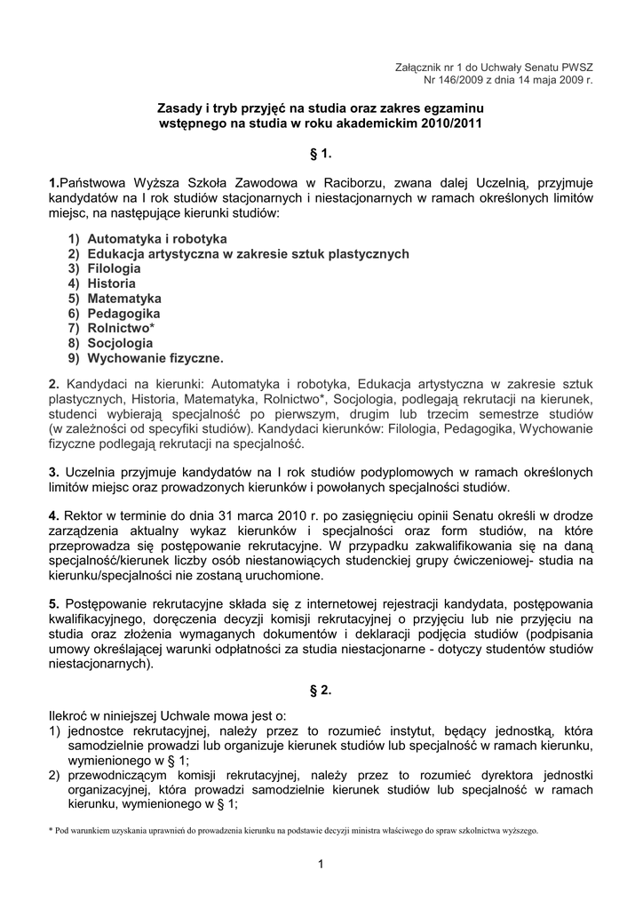 Załącznik nr 1 do Uchwały Senatu PWSZ Nr 146/2009 z dnia 14 maja 2009 r. Zasady i tryb przyjęć na studia oraz zakres egzaminu wstępnego na studia w roku akademickim 2010/2011 § 1. 1.Państwowa WyŜsza Szkoła Zawodowa w Raciborzu, zwana dalej Uczelnią, przyjmuje kandydatów na I rok studiów stacjonarnych i niestacjonarnych w ramach określonych limitów miejsc, na następujące kierunki studiów: 1) 2) 3) 4) 5) 6) 7) 8) 9) Automatyka i robotyka Edukacja artystyczna w zakresie sztuk plastycznych Filologia Historia Matematyka Pedagogika Rolnictwo* Socjologia Wychowanie fizyczne. 2. Kandydaci na kierunki: Automatyka i robotyka, Edukacja artystyczna w zakresie sztuk plastycznych, Historia, Matematyka, Rolnictwo*, Socjologia, podlegają rekrutacji na kierunek, studenci wybierają specjalność po pierwszym, drugim lub trzecim semestrze studiów (w zaleŜności od specyfiki studiów). Kandydaci kierunków: Filologia, Pedagogika, Wychowanie fizyczne podlegają rekrutacji na specjalność. 3. Uczelnia przyjmuje kandydatów na I rok studiów podyplomowych w ramach określonych limitów miejsc oraz prowadzonych kierunków i powołanych specjalności studiów. 4. Rektor w terminie do dnia 31 marca 2010 r. po zasięgnięciu opinii Senatu określi w drodze zarządzenia aktualny wykaz kierunków i specjalności oraz form studiów, na które przeprowadza się postępowanie rekrutacyjne. W przypadku zakwalifikowania się na daną specjalność/kierunek liczby osób niestanowiących studenckiej grupy ćwiczeniowej- studia na kierunku/specjalności nie zostaną uruchomione. 5. Postępowanie rekrutacyjne składa się z internetowej rejestracji kandydata, postępowania kwalifikacyjnego, doręczenia decyzji komisji rekrutacyjnej o przyjęciu lub nie przyjęciu na studia oraz złoŜenia wymaganych dokumentów i deklaracji podjęcia studiów (podpisania umowy określającej warunki odpłatności za studia niestacjonarne - dotyczy studentów studiów niestacjonarnych). § 2. Ilekroć w niniejszej Uchwale mowa jest o: 1) jednostce rekrutacyjnej, naleŜy przez to rozumieć instytut, będący jednostką, która samodzielnie prowadzi lub organizuje kierunek studiów lub specjalność w ramach kierunku, wymienionego w § 1; 2) przewodniczącym komisji rekrutacyjnej, naleŜy przez to rozumieć dyrektora jednostki organizacyjnej, która prowadzi samodzielnie kierunek studiów lub specjalność w ramach kierunku, wymienionego w § 1; * Pod warunkiem uzyskania uprawnień do prowadzenia kierunku na podstawie decyzji ministra właściwego do spraw szkolnictwa wyŜszego. 1 3) kandydacie, naleŜy przez to rozumieć osobę ubiegającą się o przyjęcie na studia w jednostkach rekrutacyjnych; 4) limicie miejsc, naleŜy przez to rozumieć minimalną i maksymalną liczbę osób, przyjmowanych na pierwszy rok studiów danego kierunku lub specjalności w ramach określonej formy studiów; 5) egzaminie maturalnym (tzw. nowa matura), naleŜy przez to rozumieć egzamin, o którym mowa w § 140 ust.1 rozporządzenia Ministra Edukacji Narodowej i Sportu z dnia 7 września 2004 r. w sprawie warunków i sposobu oceniania , klasyfikowania i promowania uczniów i słuchaczy oraz przeprowadzania sprawdzianów i egzaminów w szkołach publicznych ( Dz. U. Nr 199 poz. 2046 z 2004 r.); 6) egzaminie dojrzałości (tzw. stara matura), naleŜy przez to rozumieć egzamin, o którym mowa w § 140 ust.2 przywołanego w poprzednim punkcie rozporządzenia Ministra Edukacji Narodowej i Sportu; 7) świadectwie dojrzałości uzyskanym w trybie tzw. nowej matury, naleŜy przez to rozumieć dokument wydany osobie, która zdała egzamin, o którym mowa w punkcie 5; 8) świadectwie dojrzałości uzyskanym w trybie tzw. starej matury, naleŜy przez to rozumieć dokument wydany osobie, która zdała egzamin, o którym mowa w punkcie 6; 9) ustawie, naleŜy przez to rozumieć Ustawę z dnia 27 lipca 2005 r. Prawo o szkolnictwie wyŜszym (Dz. U. Nr 164, poz. 1365 z późniejszymi zmianami). § 3. 1. Rektor w terminie do dnia 31 maja 2010 r., po zasięgnięciu opinii właściwego dyrektora instytutu, określi w drodze zarządzenia limity miejsc na poszczególnych kierunkach i specjalnościach studiów. 2. Ogólna liczba studentów na kierunku studiów stacjonarnych na poszczególnych specjalnościach nie moŜe być mniejsza od liczby studentów studiujących na poszczególnych specjalnościach studiów niestacjonarnych. W szczególnie uzasadnionych przypadkach Senat moŜe wyrazić zgodę na odstąpienie od tej zasady, z zachowaniem reguły określonej w art. 163 ust.2 ustawy. § 4. 1. Kandydaci przyjęci na I rok studiów składają następujące dokumenty: 1a) świadectwo dojrzałości (lub świadectwo maturalne, lub zagraniczne świadectwo dojrzałości-zagraniczne świadectwo maturalne) w oryginale. Jeśli dane świadectwo jest objęte umową o uznaniu równowaŜności wykształcenia i zawiera stwierdzenie, iŜ dana osoba ma prawo ubiegania się o studia wyŜsze w kraju wystawienia tego świadectwa, albo teŜ do świadectwa jest dołączone zaświadczenie wystawione przez polski konsulat, szkołę lub władze oświatowe właściwego kraju potwierdzające uprawnienia ubiegania się o studia wyŜsze w kraju wystawienia świadectwa uznaje się je automatycznie, zgodnie z ustaleniami tekstu umowy międzypaństwowej. Jeśli dany rodzaj świadectwa nie jest objęty umową lub świadectwo pochodzi z kraju, z którym Polska nie zawarła umowy o równowaŜności wykształcenia, wówczas stosuje się do niego rozporządzenie o nostryfikacji świadectw uzyskanych za granicą. Zgodnie z rozporządzeniem takie świadectwo naleŜy przedstawić w kuratorium oświaty właściwym dla miejsca zamieszkania kandydata w Polsce, albo właściwym dla siedziby instytucji, w której osoba zamierza złoŜyć świadectwo uzyskane za granicą (jeśli osoba ta nie posiada miejsca zamieszkania w Polsce). Warunkiem nostryfikacji jest jego zalegalizowanie w polskiej placówce dyplo