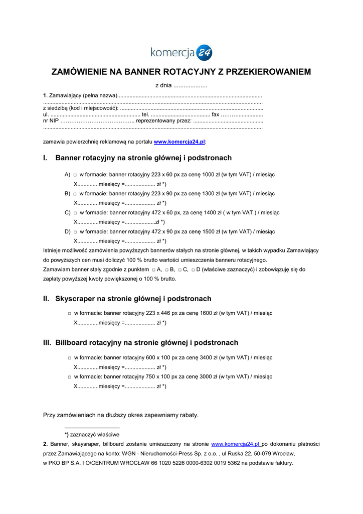 ZAMÓWIENIE NA BANNER ROTACYJNY Z PRZEKIEROWANIEM z dnia .................... 1. Zamawiający (pełna nazwa)............................................................................................... ................................................................................................................................................ z siedzibą (kod i miejscowość): .............................................................................................. ul. ........................................................... tel. ....................................... fax ………................. nr NIP ………………………………….. reprezentowany przez: .............................................. ................................................................................................................................................ zamawia powierzchnię reklamową na portalu www.komercja24.pl: I. Banner rotacyjny na stronie głównej i podstronach A) □ w formacie: banner rotacyjny 223 x 60 px za cenę 1000 zł (w tym VAT) / miesiąc X..............miesięcy =.................... zł *) B) □ w formacie: banner rotacyjny 223 x 90 px za cenę 1300 zł (w tym VAT) / miesiąc X..............miesięcy =.................... zł *) C) □ w formacie: banner rotacyjny 472 x 60 px, za cenę 1400 zł ( w tym VAT ) / miesiąc X..............miesięcy =....................zł *) D) □ w formacie: banner rotacyjny 472 x 90 px za cenę 1500 zł (w tym VAT) / miesiąc X..............miesięcy =.................... zł *) Istnieje możliwość zamówienia powyższych bannerów stałych na stronie głównej, w takich wypadku Zamawiający do powyższych cen musi doliczyć 100 % brutto wartości umieszczenia banneru rotacyjnego. Zamawiam banner stały zgodnie z punktem □ A, □ B, □ C, □ D (właściwe zaznaczyć) i zobowiązuję się do zapłaty powyższej kwoty powiększonej o 100 % brutto. II. Skyscraper na stronie głównej i podstronach □ w formacie: banner rotacyjny 223 x 446 px za cenę 1600 zł (w tym VAT) / miesiąc X..............miesięcy =.................... zł *) III. Billboard rotacyjny na stronie głównej i podstronach □ w formacie: banner rotacyjny 600 x 100 px za cenę 3400 zł (w tym VAT) / miesiąc X..............miesięcy =.................... zł *) □ w formacie: banner rotacyjny 750 x 100 px za cenę 3000 zł (w tym VAT) / miesiąc X..............miesięcy =.................... zł *) Przy zamówieniach na dłuższy okres zapewniamy rabaty. __________________ *) zaznaczyć właściwe 2. Banner, skaysraper, billboard zostanie umieszczony na stronie www.komercja24.pl po dokonaniu płatności przez Zamawiającego na konto: WGN - Nieruchomości-Press Sp. z o.o. , ul Ruska 22, 50-079 Wrocław, w PKO BP S.A. I O/CENTRUM WROCŁAW 66 1020 5226 0000-6302 0019 5362 na podstawie faktury.