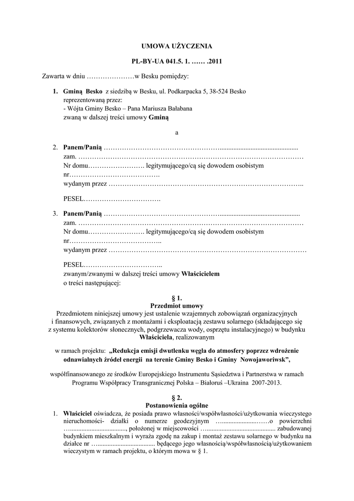 UMOWA UŻYCZENIA PL-BY-UA 041.5. 1. …… .2011 Zawarta w dniu …………………w Besku pomiędzy: 1. Gminą Besko z siedzibą w Besku, ul. Podkarpacka 5, 38-524 Besko reprezentowaną przez: - Wójta Gminy Besko – Pana Mariusza Bałabana zwaną w dalszej treści umowy Gminą a 2. Panem/Panią …………………………………………….............................................. zam. ……………………………………………………………………………………… Nr domu……………………. legitymującego/cą się dowodem osobistym nr…………………………………. wydanym przez ………………………………………………………………………….. PESEL……………………………. 3. Panem/Panią ……………………………………………............................................... zam. ……………………………………………………………………………………… Nr domu……………………. legitymującego/cą się dowodem osobistym nr………………………………….. wydanym przez …………………………………………………………………………… PESEL…………………………….. zwanym/zwanymi w dalszej treści umowy Właścicielem o treści następującej: § 1. Przedmiot umowy Przedmiotem niniejszej umowy jest ustalenie wzajemnych zobowiązań organizacyjnych i finansowych, związanych z montażami i eksploatacją zestawu solarnego (składającego się z systemu kolektorów słonecznych, podgrzewacza wody, osprzętu instalacyjnego) w budynku Właściciela, realizowanym w ramach projektu: „Redukcja emisji dwutlenku węgla do atmosfery poprzez wdrożenie odnawialnych źródeł energii na terenie Gminy Besko i Gminy Nowojaworiwsk”, współfinansowanego ze środków Europejskiego Instrumentu Sąsiedztwa i Partnerstwa w ramach Programu Współpracy Transgranicznej Polska – Białoruś –Ukraina 2007-2013. § 2. Postanowienia ogólne 1. Właściciel oświadcza, że posiada prawo własności/współwłasności/użytkowania wieczystego nieruchomości- działki o numerze geodezyjnym ….....................……o powierzchni ….................................., położonej w miejscowości ….......................................... zabudowanej budynkiem mieszkalnym i wyraża zgodę na zakup i montaż zestawu solarnego w budynku na działce nr …................................... będącego jego własnością/współwłasnością/użytkowaniem wieczystym w ramach projektu, o którym mowa w § 1. 2. Właściciel oświadcza, że jest świadomy, iż efekty realizowanego projektu w budynku, o którym mowa w ust. 1 nie mogą być wykorzystywane w działalności gospodarczej. 3. Właściciel upoważnia Gminę, do występowania w jego imieniu przed właściwymi organami administracyjnymi, przy ubieganiu się o uzyskanie przewidzianych przepisami prawa niezbędnych opinii, decyzji, zezwoleń i innych dokumentów niezbędnych dla prawidłowej realizacji projektu, o którym mowa w § 1 dotyczących nieruchomości Właściciela określonej w ust.1. 4. Właściciel oświadcza, że budynek, o którym mowa w ust 1 posiada warunki techniczne umożliwiające montaż zestawu solarnego tj: wyposażony jest w instalację ciepłej i zimnej wody posiada dobry stan techniczny dachu posiada wolną powierzchnię wewnątrz budynku umożliwiająca montaż urządzeń 5. Właściciel oświadcza, że jest świadomy możliwych utrudnień i niedogodności związanych z prowadzeniem prac w budynku, o którym mowa w ust 1 i nie będzie dochodził żadnych roszczeń z tego tytułu. 6. Właściciel oświadcza, że w budynku, o którym mowa w ust 1 zamieszkuje ……… osób i taką liczbę mieszkańców należy uwzględnić przy doborze parametrów instalacji solarnej dla budynku o którym mowa w § 2 ust. 1. 7. Gmina zobowiązuje się do prowadzenia spraw formalnych związanych z zawarciem umowy o dofinansowanie, realizacją, promocją, monitoringiem i rozliczeniem projektu, o którym mowa w § 1. § 3. Określenie warunków organizacyjnych 1. Gmina zabezpieczy realizację celu projektu tj. zgodnie z przepisami ustawy Prawo zamówień publicznych, wyłoni wykonawcę zestawów solarnych, ustali harmonogram realizacji prac dokumentacyjnych i montażowych, będzie sprawować bieżący nadzór nad przebiegiem prac, przeprowadzi odbiory końcowe oraz rozliczenie finansowe projektu. 2. Właściciel oświadcza, że wyraża zgodę na zakup i montaż zestawu solarnego oraz na przeprowadzenie wszelkich niezbędnych prac w budynku będącego jego własnością w ramach projektu, o którym mowa w § 1 przez wykonawcę instalacji solarnej wyłonionego przez Gminę zgodnie z postanowieniami ust. 1. 3. Wykonawca zestawu solarnego wyłoniony przez Gminę zgodnie z postanowieniami ust 1 dokona montażu i uruchomienia zestawu solarnego budynku Właściciela obejmującego montaż urządzeń i włączenie do instalacji. 4. Właściciel zobowiązuje się we własnym zakresie i na własny koszt do wykonania prac remontowych, które będą następstwem prac montażowych zestawu solarnego takich jak: malowanie, uzupełnienie okładzin ścian i podłóg, naprawa elewacji i innych drobnych prac kosmetycznych przywracających estetykę budynku. § 4. Określenie warunków własnościowych i eksploatacyjnych 1. Po zakończeniu prac montażowych, sprzęt i urządzenia wchodzące w skład zestawu solarnego, zamontowane w budynku, o którym mowa w § 2 ust. 1 pozostają własnością Gminy przez cały okres trwania umowy, o którym mowa w § 6. 2. Począwszy od terminu zakończenia i odbioru prac montażowych w budynku będącym własnością Właściciela, Gmina użycza Właścicielowi sprzęt i urządzenia wchodzące w skład zestawu solarnego do korzystania zgodnie z jego przeznaczeniem do zakończenia okresu trwania umowy, o którym mowa w § 6. 3. Właściciel zobowiązuje się w trakcie trwa