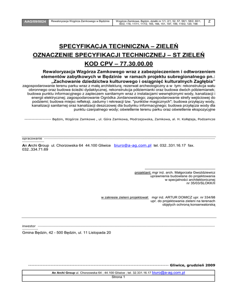 AAG/09/0024 Rewaloryzacja Wzgórza Zamkowego w Będzinie Wzgórze Zamkowe, Będzin, działki nr 1/1, 2/1, 52, 57, 58/1, 58/2, 60/1, 60/2, 116, 117/1, 117/2, 165, 166, 151, 197, 199, 119/2, 120, 198 Z SPECYFIKACJA TECHNICZNA – ZIELEŃ OZNACZENIE SPECYFIKACJI TECHNICZNEJ – ST ZIELEŃ KOD CPV – 77.30.00.00 Rewaloryzacja Wzgórza Zamkowego wraz z zabezpieczeniem i odtworzeniem elementów zabytkowych w Będzinie w ramach projektu subregionalnego pn.: „Zachowanie dziedzictwa kulturowego i osiągnięć kulturalnych Zagłębia” zagospodarowanie terenu parku wraz z małą architekturą; rezerwat archeologiczny a w tym: rekonstrukcja wału obronnego oraz budowa ścieŜki dydaktycznej, rekonstrukcja półziemianki oraz budowa dwóch półziemianek; budowa punktu informacyjnego z zapleczem sanitarnym wraz z instalacjami wewnętrznymi wody, kanalizacji i energii elektrycznej; zagospodarowanie Ogródka Jordanowskiego; zagospodarowanie strefy wejściowej do podziemi; budowa miejsc refleksji, zadumy i rekreacji tzw. "punktów magicznych"; budowa przyłączy wody, kanalizacji sanitarnej oraz kanalizacji deszczowej dla budynku informacyjnego; budowa przyłącza wody dla punktu czerpalnego wody; oświetlenie terenu parku oraz oświetlenie ekspozycyjne ------------------- Będzin, Wzgórze Zamkowe , ul. Góra Zamkowa, Modrzejowska, Zamkowa, al. H. Kołłątaja, Podzamcze opracowanie ------------------------------------------------------------------------------------------------------------------------------------------------------------- An Archi Group ul. Chorzowska 64 44.100 Gliwice [email protected] tel. 032..331.16.17 fax. 032..334.71.69 -----------------------------------------------------------projektant: mgr inŜ. arch. Małgorzata Gwoździewicz uprawnienia budowlane do projektowania w specjalności architektonicznej nr 35/03/SLOKK/II w zakresie zieleni projektował: mgr inŜ. ARTUR DOMICZ upr. nr 334/98 upr. do projektowania zieleni na terenach objętych ochroną konserwatorską inwestor ------------------------------------------------------------------------------------------------------------------------------------------------------------- Gmina Będzin, 42 - 500 Będzin, ul. 11 Listopada 20 ---------------------------------------------------------------------------------------- Gliwice, grudzień 2009 An Archi Group ul. Chorzowska 64 ; 44.100 Gliwice ; tel. 32.331.16.17 [email protected] Strona 1 AAG/09/0024 Rewaloryzacja Wzgórza Zamkowego w Będzinie Wzgórze Zamkowe, Będzin, działki nr 1/1, 2/1, 52, 57, 58/1, 58/2, 60/1, 60/2, 116, 117/1, 117/2, 165, 166, 151, 197, 199, 119/2, 120, 198 Z ST - ZIELEŃ WYKONANIE ZIELENI DLA REWALORYZACJI WZGÓRZA ZAMKOWEGO W BĘDZINIE 1. Wstęp 1.1. Przedmiot Specyfikacji Technicznej (ST) Przedmiotem niniejszej Specyfikacji są wymagania dotyczące wykonania zieleni dla zagospodarowania wzgórza zamkowego w Będzinie 1.2. Zakres stosowania ST Specyfikacja jest stosowana jako dokument przetargowy i kontraktowy przy zlecaniu i realizacji robót wymienionych w punkcie 1.1. 1.3. Zakres robót objętych ST Ustalenia zawarte w niniejszej Specyfikacji dotyczą zasad prowadzenia robót wg. lokalizacji przedstawionej w Projekcie Zieleni związanych z: - usunięciem i karczowaniem drzew i krzewów wykonaniem trawników, sadzeniem krzewów liściastych sadzeniem bylin 1.4. Określenia podstawowe 1.4.1. Drzewo - roślina wieloletnia duŜych rozmiarów o wyraźnie wykształconym pniu, który na pewnej wysokości nad ziemią rozgałęzia się w koronę. 1.4.2. Krzew - wielopędowa zdrewniała roślina, której główne pędy wyrastają nie wyŜej niŜ 10 cm nad szyjką korzeniową. 1.4.3. Pień- nieugałęziona dolna część przewodnika. 1.4.4. Ziemia urodzajna - ziemia posiadająca właściwości zapewniające roślinom prawidłowy rozwój. 1.4.5. Materiał roślinny - sadzonki drzew, krzewów i bylin. 1.4.6. Bryła korzeniowa - uformowana przez szkółkowanie bryła ziemi z przerastającymi ją korzeniami rośliny. 1.4.7. Forma naturalna - forma drzewa zgodna z naturalnymi cechami wzrostu danego gatunku, z wyraźne wykształconym przewodnikiem, nie przycinanym i nie podkrzesywanym. 1.4.8. Forma pienna - forma drzew i niektórych krzewów sztucznie wytworzona w szkółce poprzez wyprowadzenie do określonej wysokości pnia i prawidłowo uformowaną koroną. 1.4.9. Forma krzewiasta - forma właściwa dla krzewów lub forma drzewa utworzona w szkółce przez niskie przycięcie przewodnika powodująca wybicie min. 3 pędów. 1.4.10. Pnącze - roślina, która dzięki właściwościom czepnym i pnącym moŜe piąć się po konstrukcjach. 1.4.11. Pozostałe określenia są zgodne z obowiązującymi polskimi normami i z definicjami podanymi w OST „Część ogólna", pkt 1.13. An Archi Group ul. Chorzowska 64 ; 44.100 Gliwice ; tel. 32.331.16.17 [email protected] Strona 2 AAG/09/0024 1.5. Rewaloryzacja Wzgórza Zamkowego w Będzinie Wzgórze Zamkowe, Będzin, działki nr 1/1, 2/1, 52, 57, 58/1, 58/2, 60/1, 60/2, 116, 117/1, 117/2, 165, 166, 151, 197, 199, 119/2, 120, 198 Z Ogólne wymagania dotyczące robót Wykonawca robót jest odpowiedzialny za jakość ich wykonania oraz za zgodność z Dokumentacją Projektową, ST i poleceniami Inspektora Nadzoru Terenów Zieleni. Ogólne wymagania dotyczące Robót podano w Specyfikacji Mała Architektura „Część ogólna", pkt 1.3.-1.11. 2. Materiały 2.1. Ogólne wymagania dotyczące materiałów Ogólne wymagania dotyczące materiałów podano w OST - 00 „Część ogólna", pkt 2.. 2.2. Ziemia urodzajna i torf Ziemia urodzajna i torf powinny posiadać następujące właściwości: ziemia zakupiona i dostarczona na plac budowy - nie moŜe być zagruzowana, przerośnięta korzeniami, zasolona lub zanieczyszczona chemicznie - winna posiadać aktualne badania dotyczące odczynu (pH) i granulacji oraz zawartości mikroelementów, powinna być odchwaszczona. naleŜy przewidzieć zakup humusu (ziemi urodzajnej) do zaprawy do