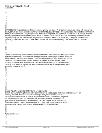 www.choszczno.pl Cenią strażacki trud 11.06.2013. CHOSZCZNO Tego jeszcze w historii naszej gminy nie było. W organizowanym od wielu lat konkursie plastycznym „Zapobiegajmy pożarom” pierwszą i drugą nagrodę na szczeblu centralnym zdobyli choszcznianie. Zwyciężył obraz namalowany przez JAROSŁAWA FORYSIAKA, a drugie miejsce zajęła płaskorzeźba wykonana przez braci ADAMA i ANDRZEJA KMITÓW. W sobotę na Placu Witosa nagrody wręczyli im komendant wojewódzki PSP gen. HENRYK CEGIEŁKA, zastępca komendanta głównego PSP gen. MAREK KOWALSKI i prezes zachodniopomorskiej OSP STANISŁAW DYCHA. Obraz namalowany przez JAROSŁAWA FORYSIAKA zatytułowany „Chwila wytchnienia” przedstawia małego chłopca podającego butelkę wody zmęczonemu po akcji strażakowi. Tym, którzy czytają o tym twórcy po raz pierwszy przypominamy, że ten niepełnosprawny artysta maluje tylko nogami, a jego dzieła wielokrotnie były już nagradzane. M.in. w ubiegłym roku, w tym samym konkursie jego obraz otrzymał wyróżnienie także na szczeblu centralnym. Bracia ADAM i ANDRZEJ KMITOWIE wyróżnieni zostali za wykonanie płaskorzeźby zatytułowanej „Za poświęcenie”. To swoisty projekt medalu okolicznościowego dedykowany strażakom szczególnie zasłużonym w czasie akcji ratowniczych. Dodatkową nagrodą dla tych twórców jest to, że wizerunki ich prac wydane zostały na specjalnych widokówkach. Podkreślmy, że cała trójka, to uczestnicy Środowiskowego Domu Samopomocy w Choszcznie, a artystyczne wizje spełniają pod okiem instruktora ARTURA GROSZKOWSKIEGO. Tadeusz Krawiec http://www.choszczno.pl Kreator PDF Utworzono 8 March, 2017, 18:07