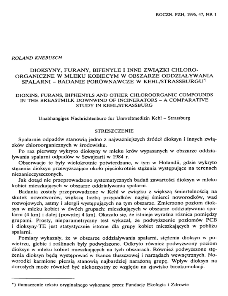 ROCZN. PZH, 1996, 47, NR 1 ROLAND KNEBUSCH D IO K SY N Y , F U R A N Y , B IFE N Y L E I IN N E Z W IĄ Z K I C H L O R O O R G A N IC Z N E W M L E K U K O B IEC Y M W O B S Z A R Z E O D D Z IA Ł Y W A N IA S PA L A R N I - B A D A N IE P O R Ó W N A W C Z E W K E H L /ST R A SSB U R G U *) DIOXINS, FURANS, BIPHENYLS AND OTHER CHLOROORGANIC COMPOUNDS IN THE BREASTMILK DOWNWIND OF INCINERATORS - A COMPARATIVE STUDY IN KEHL/STRASSBURG Unabhangiges Nachrichtenburo fiir Umweltmedizin Kehl - Strassburg STRESZCZENIE S palarnie odpadów stanow ią jedno z najważniejszych źródeł dioksyn i innych zwią zków chloroorganicznych w środowisku. Po raz pierwszy w ykryto dioksyny w mleku krów wypasanych w obszarze oddzia ływania spalarni odpadów w Szwajcarii w 1984 r. O bserw acje te były w ielokrotnie potw ierdzane, w tym w H olandii, gdzie wykryto stężenia dioksyn przew yższające około pięciokrotnie stężenia w ystępujące na terenach niezanieczyszczonych. Jak dotąd nie przeprow adzono systematycznych badań zawartości dioksyn w m leku kobiet mieszkających w obszarze oddziaływania spalarni. B adania zostały przeprow adzone w Kehl w związku z większą śm iertelnością na skutek nowotworów, większą liczbą przypadków nagłej śmierci now orodków , wad rozwojowych, astmy i alergii występujących na tym obszarze. Z m ierzono poziom diok syn w m leku kobiet w dwóch grupach: mieszkających w obszarze oddziaływania sp a larni (4 km ) i dalej (powyżej 4 km). O kazało się, że istnieje wyraźna różnica pom iędzy grupam i. Prosty, nieparam etryczny test wykazał, że podwyższenie poziom ów PCB i dioksyny-TE jest statystycznie istotne dla grupy kobiet mieszkających w pobliżu spalarni. Pom iary wykazały, że w obszarze oddziaływania spalarni, stężenia dioksyn w p o w ietrzu, glebie i roślinach były podwyższone. O dkryto również podwyższony poziom dioksyn w mleku kobiet mieszkających na tych obszarach. Również podwyższone stę żenia dioksyn będą w ystępow ać w tkance tłuszczowej i narządach wewnętrznych. N o worodki karm ione p iersią stanow ią najbardziej narażoną grupę. Wpływ dioksyn na dorosłych m oże rów nież być niekorzystny ze względu na zjawisko bioakum ulacji. *) tłumaczenie tekstu oryginalnego wykonane przez Fundację Ekologia i Zdrowie