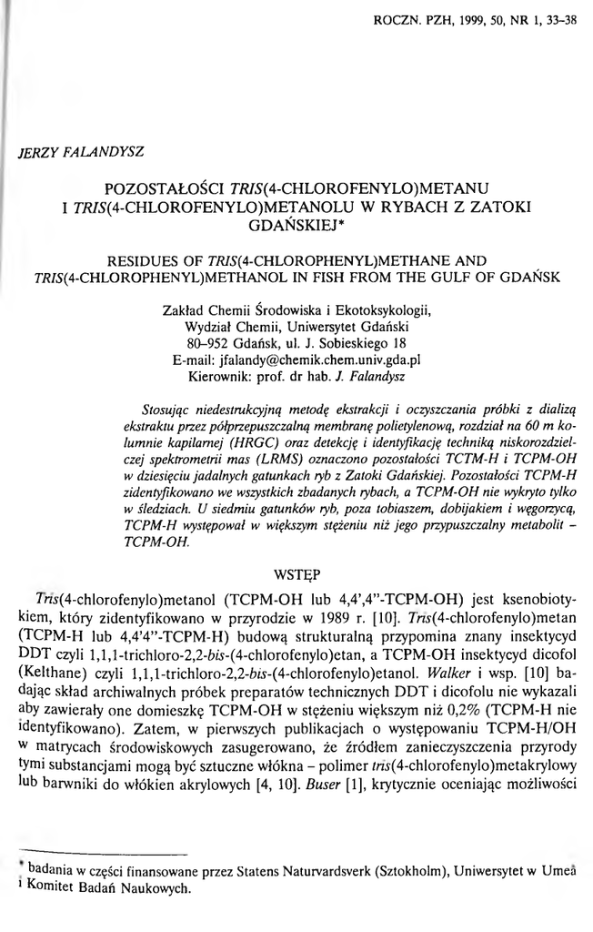 ROCZN. PZH, 1999, 50, NR 1, 33-38 JE R ZY F A LA N D YSZ P O Z O S T A Ł O Ś C I 7 7 ? /S (4 -C H L O R O F E N Y L O )M E T A N U I 7 W S (4 -C H L O R O F E N Y L O )M E T A N O L U W R Y B A C H Z Z A T O K I G D A Ń S K IE J* RESID U ES O F 77?/S(4-CHLOROPHENYL)M ETHANE AND 77?/S(4-CHLOROPHENYL)M ETHANOL IN FISH FRO M T H E G U LF O F GDAŃSK Zakład Chemii Środowiska i Ekotoksykologii, Wydział Chemii, Uniwersytet Gdański 80-952 Gdańsk, ul. J. Sobieskiego 18 E-mail: [email protected] Kierownik: prof. dr hab. J. Falandysz Stosując niedestrukcyjną metodę ekstrakcji i oczyszczania próbki z dializą ekstraktu przez pólprzepuszczalną membranę polietylenową, rozdział na 60 m ko lumnie kapilarnej (HRGC) oraz detekcję i identyfikację techniką niskorozdzielczej spektrometrii mas (LRM S) oznaczono pozostałości TCTM-H i TCPM-OH w dziesięciu jadalnych gatunkach ryb z Zatoki Gdańskiej. Pozostałości TCPM-H zidentyfikowano we wszystkich zbadanych rybach, a TCPM-OH nie wykryto tylko w śledziach. U siedmiu gatunków ryb, poza tobiaszem, dobijakiem i węgorzycą, TCPM-H występował w większym stężeniu niż jego przypuszczalny metabolit TCPM-OH. WSTĘP 7 n j(4 -c h lo ro fe n y lo )m e ta n o l (T C P M -O H lub 4,4’,4”-T C P M -O H ) je st ksen o b io ty kiem , k tó ry zidentyfikow ano w przy ro d zie w 1989 r. [10]. 7 'ra (4 -ch lo ro fen y Io )m eta n (T C P M -H lub 4 ,4 ’4 ” -T C P M -H ) b u d o w ą stru k tu ra ln ą p rzy p o m in a znan y insektycyd D D T czyli l,l,l-tric h lo ro -2 ,2 -te -(4 -c h lo ro fe n y lo )e ta n , a T C P M -O H insektycyd dicofol (K e lth a n e) czyli l,l,l-tric h lo ro -2 ,2 -te -(4 -c h lo ro fe n y lo )e ta n o l. W alker i wsp. [10] b a d ając skład archiw alnych p ró b e k p re p a ra tó w technicznych D D T i d icofolu nie w ykazali aby zaw ierały o n e dom ieszk ę T C P M -O H w stężen iu większym niż 0,2% (T C P M -H nie id entyfikow ano). Z a te m , w pierw szych publikacjach o w y stęp o w an iu T C P M -H /O H w m atry cach środow iskow ych zasu g ero w an o , że źró d łem zan ieczyszczenia przyrody tymi su b stan cjam i m ogą być sztuczne w łókna - p o lim er fra (4 -ch lo ro fen y lo )m e tak ry lo w y lub barw niki d o w łókien akrylow ych [4, 10]. B user [1], krytycznie o ce n ia jąc m ożliw ości badania w części finansowane przez Statens Naturvardsverk (Sztokholm), Uniwersytet w Umea ' Komitet Badań Naukowych. 34 J. Falandysz i ro z m ia r sto so w an ia T C P M -H i T C P M -O H w p rakty ce, zasu g ero w ał, że je s t mało p ra w d o p o d o b n e aby z n a n e o d n ied aw n a optycznie aktyw ne w łó k n a sy n tety czn e czy barw niki do w łókien akrylow ych m iały zw iązek z w ielo letn ią ju ż o b ec n o śc ią T C P M -O H w środow isku. W skład D D T te ch n ic zn e g o w chodzi głów nie 4,4’-D D T (o k o ło 7 9 % ) i 2 ,4 ’-D D T (1 6 -1 8 % ), a w m ałej części tak że su b stan cje o niezidenty fik o w an ej b u d o w ie [1]. Cyto w any a u to r [1] w ykazał, że dw ie próbki p re p a ra tu te ch n iczn eg o D D T w y p ro d u k o w a neg o w latach 1950-tych zaw ierały T C P M -H . T C P M -H p o w staje w m ałej ilości jako p ro d u k t reak cji ch lo ralu , ch lo ro b e n ze n u i oleu m - syntezy p ro w a d zo n e j w takich sam ych w aru n k ac h w jak ich odbyw a się przem ysłow a p ro d u k c ja D D T (k o n d en sacja Bayera). Z kolei p ro d u k te m reakcji D D T z bezw odnym A1C13 w ch lo ro b e n z e n ie jest 10 izo m eró w T C P M -H , a m ianow icie: 2,2’,2” -,2,2’,3”-, 2,2’,4”-, 2,3’,3” -,2,3’,4 ”-,3,3’,3”-, 2,4’,4”-,3,3’,4” -,3,4’,4”-i 4,4’,4”-T C P M -H [1]. T C P M -O H je st przypuszczalnie m e tab o lite m T C P M -H , a rea k cję hydroksylacji m iały by katalizo w ać oksygenazy. Jakkolw iek nie je st w ykluczone, że T C P M -H jest ta k że i n a innej d ro d z e przek ształcan y w środow isku w T C P M -O H [1, 4, 11]. W latach 1970-tych w ykazano, że T C P M -O H uniem ożliw ia lin ien ie ow ad ó w z a b u rzając ich rozw ój [5]. Z kolei w p rzypadku gryzoni T C P M -O H spożyw any (100 mg/kg paszy) w ciągu 28 dni p rzez szczury w yw ołuje p rz e ro st m asy w ątro b y i śled zio n y u obu płci tych zw ierząt [6]. T C P M -H i T C P M -O H to su b stan cje lipofilow e i w zg lęd n ie o d p o rn e n a wpływy d eg ra d acy jn e czynników środow iskow ych, a ich zach o w an ie się i los w p rzy ro d zie przy p o m in a h isto rię pestycydów ch loroorganicznych czy p o lich lo ro w an y ch bifenyli (P C B ) [2, 3]. O b ec n o ść T C P M -O H stw ierd zo n o w zarchiw izow anej p ró b c e p o d sk ó rn e j tkanki tłuszczow ej belu g i (D elphinapterus leucas) z rzeki Sw. W aw rzyńca z 1952 r. [4], a o s ta t n io ta k że w m leku kobiecym w e W łoszech (1992 r.; 2 ,2 -3 ,4 ng/g m asy lipidów ) i w Szwecji (1992 r.; 1,9-2,7 ng/g m .l.) [7]. T C P M -H rów nież zid en ty fik o w an o w m leku k obiecym w Szwecji (1992 r.; 1,6 ng/g m .l.) [7]. S p o śró d p ro d u k tó w żyw nościow ych T C P M -H i T C P M -O H w ykryto w oleju z m ak reli i tra n ie leczniczym otrzy m an y m z w ą tró b dorszow ych - o b a g atu n k i ryb pochodziły z M o rza P ó łn o cn e g o , a n ie w ykryto p o zo stało ści o b u tych substancji w rybach (b o n ito - tuńczyk, w łócznik, o k o ń , w ęgorz, żab n ica - naw ę i b a rw e n a ) o raz ośm iornicy p o ch odzący ch z M o rza Ś ró d ziem n eg o , a d o stęp n y ch n a rynku w e W łoszech [7]. C elem b a d a ń było o k reśle n ie sto p n ia zanieczyszczenia T C P M -H i T C P M -O H ja d a l nych g atu n k ó w ryb z Z a to k i G dańskiej. M A TERIAŁ I METODYKA Ryby do badań złowiono w sieci stawne lub żaki w Zatoce Gdańskiej w pobliżu Gdańska i Gdyni w 1992 r. Tok postępowania analitycznego obejmujący homogenizację i ekstrakcję próbek oraz oczyszczanie ekstraktu na drodze dializy p