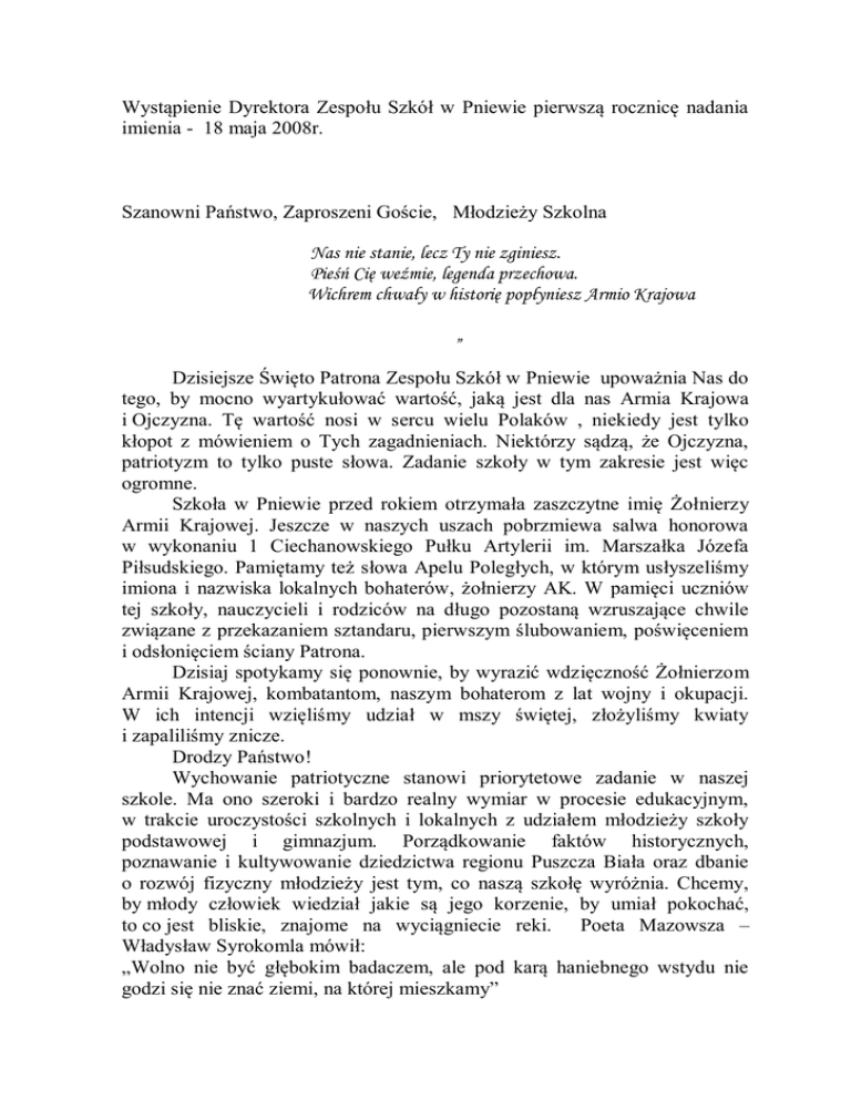Wystąpienie Dyrektora Zespołu Szkół w Pniewie pierwszą rocznicę nadania imienia - 18 maja 2008r. Szanowni Państwo, Zaproszeni Goście, Młodzieży Szkolna Nas nie stanie, lecz Ty nie zginiesz. Pieśń Cię weźmie, legenda przechowa. Wichrem chwały w historię popłyniesz Armio Krajowa „ Dzisiejsze Święto Patrona Zespołu Szkół w Pniewie upoważnia Nas do tego, by mocno wyartykułować wartość, jaką jest dla nas Armia Krajowa i Ojczyzna. Tę wartość nosi w sercu wielu Polaków , niekiedy jest tylko kłopot z mówieniem o Tych zagadnieniach. Niektórzy sądzą, że Ojczyzna, patriotyzm to tylko puste słowa. Zadanie szkoły w tym zakresie jest więc ogromne. Szkoła w Pniewie przed rokiem otrzymała zaszczytne imię Żołnierzy Armii Krajowej. Jeszcze w naszych uszach pobrzmiewa salwa honorowa w wykonaniu 1 Ciechanowskiego Pułku Artylerii im. Marszałka Józefa Piłsudskiego. Pamiętamy też słowa Apelu Poległych, w którym usłyszeliśmy imiona i nazwiska lokalnych bohaterów, żołnierzy AK. W pamięci uczniów tej szkoły, nauczycieli i rodziców na długo pozostaną wzruszające chwile związane z przekazaniem sztandaru, pierwszym ślubowaniem, poświęceniem i odsłonięciem ściany Patrona. Dzisiaj spotykamy się ponownie, by wyrazić wdzięczność Żołnierzom Armii Krajowej, kombatantom, naszym bohaterom z lat wojny i okupacji. W ich intencji wzięliśmy udział w mszy świętej, złożyliśmy kwiaty i zapaliliśmy znicze. Drodzy Państwo! Wychowanie patriotyczne stanowi priorytetowe zadanie w naszej szkole. Ma ono szeroki i bardzo realny wymiar w procesie edukacyjnym, w trakcie uroczystości szkolnych i lokalnych z udziałem młodzieży szkoły podstawowej i gimnazjum. Porządkowanie faktów historycznych, poznawanie i kultywowanie dziedzictwa regionu Puszcza Biała oraz dbanie o rozwój fizyczny młodzieży jest tym, co naszą szkołę wyróżnia. Chcemy, by młody człowiek wiedział jakie są jego korzenie, by umiał pokochać, to co jest bliskie, znajome na wyciągniecie reki. Poeta Mazowsza – Władysław Syrokomla mówił: „Wolno nie być głębokim badaczem, ale pod karą haniebnego wstydu nie godzi się nie znać ziemi, na której mieszkamy” Panie Wójcie, Szanowni Państwo, Uczniowie Zespołu Szkół w Pniewie Szlachetny Patron – Żołnierze Armii Krajowej są dla nas wymownym przykładem jak służyć Ojczyźnie, jak kształtować swoje charaktery, jak dokonywać trafnych wyborów, jak stawać się mądrym i dobrym człowiekiem. Marzeniem moim, również, nauczycieli tej szkoły, a także rodziców jest byście umieli roztropnie myśleć o Małej Ojczyźnie, byście z wdzięcznością potrafili mówić o domu rodzinnym, o swojej wiosce, o historii naszego regionu. Szanowni Zebrani! W zakończeniu swego wystąpienia chcę podziękować licznie przybyłym gościom z udział w Święcie Patrona Szkoły, ale nade wszystko pragnę wyrazić wdzięczność Księdzu Profesorowi Henrykowi Kietlińskiemu, że zechciał być w takim dniu z nami. Dziękujemy z żywą lekcję historii. Ksiądz profesor jest Kapelanem Szarych Szeregów i Kapelanem Armii Krajowej, a także honorowym Obywatelem Ziemi Wyszkowskiej. Księże Profesorze niech mi wolno będzie przytoczyć w tym momencie słowa, które wypowiedział ksiądz 20 marca 2003 roku na uroczystości nadania Honorowego Obywatelstwa Gminy Wyszków. Są One takie szczere i proste i pomogą naszej młodzieży z szacunkiem i miłością patrzeć na Małą Ojczyznę. Mówił ksiądz wówczas: „Ja przecież jestem tutejszy! Byłem obywatelem ziemi wyszkowskiej, jestem nim i , daj Boże, będę do końca życia. To jest moja mała ojczyzna, moje gniazdo, moje wszystko! (...) Wszystko w tym mieście jest mi bliskie. Jego bogata przeszłość, radosna, ciekawa, a często trudna teraźniejszość oraz niesłabnąca nadzieja na lepszą przyszłość. Kocham to miasto, tę wyszkowską ziemię i moją Puszczę Białą”. My też jesteśmy stąd i też chcemy kochać nasz region, naszą Puszczę Białą. Nauczyciele Zespołu Szkół im. Żołnierzy Armii Krajowej Pniewie choćby przez dzisiejsze spotkanie pomagają młodzieży to zagadnienie zrozumieć. A drogą do tego jest dzisiejszy program artystyczny i prezentacja dorobku szkoły oraz refleksje jakie towarzyszą naszemu spotkaniu. Zapraszam zatem do obejrzenia tego, co na dzisiejsze święto przygotowali uczniowie. Dziękuję z uwagę Wystąpienie Dyrektora Zespołu Szkół w Pniewie pierwszą rocznicę nadania imienia - 18 maja 2008r.