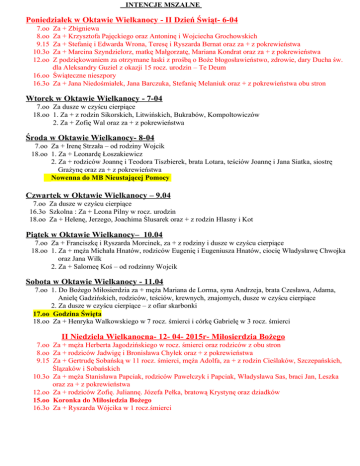 INTENCJE MSZALNE Poniedziałek w Oktawie Wielkanocy - II Dzień Świąt- 6-04 7.oo 8.oo 9.15 10.3o 12.oo Za + Zbigniewa Za + Krzysztofa Pajęckiego oraz Antoninę i Wojciecha Grochowskich Za + Stefanię i Edwarda Wrona, Teresę i Ryszarda Bernat oraz za + z pokrewieństwa Za + Marcina Szyndzielorz, matkę Małgorzatę, Mariana Kondrat oraz za + z pokrewieństwa Z podziękowaniem za otrzymane łaski z prośbą o Boże błogosławieństwo, zdrowie, dary Ducha św. dla Aleksandry Guziel z okazji 15 rocz. urodzin – Te Deum 16.oo Świąteczne nieszpory 16.3o Za + Jana Niedośmiałek, Jana Barczuka, Stefanię Melaniuk oraz + z pokrewieństwa obu stron Wtorek w Oktawie Wielkanocy - 7-04 7.oo Za dusze w czyścu cierpiące 18.oo 1. Za + z rodzin Sikorskich, Litwińskich, Bukrabów, Kompoltowiczów 2. Za + Zofię Wal oraz za + z pokrewieństwa Środa w Oktawie Wielkanocy- 8-04 7.oo Za + Irenę Strzała – od rodziny Wojcik 18.oo 1. Za + Leonardę Łoszakiewicz 2. Za + rodziców Joannę i Teodora Tiszbierek, brata Lotara, teściów Joannę i Jana Siatka, siostrę Grażynę oraz za + z pokrewieństwa Nowenna do MB Nieustającej Pomocy Czwartek w Oktawie Wielkanocy – 9.04 7.oo Za dusze w czyścu cierpiące 16.3o Szkolna : Za + Leona Pilny w rocz. urodzin 18.oo Za + Helenę, Jerzego, Joachima Ślusarek oraz + z rodzin Hlasny i Kot Piątek w Oktawie Wielkanocy– 10.04 7.oo Za + Franciszkę i Ryszarda Morcinek, za + z rodziny i dusze w czyścu cierpiące 18.oo 1. Za + męża Michała Hnatów, rodziców Eugenię i Eugeniusza Hnatów, ciocię Władysławę Chwojka oraz Jana Wilk 2. Za + Salomeę Koś – od rodzinny Wojcik Sobota w Oktawie Wielkanocy - 11.04 7.oo 1. Do Bożego Miłosierdzia za + męża Mariana de Lorma, syna Andrzeja, brata Czesława, Adama, Anielę Gadzińskich, rodziców, teściów, krewnych, znajomych, dusze w czyścu cierpiące 2. Za dusze w czyścu cierpiące – z ofiar skarbonki 17.oo Godzina Święta 18.oo Za + Henryka Walkowskiego w 7 rocz. śmierci i córkę Gabrielę w 3 rocz. śmierci II Niedziela Wielkanocna- 12- 04- 2015r- Miłosierdzia Bożego 7.oo Za + męża Herberta Jagodzińskiego w rocz. śmierci oraz rodziców z obu stron 8.oo Za + rodziców Jadwigę i Bronisława Chyłek oraz + z pokrewieństwa 9.15 Za + Gertrudę Sobańską w 11 rocz. śmierci, męża Adolfa, za + z rodzin Cieślaków, Szczepańskich, Ślązaków i Sobańskich 10.3o Za + męża Stanisława Papciak, rodziców Pawełczyk i Papciak, Władysława Sas, braci Jan, Leszka oraz za + z pokrewieństwa 12.oo Za + rodziców Zofię. Juliannę. Józefa Pełka, bratową Krystynę oraz dziadków 15.oo Koronka do Miłosiedzia Bożego 16.3o Za + Ryszarda Wójcika w 1 rocz.śmierci