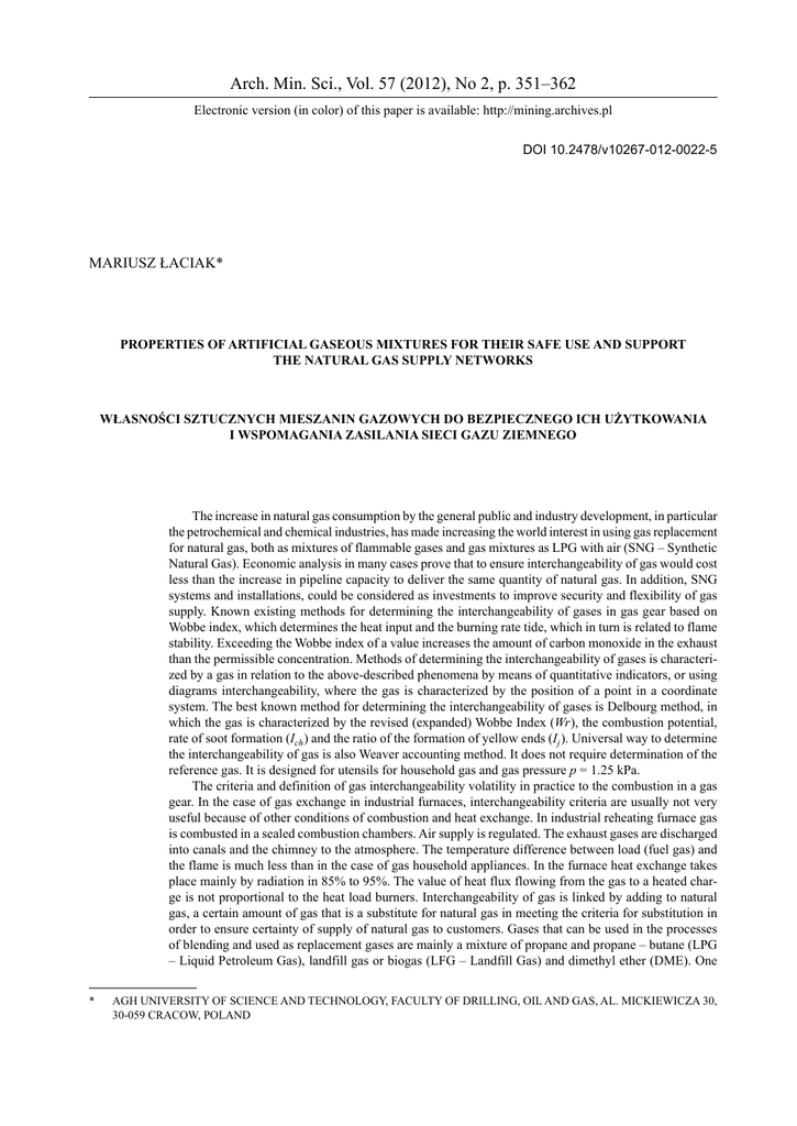 Arch. Min. Sci., Vol. 57 (2012), No 2, p. 351–362 351 Electronic version (in color) of this paper is available: http://mining.archives.pl DOI 10.2478/v10267-012-0022-5 MARIUSZ ŁACIAK* PROPERTIES OF ARTIFICIAL GASEOUS MIXTURES FOR THEIR SAFE USE AND SUPPORT THE NATURAL GAS SUPPLY NETWORKS WŁASNOŚCI SZTUCZNYCH MIESZANIN GAZOWYCH DO BEZPIECZNEGO ICH UŻYTKOWANIA I WSPOMAGANIA ZASILANIA SIECI GAZU ZIEMNEGO The increase in natural gas consumption by the general public and industry development, in particular the petrochemical and chemical industries, has made increasing the world interest in using gas replacement for natural gas, both as mixtures of flammable gases and gas mixtures as LPG with air (SNG – Synthetic Natural Gas). Economic analysis in many cases prove that to ensure interchangeability of gas would cost less than the increase in pipeline capacity to deliver the same quantity of natural gas. In addition, SNG systems and installations, could be considered as investments to improve security and flexibility of gas supply. Known existing methods for determining the interchangeability of gases in gas gear based on Wobbe index, which determines the heat input and the burning rate tide, which in turn is related to flame stability. Exceeding the Wobbe index of a value increases the amount of carbon monoxide in the exhaust than the permissible concentration. Methods of determining the interchangeability of gases is characterized by a gas in relation to the above-described phenomena by means of quantitative indicators, or using diagrams interchangeability, where the gas is characterized by the position of a point in a coordinate system. The best known method for determining the interchangeability of gases is Delbourg method, in which the gas is characterized by the revised (expanded) Wobbe Index (Wr), the combustion potential, rate of soot formation (Ich ) and the ratio of the formation of yellow ends (Ij ). Universal way to determine the interchangeability of gas is also Weaver accounting method. It does not require determination of the reference gas. It is designed for utensils for household gas and gas pressure p = 1.25 kPa. The criteria and definition of gas interchangeability volatility in practice to the combustion in a gas gear. In the case of gas exchange in industrial furnaces, interchangeability criteria are usually not very useful because of other conditions of combustion and heat exchange. In industrial reheating furnace gas is combusted in a sealed combustion chambers. Air supply is regulated. The exhaust gases are discharged into canals and the chimney to the atmosphere. The temperature difference between load (fuel gas) and the flame is much less than in the case of gas household appliances. In the furnace heat exchange takes place mainly by radiation in 85% to 95%. The value of heat flux flowing from the gas to a heated charge is not proportional to the heat load burners. Interchangeability of gas is linked by adding to natural gas, a certain amount of gas that is a substitute for natural gas in meeting the criteria for substitution in order to ensure certainty of supply of natural gas to customers. Gases that can be used in the processes of blending and used as replacement gases are mainly a mixture of propane and propane – butane (LPG – Liquid Petroleum Gas), landfill gas or biogas (LFG – Landfill Gas) and dimethyl ether (DME). One * AGH UNIVERSITY OF SCIENCE AND TECHNOLOGY, FACULTY OF DRILLING, OIL AND GAS, AL. MICKIEWICZA 30, 30-059 CRACOW, POLAND 352 of the more well-known gas mixtures used in many countries around the world to compensate for peak demands is a mixture containing about 75% of natural gas and approximately 25% propane / air (LPG / air). Also in Poland is prepared to amend the provisions in this regard (at this moment – oxygen in the gas network can not exceed 0.2%). In this paper, the calculations of interchangeability of gas mixtures LFG – LPG and LPG – air (SNG) for natural gas was made. It was determined whether the analyzed mixtures have similar stable flame zones regardless of the quality of LFG fuel and whether they may in whole or in part replace CH4, without any modification of equipment suction air for combustion. The obtained results will determine whether the fuel can be used as a replacement for natural gas used in such household appliances and, possibly, industrial burners. In connection with the possibility of changes in the quality of LFG, depending on such factors as storage time, as pre-treatment, will be determined the degree of interchangeability of LFG as a fuel mixed with regard to its quality. Keywords: Natural gas, interchangeability of gases, burning velocity, peak shaving, Liquid Petroleum Gas, propane, Landfill Gas, Wobbe Index Wzrost zużycia gazu ziemnego przez odbiorców komunalnych oraz rozwój przemysłu w szczególności petrochemicznego i chemicznego sprawił, że na całym świecie wzrosło zainteresowanie zastosowaniem gazów zamiennych za gaz ziemny, zarówno jako mieszanin gazów palnych jak i jako mieszanin gazów płynnych z powietrzem (SNG – syntetyczny gaz ziemny). Przeprowadzane analizy ekonomiczne w wielu przypadkach dowodzą, że zapewnienie wymienności paliwa gazowego kosztowało by mniej niż zwiększenie przepustowości gazociągów dla dostarczenia tej samej ilości gazu ziemnego. Ponadto systemy i instalacje SNG, można by uznać za inwestycje poprawiające bezpieczeństwo i elastyczność dostaw gazu. Znane dotychczasowe metody określania zamienności gazów w przyborach gazowych oparte są na liczbie Wobbego, która decyduje o obciążeniu cieplnym przyboru i szybkości spalania, z którą z kolei związana jest stabilność płomienia. Przekroczenie liczby Wobbego o pewną wartość powoduje wzrost ilości tlenku węgla w spalinach ponad dopuszczalne stężenie. Sposoby określające wymienność gazów charakteryzują dany gaz w odniesieniu do opisanych wyżej zjawisk przy pomocy w