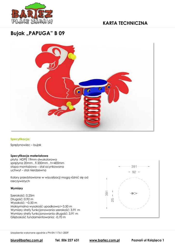 KARTA TECHNICZNA Bujak „PAPUGA” B 09 Specyfikacja: Sprężynowiec – bujak Specyfikacja materiałowa płyta HDPE 19mm dwukolorowa sprężyna 20mm , fi 200mm , h=400mm stopa montażowa – stal ocynkowana uchwyt – stal nierdzewna Kolory przedstawione w wizualizacji mogą różnić się od rzeczywistych Wymiary Szerokość: 0,25m Długość: 0,92 m Wysokość: ~0,50 m Maksymalna wysokość upadkowa:> 0,50 m Wymiary strefy funkcjonowania szerokość: 3,91 m Wymiary strefy funkcjonowania długość: 3,91 m Głębokość fundamentowania: -0,70 m Urządzenie wykonane zgodnie z PN-EN 1176:1-2009 [email protected] Tel. 506 227 631 www.bartez.com.pl Poznań ul Książęca 1