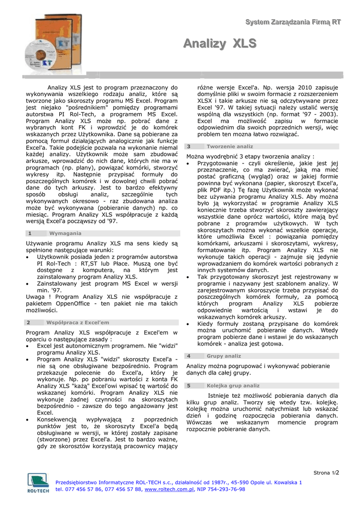 SSyysstteem m ZZaarrzząąddzzaanniiaa FFiirrm mąą R RTT Analizy XLS Analizy XLS jest to program przeznaczony do wykonywania wszelkiego rodzaju analiz, które są tworzone jako skoroszty programu MS Excel. Program jest niejako "pośrednikiem" pomiędzy programami autorstwa PI Rol-Tech, a programem MS Excel. Program Analizy XLS może np. pobrać dane z wybranych kont FK i wprowdzić je do komórek wskazanych przez Użytkownika. Dane są pobierane za pomocą formuł działających analogicznie jak funkcje Excel'a. Takie podejście pozwala na wykonanie niemal każdej analizy. Użytkownik może sam zbudować arkusze, wprowadzić do nich dane, których nie ma w programach (np. plany), powiązać komórki, stworzyć wykresy itp. Następnie przypisać formuły do poszczególnych komórek i w dowolnej chwili pobrać dane do tych arkuszy. Jest to bardzo efektywny sposób obsługi analiz, szczególnie tych wykonywanych okresowo - raz zbudowana analiza może być wykonywana (pobieranie danych) np. co miesiąc. Program Analizy XLS współpracuje z każdą wersją Excel'a począwszy od '97. 1 Wymagania Używanie programu Analizy XLS ma sens kiedy są spełnione następujące warunki: Użytkownik posiada jeden z programów autorstwa PI Rol-Tech : RT,ST lub Płace. Muszą one być dostępne z komputera, na którym jest zainstalowany program Analizy XLS. Zainstalowany jest program MS Excel w wersji min. '97. Uwaga ! Program Analizy XLS nie współpracuje z pakietem OppenOffice - ten pakiet nie ma takich możliwości. 2 Współpraca z Excel’em Program Analizy XLS współpracuje z Excel'em w oparciu o następujące zasady : Excel jest autonomicznym programem. Nie "widzi" programu Analizy XLS. Program Analizy XLS "widzi" skoroszty Excel'a nie są one obsługiwane bezpośrednio. Program przekazuje polecenie do Excel'a, który je wykonuje. Np. po pobraniu wartości z konta FK Analizy XLS "każą" Excel'owi wpisać tę wartość do wskazanej komórki. Program Analizy XLS nie wykonuje żadnej czynności na skoroszytach bezpośrednio - zawsze do tego angażowany jest Excel. Konsekwencją wypływającą z poprzednich punktów jest to, że skoroszyty Excel'a będą obsługiwane w wersji, w której zostały zapisane (stworzone) przez Excel'a. Jest to bardzo ważne, gdy ze skorosztów korzystają pracownicy mający różne wersje Excel'a. Np. wersja 2010 zapisuje domyślnie pliki w swoim formacie z rozszerzeniem XLSX i takie arkusze nie są odczytwywane przez Excel '97. W takiej sytuacji należy ustalić wersję wspólną dla wszystkich (np. format '97 - 2003). Excel ma możliwość zapisu w formacie odpowiednim dla swoich poprzednich wersji, więc problem ten mozna łatwo rozwiązać. 3 Tworzenie analiz Można wyodrębnić 3 etapy tworzenia analizy : Przygotowanie - czyli określenie, jakie jest jej przeznaczenie, co ma zwierać, jaką ma mieć postać graficzną (wygląd) oraz w jakiej formie powinna być wykonana (papier, skoroszyt Excel'a, plik PDF itp.) Tę fazę Użytkownik może wykonać bez używania programu Analizy XLS. Aby można było ją wykorzystać w programie Analizy XLS koniecznie trzeba stworzyć skoroszty zawierający wszystkie dane oprócz wartości, które mają być pobrane z programów użytkowych. W tych skoroszytach można wykonać wszelkie operacje, które umożliwia Excel : powiązania pomiędzy komórkami, arkuszami i skoroszytami, wykresy, formatowanie itp. Program Analizy XLS nie wykonuje takich operacji - zajmuje się jedynie wprowadzaniem do komórek wartości pobranych z innych systemów danych. Tak przygotowany skoroszyt jest rejestrowany w programie i nazywany jest szablonem analizy. W zarejestrowanym skoroszycie trzeba przypisać do poszczególnych komórek formuły, za pomocą których program Analizy XLS pobierze odpowiednie wartością i wstawi je do wskazwanych komórek arkuszy. Kiedy formuły zostaną przypisane do komórek można uruchomić pobieranie danych. Wtedy program pobierze dane i wstawi je do wskazanych komórek - analiza jest gotowa. 4 Grupy analiz Analizy można pogrupować i wykonywać pobieranie danych dla całej grupy. 5 Kolejka grup analiz Istnieje też możliwość pobierania danych dla kilku grup analiz. Tworzy się wtedy tzw. kolejkę. Kolejkę można uruchomić natychmiast lub wskazać dzień i godzinę rozpoczęcia pobierania danych. Wówczas we wskazanym momencie program rozpocznie pobieranie danych. Strona 1/2 Przedsiębiorstwo Informatyczne ROL-TECH s.c., działalność od 1987r., 45-590 Opole ul. Kowalska 1 tel. 077 456 57 86, 077 456 57 88, www.roltech.com.pl, NIP 754-293-76-98 A Annaalliizzyy XXLLSS Ekran 1. Analiza Koszty. Funkcje okna Formuły (z lewej strony) umożliwiają budowanie powiązań pomiędzy danymi FK ( Magazynu, itd.) a komórkami analizy Excel’a. Edycja formuły pobierającej dane z konta 400 do komórki C7 analizy. Ekran 2. Ułatwienia przy obróbce bieżącego arkusza analizy lub arkuszy większej analizy. Strona 2/2