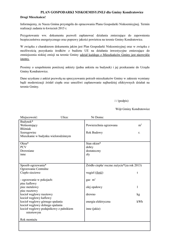 PLAN GOSPODARKI NISKOEMISYJNEJ dla Gminy Kondratowice Drogi Mieszkańcu! Informujemy, że Nasza Gmina przystąpiła do opracowania Planu Gospodarki Niskoemisyjnej. Termin realizacji zadania to kwiecień 2015 r. Przygotowanie ww. dokumentu pozwoli zaplanować działania zmierzające do zapewnienia bezpieczeństwa energetycznego oraz poprawy jakości powietrza na terenie Gminy Kondratowice. W związku z charakterem dokumentu jakim jest Plan Gospodarki Niskoemisyjnej oraz w związku z możliwością pozyskania środków z budżetu UE na działania inwestycyjne zmierzające do zmniejszenia niskiej emisji na terenie Gminy udział każdego z Mieszkańców Gminy jest niezwykle istotny. Prosimy o uzupełnienie poniższej ankiety (jedna ankieta na budynek) i jej przekazanie do Urzędu Gminy Kondratowice. Dane uzyskane z ankiet pozwolą na sprecyzowanie potrzeb mieszkańców Gminy w zakresie wymiany bądź modernizacji źródeł ciepła oraz umożliwi zaplanowanie najbardziej efektywnych działań na terenie Gminy. /-/ (podpis) Wójt Gminy Kondratowice Miejscowość: Ulica: Budynek* Wolnostojący Bliźniak Szeregowiec Mieszkanie w budynku wielorodzinnym Powierzchnia ogrzewana m2 Rok Budowy r. Okna* PCV Drewniane inne Stan okien* dobry dostateczny zły Sposób ogrzewania* Ogrzewanie Centralne Ciepło sieciowe Źródło ciepła/ roczne zużycie*(za rok 2013) - ogrzewanie w pokojach: piec kaflowy piec metalowy piec rusztowy kocioł węglowy rusztowy kocioł węglowy kaflowy kocioł węglowy górnego spalania kocioł węglowy dolnego spalania kocioł węglowy podajnikowy z palnikiem retortowym gaz m3 Rok montażu Nr Domu: węgiel (ilość) t olej opałowy l drewno kg energia elektryczna kWh inne (jakie) PLAN GOSPODARKI NISKOEMISYJNEJ dla Gminy Kondratowice Czy wykorzystywane są przez Pana/ Panią odnawialne źródła energii?* tak nie Jeśli tak, jakie Czy w gospodarstwie domowym są osoby korzystające z transportu publicznego?* tak nie Czy jest Pan/Pani zainteresowana udziałem w działaniach Gminy na rzecz redukcji CO 2 na terenie Gminy poprzez np. wymianę źródeł ciepła na niskoemisyjne?* tak nie, z powodu braku środków finansowych nie, ponieważ niedawno wymieniono/wymieniłem źródło ciepła nie, ponieważ nie widzę sensu Czu uważa Pan/Pani, że działalność kopalń na terenie Gminy wpływa negatywnie na stan środowiska? tak nie Dziękujemy za wypełnienie ankiety. *) oznaczyć właściwe Wszystkie zebrane informacje zostaną wykorzystane wyłącznie do oszacowania wielkości emisji gazów cieplarnianych oraz przygotowania Planu Gospodarki Niskoemisyjnej dla Gminy Kondratowice.