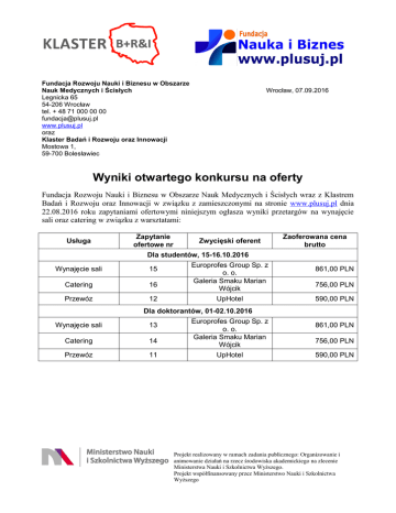 Fundacja Rozwoju Nauki i Biznesu w Obszarze Nauk Medycznych i Ścisłych Legnicka 65 54-206 Wrocław tel. + 48 71 000 00 00 [email protected] www.plusuj.pl oraz Klaster Badań i Rozwoju oraz Innowacji Mostowa 1, 59-700 Bolesławiec Wrocław, 07.09.2016 Wyniki otwartego konkursu na oferty Fundacja Rozwoju Nauki i Biznesu w Obszarze Nauk Medycznych i Ścisłych wraz z Klastrem Badań i Rozwoju oraz Innowacji w związku z zamieszczonymi na stronie www.plusuj.pl dnia 22.08.2016 roku zapytaniami ofertowymi niniejszym ogłasza wyniki przetargów na wynajęcie sali oraz catering w związku z warsztatami: Usługa Zapytanie ofertowe nr Zwycięski oferent Zaoferowana cena brutto Dla studentów, 15-16.10.2016 Wynajęcie sali 15 Catering 16 Przewóz 12 Europrofes Group Sp. z o. o. Galeria Smaku Marian Wójcik UpHotel 861,00 PLN 756,00 PLN 590,00 PLN Dla doktorantów, 01-02.10.2016 Wynajęcie sali 13 Catering 14 Przewóz 11 Europrofes Group Sp. z o. o. Galeria Smaku Marian Wójcik UpHotel 861,00 PLN 756,00 PLN 590,00 PLN Projekt realizowany w ramach zadania publicznego: Organizowanie i animowanie działań na rzecz środowiska akademickiego na zlecenie Ministerstwa Nauki i Szkolnictwa Wyższego. Projekt współfinansowany przez Ministerstwo Nauki i Szkolnictwa Wyższego