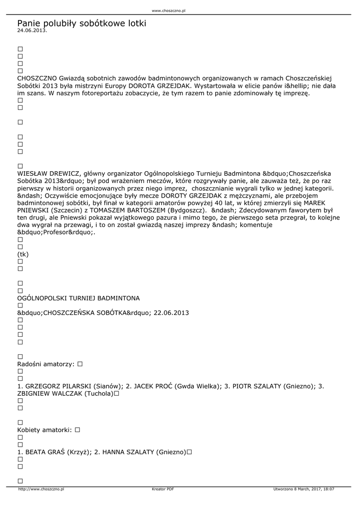Gry podwójne amatorów: 1. MAREK HOPPE (Koszalin), MARCIN GRZYWACZ (Sianów); 2. ANDRZEJ PRZYTULSKI, GRZEGORZ