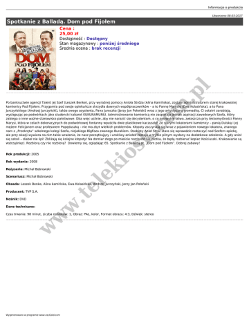 Informacje o produkcie Utworzono 08-03-2017 Spotkanie z Balladą. Dom pod Fijołem Cena : 25,00 zł .p l Dostępność : Dostępny Stan magazynowy : poniżej średniego Średnia ocena : brak recenzji io sk .c o m Po bankructwie agencji Talent jej Szef (Leszek Benke), przy wyraźnej pomocy Anioła Stróża (Alina Kamińska), zostaje administratorem starej krakowskiej kamienicy Pod Fijołem. Przygarnia pod swoje opiekuńcze skrzydła dawnych współpracowników – a to Pannę Marysię (Ewa Kolasińska), a to Pana Jurczyńskiego (Andrzej Jurczyński), także swego asystenta, Pana Jureczka (Jerzy Jan Połoński) wraz z jego artystyczną gromadką. Ci ostatni zarabiają, występując po podwórkach jako studencki kabaret KUKUNAMUNIU. Administrowanie kamienicą nie zaspokaja jednak aspiracji zawodowych Szefa, który zabiega o inne ważne stanowisko państwowe. Dba więc usilnie, aby nie narazić się decydentom, o co niezwykle łatwo, zwłaszcza przy lekkomyślności Panny Marysi, która w celach dekoracyjnych do podwórkowej fontanny wpuściła dwie plastikowe kaczuszki! Ze starymi lokatorami kamienicy – panią Dulską i jej mężem Felicjanem oraz profesorem Popęduszką – nie ma zbyt wielkich problemów. Kłopoty zaczynają się wraz z pojawieniem nowego lokatora, znanego nam z „Przekrętu” szkolnego kolegi Szefa, niejakiego Bigfisza zwanego Burakiem. Osobisty Anioł Stróż stara się wprawdzie roztoczyć nad Szefem opiekę, ale przy okazji wywiera na nim takie wrażenie, że nasz początkujący i urokliwy aniołek zostaje w trybie pilnym wysłany na dodatkowe szkolenie. A gdy anioł się szkoli – diabeł nie śpi! Zbliżają się kolejne kłopoty! Na domiar złego po mieście rozchodzi się plotka, że będą rozbierać kopiec Kościuszki. Krakowianie są wstrząśnięci. Rozbiorą czy nie rozbiorą? Dowiemy się, oglądając 65. Spotkanie z Balladą pt. „Dom pod Fijołem”. Dobrej zabawy! Rok produkcji: 2005 ek Rok wydania: 2008 Reżyseria: Michał Bobrowski .t el Scenariusz: Michał Bobrowski Obsada: Leszek Benke, Alina kamińska, Ewa Kolasińska, Andrzej Jurczyński, Jerzy Jan Połoński Producent: TVP S.A. Dane techniczne: w Nośnik: DVD w w Czas trwania: 98 minut, Liczba nośników: 1, Obraz: PAL, kolor, Format obrazu: 4:3, Dźwięk: stereo Wygenerowano w programie www.oscGold.com