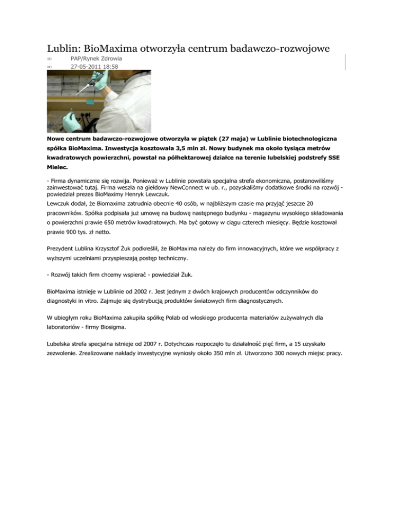 Lublin: BioMaxima otworzyła centrum badawczo-rozwojowe • • PAP/Rynek Zdrowia 27-05-2011 18:58 Nowe centrum badawczo-rozwojowe otworzyła w piątek (27 maja) w Lublinie biotechnologiczna spółka BioMaxima. Inwestycja kosztowała 3,5 mln zł. Nowy budynek ma około tysiąca metrów kwadratowych powierzchni, powstał na półhektarowej działce na terenie lubelskiej podstrefy SSE Mielec. - Firma dynamicznie się rozwija. Ponieważ w Lublinie powstała specjalna strefa ekonomiczna, postanowiliśmy zainwestować tutaj. Firma weszła na giełdowy NewConnect w ub. r., pozyskaliśmy dodatkowe środki na rozwój powiedział prezes BioMaximy Henryk Lewczuk. Lewczuk dodał, że Biomaxima zatrudnia obecnie 40 osób, w najbliższym czasie ma przyjąć jeszcze 20 pracowników. Spółka podpisała już umowę na budowę następnego budynku - magazynu wysokiego składowania o powierzchni prawie 650 metrów kwadratowych. Ma być gotowy w ciągu czterech miesięcy. Będzie kosztował prawie 900 tys. zł netto. Prezydent Lublina Krzysztof Żuk podkreślił, że BioMaxima należy do firm innowacyjnych, które we współpracy z wyższymi uczelniami przyspieszają postęp techniczny. - Rozwój takich firm chcemy wspierać - powiedział Żuk. BioMaxima istnieje w Lublinie od 2002 r. Jest jednym z dwóch krajowych producentów odczynników do diagnostyki in vitro. Zajmuje się dystrybucją produktów światowych firm diagnostycznych. W ubiegłym roku BioMaxima zakupiła spółkę Polab od włoskiego producenta materiałów zużywalnych dla laboratoriów - firmy Biosigma. Lubelska strefa specjalna istnieje od 2007 r. Dotychczas rozpoczęło tu działalność pięć firm, a 15 uzyskało zezwolenie. Zrealizowane nakłady inwestycyjne wyniosły około 350 mln zł. Utworzono 300 nowych miejsc pracy.