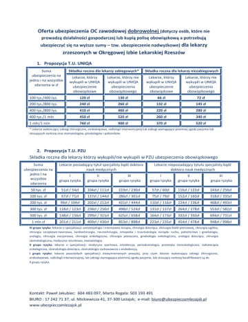 Oferta ubezpieczenia OC zawodowej dobrowolnej (dotyczy osób, które nie prowadzą działalności gospodarczej lub kupią polisę obowiązkową a potrzebują ubezpieczyć się na wyższe sumy – tzw. ubezpieczenie nadwyżkowe) dla lekarzy zrzeszonych w Okręgowej Izbie Lekarskiej Rzeszów 1. Propozycja T.U. UNIQA Suma ubezpieczenia na jedno i na wszystkie zdarzenia w zł Składka roczna dla lekarzy zabiegowych* Składka roczna dla lekarzy niezabiegowych Lekarze, którzy wykupili w UNIQA ubezpieczenie obowiązkowe Lekarze, którzy nie wykupili w UNIQA ubezpieczenia obowiązkowego Lekarze, którzy wykupili w UNIQA ubezpieczenie obowiązkowe Lekarze, którzy nie wykupili w UNIQA ubezpieczenia obowiązkowego 100 tys./400 tys. 120 zł 130 zł 66 zł 72 zł 200 tys./800 tys. 240 zł 260 zł 132 zł 145 zł 400 tys./800 tys. 410 zł 460 zł 220 zł 280 zł 400 tys./1 mln 450 zł 520 zł 260 zł 340 zł 1 mln/1 mln 760 zł 900 zł 370 zł 520 zł * Lekarze wykonujący zabiegi chirurgiczne, endoskopowe, radiologii interwencyjnej lub zabiegi wymagające pisemnej zgody pacjenta lub stosujących narkozę oraz stomatologów, ginekologów i położników 2. Propozycja T.U. PZU Składka roczna dla lekarzy którzy wykupili/nie wykupili w PZU ubezpieczenia obowiązkowego Suma ubezpieczenia na jedno i na wszystkie zdarzenia Lekarze posiadający tytuł specjalisty bądź doktora nauk medycznych Lekarze nieposiadający tytułu specjalisty bądź doktora nauk medycznych I grupa ryzyka II grupa ryzyka III grupa ryzyka I grupa ryzyka II grupa ryzyka III grupa ryzyka 50 tys. zł 51zł / 54zł 104zł / 111zł 219zł / 230zł 57zł / 60zł 116zł / 123zł 243zł / 256zł 100 tys. zł 67zł / 71zł 137zł / 144zł 286zł / 301zł 75zł / 79zł 152zł / 160zł 318zł / 335zł 200 tys. zł 99zł / 104zł 202zł / 212zł 421zł / 444zł 110zł / 116zł 224zł / 236zł 468zł / 493zł 300 tys. zł 118zł / 123zł 238zł / 250zł 498zł / 524zł 131zł / 137zł 264zł / 278zł 553zł / 582zł 500 tys. zł 148zł / 156zł 299zł / 315zł 625zł / 658zł 164zł / 173zł 332zł / 350zł 694zł / 731zł 1 mln zł 201zł / 211zł 409zł / 430zł 853zł / 898zł 223zł / 235zł 454zł / 478zł 948zł / 998zł III grupa ryzyka: lekarze o specjalizacji: anestezjologia i intensywna terapia, chirurgia dziecięca, chirurgia klatki piersiowej, chirurgia ogólna, chirurgia szczękowo-twarzowa, kardiochirurgia, neurochirurgia, ortopedia i traumatologia narządu ruchu, położnictwo i ginekologia, urologia, chirurgia naczyniowa, chirurgia onkologiczna, chirurgia plastyczna, ginekologia onkologiczna, urologia dziecięca, chirurgia stomatologiczna, medycyna ratunkowa, neonatologia. II grupa ryzyka: lekarze o specjalizacji: medycyna sportowa, ortodoncja, periodontologia, protetyka stomatologiczna, radioterapia onkologiczna, stomatologia dziecięca, stomatologia zachowawcza z endodoncją. I grupa ryzyka: lekarze pozostałych specjalizacji niewymienionych powyżej, przy czym lekarze wykonujący zabiegi chirurgiczne, endoskopowe, radiologii interwencyjnej, lub zabiegi wymagające pisemnej zgody pacjenta, lub stosujący narkozę kwalifikowani są do II grupy ryzyka. Kontakt: Paweł Jakubiec: 604 483 097, Marta Rogala: 503 193 491 BIURO : 17 242 71 37, ul. Mickiewicza 41, 37-300 Leżajsk; e-mail: [email protected] www.ubezpieczamlezajsk.pl