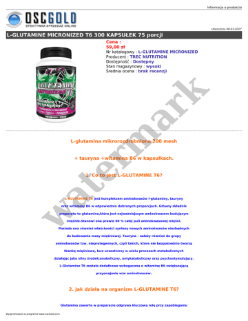 Informacje o produkcie Utworzono 08-03-2017 L-GLUTAMINE MICRONIZED T6 300 KAPSUŁEK 75 porcji Cena : 59,00 zł er m ar k Nr katalogowy : L-GLUTAMINE MICRONIZED Producent : TREC NUTRITION Dostępność : Dostępny Stan magazynowy : wysoki Średnia ocena : brak recenzji L-glutamina mikrorozdrobniona 200 mesh + tauryna +witamina B6 w kapsułkach. at 1. Co to jest L-GLUTAMINE T6? L-GLUTAMINE T6 jest kompleksem aminokwasów l-glutaminy, tauryny w oraz witaminy B6 w odpowiednio dobranych proporcjach. Główny składnik preparatu to glutamina,która jest najważniejszym aminokwasem budującym mięśnie.Stanowi ona prawie 60 % całej puli aminokwasowej mięśni. Posiada ona również właściwości syntezy nowych aminokwasów niezbędnych do budowania masy mięśniowej. Tauryna - należy również do grupy aminokwasów tzw. nieprotegennych, czyli takich, które nie bezpośrednio tworzą tkankę mięśniową, lecz uczestniczy w wielu procesach metabolicznych działając jako silny środek:anaboliczny, antykataboliczny oraz psychostymulujący. L-Glutamine T6 została dodatkowo wzbogacona o witaminę B6 zwiększającą przyswajanie w/w aminokwasów. 2. Jak działa na organizm L-GLUTAMINE T6? Glutamina zawarta w preparacie odgrywa kluczową rolę przy zapobieganiu Wygenerowano w programie www.oscGold.com stanom przemęczenia i przetrenowania. W wyniku intensywnego treningu dochodzi do katabolizmu, czyli rozpadu białek, które są podstawowym budulcem mięśni. Zbyt duży ich rozpad uniemożliwia przyrost masy mięśniowej. Zadaniem glutaminy jest powstrzymanie tego negatywnego dla organizmu procesu. Jest to tzw. działanie antykataboliczne. Działanie glutaminy na przyrost masy mięśni polega też na zwiększeniu uwodnienia komórek mięśniowych, przez co zwiększa się ich objętość, a co za tym idzie obwód mięśnia. Zwiększone uwodnienie komórek to sygnał anaboliczny - stymulujący syntezę białek oraz glikogenu (głównego energetyka procesu skurczu mięśnia). Glutamina podwyższa odporność organizmu biorąc udział er m ar k w tworzeniu antyoksydantów oraz glutationu, substancji warunkującej tempo i poziom namnażania komórek układu odpornościowego. Badania wykazały, że glutamina podwyższa poziom hormonu wzrostu, który jest podstawowym hormonem odpowiadającym za przyrost masy mięśniowej. Preparat został dodatkowo wzbogacony o witaminę B6 zwiększającą przyswajanie aminokwasów oraz taurynę, która wpływa energetyzująco na organizm. Tauryna - wspomaga odkładanie glikogenu oraz blokuje wydzielanie serotoniny, hormonu odpowiedzialnego za uczucie zmęczenia. Ma ona również bezpośrednie oddziaływanie na tworzenie się tkanki mięśniowej, bierze, bowiem udział w procesie syntezy (budowania) białek ustrojowych. Tauryna należy również do grupy antyoksydantów, które neutralizują wolne rodniki. at 3. Kto powinien stosować L-GLUTAMINE T6? Zwiększone zapotrzebowanie pojawia się przede wszystkim u ciężko trenujących kulturystów oraz sportowców trenujących sporty siłowe. w W przypadku niedoboru glutaminy oraz tauryny organizm musi wytwarzać je z innych aminokwasów, co jest bardzo kosztownym procesem biorąc pod uwagę straty ilościowe i jakościowe innych niezbędnych aminokwasów potrzebnych do budowania mięśni. Powoduje to spowolnienie regeneracji mięśni, co często objawia się: zatrzymaniem wzrostu masy mięśniowej, spadkiem siły, przemęczeniem psychicznym. Aby zapobiec tym negatywnym procesom należy dostarczać odpowiednie ilości glutaminy oraz tauryny. Stosowanie L-Glutamine T6 pomaga osiągnąć szczytową formę sportową wszystkim zawodnikom, którym zależy na zdobyciu wysokojakościowej muskulatury. 4. Gwarancja jakości produktu! L-Glutamina firmy Trec Nutrition jest wyprodukowana przez japońskie Informacje o produkcie laboratorium Kyowa Hakko Kogyo Co. Produkt ten charakteryzuje się najwyższą czystością oraz minimalną wielkością cząstek (mikrorozdrobnienie), daje nam to maksymalną wchłanialność do organizmu. L-Glutamine T6 jest śnieżnobiałym proszkiem o bardzo dobrej rozpuszczalności. Produkt może ulegać zbryleniu - jest naturalnym procesem spowodowanym higroskopijnością l-glutaminy. W żaden sposób nie wpływa to na pogorszenie jakości produktu. 5. Zapamiętaj!!! Podczas intensywnego treningu organizm zużywa około 30-40 g glutaminy er m ar k oraz 2- 4 g tauryny, a wysoki ich poziom niezbędny jest do budowania twoich mięśni. Straty masy mięśniowej bez uzupełnienia w/w aminokwasów mogą sięgać nawet do 300 g w ciągu doby. Dlatego nie oszczędzaj na tych aminokwasach! "Przeładowanie" białkiem nie jest najwłaściwszą drogą do rozwoju masy mięśniowej lepiej spożywać go mniej, a dietę uzupełniać suplementami zawierającymi glutaminę oraz taurynę. Sposób użycia: Zapotrzebowanie na glutaminę oraz taurynę wzrasta w stanach największego katabolizmu, (czyli w okresie ujemnego bilansu azotowego), dlatego powinno się ją stosować w takich okresach jak: - bezpośrednio Sposób użycia: w at po przebudzeniu, - bezpośrednio po treningu, - przed snem W dni treningowe: L-GLUTAMINE T6 najlepiej przyjmować: rano 2 g (3 kaps) , bezpośrednio po treningu od 4 - 8g (6-12 kaps) oraz przed snem 2 g (3 kaps.) W dni nietreningowe: L-GLUTAMINE T6 najlepiej przyjmować: 3 razy dziennie po 2 g (3kaps), co 6 godz. L-GLUTAMINE T6 zaleca się łączyć z kreatyną i dekstrozą szczególnie po treningu. Wygenerowano w programie www.oscGold.com