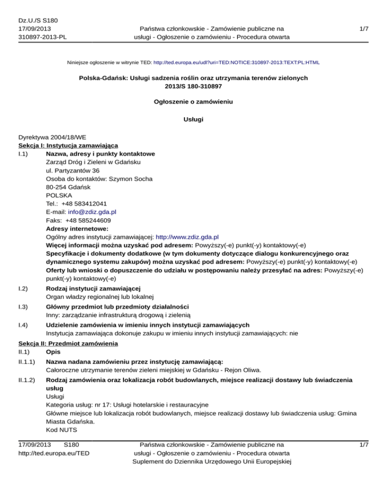 Dz.U./S S180 17/09/2013 310897-2013-PL Państwa członkowskie - Zamówienie publiczne na usługi - Ogłoszenie o zamówieniu - Procedura otwarta 1/7 Niniejsze ogłoszenie w witrynie TED: http://ted.europa.eu/udl?uri=TED:NOTICE:310897-2013:TEXT:PL:HTML Polska-Gdańsk: Usługi sadzenia roślin oraz utrzymania terenów zielonych 2013/S 180-310897 Ogłoszenie o zamówieniu Usługi Dyrektywa 2004/18/WE Sekcja I: Instytucja zamawiająca I.1) Nazwa, adresy i punkty kontaktowe Zarząd Dróg i Zieleni w Gdańsku ul. Partyzantów 36 Osoba do kontaktów: Szymon Socha 80-254 Gdańsk POLSKA Tel.: +48 583412041 E-mail: [email protected] Faks: +48 585244609 Adresy internetowe: Ogólny adres instytucji zamawiającej: http://www.zdiz.gda.pl Więcej informacji można uzyskać pod adresem: Powyższy(-e) punkt(-y) kontaktowy(-e) Specyfikacje i dokumenty dodatkowe (w tym dokumenty dotyczące dialogu konkurencyjnego oraz dynamicznego systemu zakupów) można uzyskać pod adresem: Powyższy(-e) punkt(-y) kontaktowy(-e) Oferty lub wnioski o dopuszczenie do udziału w postępowaniu należy przesyłać na adres: Powyższy(-e) punkt(-y) kontaktowy(-e) I.2) Rodzaj instytucji zamawiającej Organ władzy regionalnej lub lokalnej I.3) Główny przedmiot lub przedmioty działalności Inny: zarządzanie infrastrukturą drogową i zielenią I.4) Udzielenie zamówienia w imieniu innych instytucji zamawiających Instytucja zamawiająca dokonuje zakupu w imieniu innych instytucji zamawiających: nie Sekcja II: Przedmiot zamówienia II.1) Opis II.1.1) Nazwa nadana zamówieniu przez instytucję zamawiającą: Całoroczne utrzymanie terenów zieleni miejskiej w Gdańsku - Rejon Oliwa. II.1.2) Rodzaj zamówienia oraz lokalizacja robót budowlanych, miejsce realizacji dostawy lub świadczenia usług Usługi Kategoria usług: nr 17: Usługi hotelarskie i restauracyjne Główne miejsce lub lokalizacja robót budowlanych, miejsce realizacji dostawy lub świadczenia usług: Gmina Miasta Gdańska. Kod NUTS 17/09/2013 S180 http://ted.europa.eu/TED Państwa członkowskie - Zamówienie publiczne na usługi - Ogłoszenie o zamówieniu - Procedura otwarta Suplement do Dziennika Urzędowego Unii Europejskiej 1/7 Dz.U./S S180 17/09/2013 310897-2013-PL Państwa członkowskie - Zamówienie publiczne na usługi - Ogłoszenie o zamówieniu - Procedura otwarta 2/7 II.1.3) Informacje na temat zamówienia publicznego, umowy ramowej lub dynamicznego systemu zakupów (DSZ) Ogłoszenie dotyczy zamówienia publicznego II.1.4) Informacje na temat umowy ramowej II.1.5) Krótki opis zamówienia lub zakupu Przedmiotem zamówienia jest kompleksowa usługa całorocznego utrzymania terenów zieleni miejskiej w Gdańsku, w tym: parków, zieleńców oraz zieleni wzdłuż dróg komunikacyjnych, a także terenów zieleni nieurządzonej bez wyznaczonego administratora do dnia 31.8.2016 r. II.1.6) Wspólny Słownik Zamówień (CPV) 77310000, 77313000, 90511300, 90620000 II.1.7) Informacje na temat Porozumienia w sprawie zamówień rządowych (GPA) Zamówienie jest objęte Porozumieniem w sprawie zamówień rządowych (GPA): nie II.1.8) Części To zamówienie podzielone jest na części: nie II.1.9) Informacje o ofertach wariantowych Dopuszcza się składanie ofert wariantowych: nie II.2) Wielkość lub zakres zamówienia II.2.1) Całkowita wielkość lub zakres: Zakres terenowy niniejszego zamówienia obejmuje utrzymanie ok. 125 ha terenów zieleni położonych w granicach administracyjnych miasta Gdańsk w rejonie Oliwa. Zakres rzeczowy zamówienia obejmuje usługi, na które składają się następujące grupy prac utrzymaniowych: a) prace porządkowe – utrzymanie czystości i porządku na terenie parków i zieleńców (z wyłączeniem pasów drogowych), utrzymanie zimowe wybranych przejść pieszych, placów i schodów terenowych położonych w obrębie parków i zieleńców miejskich oraz przylegających do tych obiektów, b) prace ogrodnicze - pielęgnacja i konserwacja zieleni niskiej (trawniki, kwietniki, krzewy), c) prace z zakresu konserwacji małej architektury - utrzymanie i konserwacja nawierzchni i elementów małej architektury stanowiących wyposażenie urządzonych terenów zieleni miejskiej. II.2.2) Informacje o opcjach Opcje: nie II.2.3) Informacje o wznowieniach Jest to zamówienie podlegające wznowieniu: nie II.3) Czas trwania zamówienia lub termin realizacji Okres w miesiącach: 34 (od udzielenia zamówienia) Sekcja III: Informacje o charakterze prawnym, ekonomicznym, finansowym i technicznym III.1) Warunki dotyczące zamówienia III.1.1) Wymagane wadia i gwarancje: Wadium nalezy wnieść w wysokosci 20 000,00 PLN. III.1.2) Główne warunki finansowe i uzgodnienia płatnicze i/lub odniesienie do odpowiednich przepisów je regulujących: III.1.3) Forma prawna, jaką musi przyjąć grupa wykonawców, której zostanie udzielone zamówienie: Zgodnie z art. 23 ustawy Pzp np. konsorcjum. III.1.4) Inne szczególne warunki 17/09/2013 S180 http://ted.europa.eu/TED Państwa członkowskie - Zamówienie publiczne na usługi - Ogłoszenie o zamówieniu - Procedura otwarta Suplement do Dziennika Urzędowego Unii Europejskiej 2/7 Dz.U./S S180 17/09/2013 310897-2013-PL Państwa członkowskie - Zamówienie publiczne na usługi - Ogłoszenie o zamówieniu - Procedura otwarta 3/7 Wykonanie zamówienia podlega szczególnym warunkom: nie III.2) Warunki udziału III.2.1) Sytuacja podmiotowa wykonawców, w tym wymogi związane z wpisem do rejestru zawodowego lub handlowego Informacje i formalności konieczne do dokonania oceny spełniania wymogów: 1) Aktualny odpis z właściwego rejestru lub z centralnej ewidencji i informacji o działalności gospodarczej, jeżeli odrębne przepisy wymagają wpisu do rejestru lub ewidencji, w celu wskazania braku podstaw do wykluczenia w oparciu o art. 24 ust.1 pkt.2 ustawy, wystawionego nie wcześniej niż 6 miesięcy przed upływem terminu składania ofert. 2) Aktualne zaświadczenie właściwego naczelnika urzędu skarbow