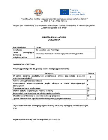 Projekt: „Dwa modele wsparcia zawodowego absolwentów szkół wyższych” nr 2013-1-PL1-LEO02-37513 Projekt jest realizowany przy wsparciu finansowym Komisji Europejskiej w ramach programu „Uczenie się przez całe życie” ANKIETA EWALUACYJNA UCZESTNIKA Kraj docelowy Instytucja Okres podlegający ewaluacji Imię i nazwisko Lotwa De Luca Lex Law Firm Riga Ewaluacja końcowa + ewaluacja podsumowująca staż Jakub EWALUACJA KOŃCOWA: Przyjmując skalę od 1-10, proszę ocenić następujące elementy: Kategoria W jakim stopniu częstotliwość wypełniania ankiet odpowiada bieżącym potrzebom projektu? Nabyte umiejętności zawodowe Intensywność wykorzystywania języka obcego w czasie wykonywanych obowiązków Poprawa poziomu językowego Wpływ pobytu za granicą na rozwój osobisty Adaptacja i zaznajomienie się z kulturą obcego kraju Współpraca z Uczelnią w zakresie realizacji projektu Ogólne zadowolenie z pobytu w okresie podlegającym ewaluacji Ocena 5 9 9 10 10 7 10 7 Czy w trakcie okresu podlegającego końcowej ewaluacji wystąpiły trudne sytuacje? brak W jaki sposób zostały one rozwiązane? (jeśli dotyczy) 1 EWALUACJA PODSUMOWUJĄCA STAŻ: Przyjmując skalę od 1-10, proszę ocenić następujące elementy: Kategoria W jakim stopniu jest Pan/Pani zadowolony/a z decyzji o uczestnictwie w projekcie? W jakim stopniu projekt przyczynił się do poprawy atrakcyjności Pana/Pani profilu na rynku pracy? W jakim stopniu projekt wpłynął na Pana/Pani przyszłe plany zawodowe? W jakim stopniu projekt przyczynił się do Pana/Pani rozwoju osobistego? Jak ocenia Pan/Pani organizację realizacji projektu przez Uczelnię? Jak ocenia Pan/Pani pomoc Uczelni podczas Pana/Pani uczestnictwa w projekcie? W jakim stopniu podoba się Panu/Pani inicjatywa Uczelni w kierunku zagranicznego rozwoju zawodowego absolwentów Uczelni? Proszę wymienić 3 największe zalety uczestnictwa w zrealizowanym projekcie: 1. Poprawa umiejetnosci jezykowych 2. Praca w miedzynarodowym srodowisku 3. Poznanie swoich mocnych i slabych stron Proszę wymienić 3 wady uczestnictwa w zrealizowanym projekcie: 1. 2. 3. 2 Ocena 10 10 10 10 10 10 10 1. W jaki sposób dowiedział się Pan/Pani o możliwości uczestnictwa w projekcie? Z ogloszenia przeslanego na maila 2. Czy ma Pan/Pani uwagi co do przeprowadzonego procesu rekrutacji? brak 3. Czy zasady rekrutacji i wymagania formalne zostały jasno określone? tak 4. W jaki sposób znalazł/a Pan/i zakwaterowanie w mieście odbywania stażu? Proszę podać praktyczne wskazówki dla przyszłych stażystów (np. stronę internetową, na której można znaleźć oferty zakwaterowania, dane do osoby kontaktowej). Strona internetowa ss.lv 5. Czy uważa Pan/Pani, że zakwaterowanie powinno zostać organizowane przez Uczelnię? nie 6. Czy uważa Pan/Pani, że ubezpieczenie powinno zostać organizowane przez Uczelnię? nie 7. Czy uważa Pan/Pani, że podróż powinna zostać organizowana przez Uczelnię? nie 8. Czy został Pan/Pani należycie poinformowany o wszystkich ważnych kwestiach przed wyjazdem? Jeżeli nie, proszę wskazać jakich informacji brakowało. tak 9. Proszę opisać profil działalności instytucji oraz zakres realnie wykonywanych obowiązków. Miedzynarodowa kancelaria prawnicza obslugujaca glownie wloskich klientow na rynku baltyckim w zakresie doradztwa prawnego, podatkowego i inwestycyjnego. 10. Czy ma Pan/Pani zastrzeżenia co do stażu odbytego w danej instytucji? Jeżeli tak, proszę opisać jakie. brak 11. Czy był Pan/Pani należycie informowany/a przez Uczelnię o wymaganych formalnościach podczas kolejnych etapów stażu? tak 12. Jakie najczęstsze problemy pojawiały się podczas uczestnictwa w projekcie? brak 12a. W jaki sposób zostały one rozwiązane? 13. Proszę wskazać Pana hipotetyczną sytuację zawodową, która miałaby miejsce, gdyby nie zdecydowałby/łaby się Pan/Pani na uczestnictwo w projekcie. Praca w urzedzie 14. Czy rozważa Pan/Pani pracę za granicą w przyszłości? tak 14a. W jaki sposób na tą decyzję wpływa uczestnictwo w programie Leonardo da Vinci? Poprawa umiejetnosci jezykowych i praca w miedzynarodowym srodowisku 15. Czy poleca Pan/Pani wyjazd w ramach programu Leonardo Da Vinci? tak 3 16. Co doradziłby/aby Pan/Pani kolejnym, potencjalnym uczestnikom projektów realizowanych w ramach programu Leonardo da Vinci? Kontakt z firma docelowa przed wyjazdem i dokladne ustalenie zakresu obowiazkow. 17. Proszę opisać proponowane modyfikacje, mające na celu usprawnienie organizacji i podniesienie jakości projektów realizowanych w ramach programu Leonardo da Vinci na Uczelni Łazarskiego. Dodatkowe uwagi: 4