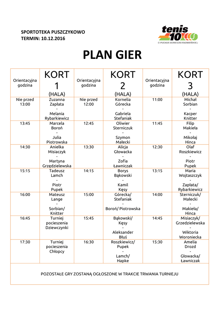SPORTOTEKAPUSZCZYKOWO TERMIN:10.12.2016 PLANGIER Orientacyjna godzina KORT 1 Orientacyjna godzina (HALA) Nie przed 13:00 13:45 14:30 15:15 16:00 16:45 17:30 KORT 2 Orientacyjna godzina KORT 3 (HALA) Zuzanna Zapłata Melania Rybarkiewicz Marcela Boroń Julia Piotrowska Anielka Misiaczyk Martyna Grzędzielewska Tadeusz Lamch Piotr Pupek Mateusz Lange Sorbian/ Knitter Turniej pocieszenia Dziewczynki Nie przed 12:00 Turniej pocieszenia Chłopcy 16:30 12:45 13:30 14:15 15:00 15:45 (HALA) Kornelia Górecka Gabriela Stefaniak Oliwier Sterniczuk Szymon Małecki Alicja Głowacka Zofia Ławniczak Borys Bąkowski Kamil Kęsy Górecka/ Stefaniak Boroń/ Piotrowska 11:00 Bąkowski/ Kęsy Aleksander Błuś Roszkiewicz/ Pupek Lamch/ Hapke 14:45 11:45 12:30 13:15 14:00 15:30 Michał Sorbian Kacper Knitter Filip Makieła Mikołaj Hinca Olaf Roszkiewicz Piotr Pupek Maria Wojtaszczyk Zapłata/ Rybarkiewicz Sterniczuk/ Małecki Makieła/ Hinca Misiaczyk/ Grzedzielewska Wiktoria Woroniecka Amelia Drozd Głowacka/ Ławniczak POZOSTAŁE GRY ZOSTANĄ OGŁOSZONE W TRAKCIE TRWANIA TURNIEJU