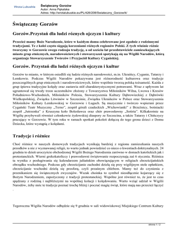 Świąteczny Gorzów Autor: Anna Pękalska Adres: http://wrotalubuskie.eu/PL/426/208/Swiateczny_Gorzow/k/ Świąteczny Gorzów Gorzów.Przystań dla ludzi róznych ojczyzn i kultury Przecież mamy Boże Narodzenie, które w każdym domu celebrowane jest zgodnie z rodzinnymi tradycjami. Te z kolei często sięgają korzeniami różnych regionów Polski. Z tych właśnie różnic tworzymy w Gorzowie swego rodzaju tradycję, a od sześciu lat przedstawiciele zamieszkujących miasto grup etnicznych, narodowościowych i stowarzyszeń spotykają się na Wigilii Narodów, którą organizuje Stowarzyszenie Twórców i Przyjaciół Kultury Cygańskiej. Gorzów. Przystań dla ludzi różnych ojczyzn i kultur Gorzów to miasto, w którym osiedlili się ludzie różnych narodowości, m.in. Ukraińcy, Cyganie, Tatarzy i Łemkowie. Podczas Wigilii Narodów pokazywana jest różnorodność kulturowa oraz tradycje poszczególnych grup etnicznych i narodowościowych, które wspólnie tworzą polską tożsamość. Każda z grup śpiewa tradycyjne kolędy oraz zastawia stół charakterystycznymi potrawami. Wraz z upływem lat ugruntował się trwały trzon uczestników złożony z Towarzystwa Miłośników Wilna, Lwowa i Kresów Południowo-Wschodnich, Miłośników Polesia, Stowarzyszenia Kultury Dąbrowieckiej z Dąbrówki Wielkopolskiej, Związku Litwinów w Szczecinie, Związku Ukraińców w Polsce oraz Stowarzyszenia Miłośników Kultury Łemkowskiej w Gorzowie i Ługach. Są muzycznie i twórczo wspierani przez Cygański Teatr Muzyczny „Terno”, zespół górali czadeckich „Wichowianki” z Brzeźnicy, bośniacki zespół „Jutrzenka” z Kruszyna koło Bolesławca oraz chór prawosławny „Sotiria”. Kilkakrotnie na Wigilię przybywali również członkowie żydowskiej diaspory ze Szczecina, a także Tatarzy i Chińczycy pracujący w Gorzowie. W tym roku w ramach spotkań pokoleń dołączą do tego grona dzieci z Domu Dziecka, które wystąpią z kolędami. Tradycje i różnice Choć różnice w naszych domowych tradycjach wynikają bardziej z regionu zamieszkania naszych przodków a nie z wyznawanej religii, to warto jednak powiedzieć co nieco o kwestiach doktrynalnych. 24 grudnia to dzień uroczyście obchodzonej Wigilii Bożego Narodzenia zarówno w domach katolickich jak i protestanckich. Wierni grekokatoliccy i prawosławni świętowanie rozpoczynają zaś 6 stycznia. Różnica ta wynika z posługiwania się kalendarzem juliańskim obowiązującym w religiach chrześcijańskich obrządku wschodniego. Podczas gdy chrześcijanie zachodni dzielą się przy wigilijnym stole opłatkiem, chrześcijanie wschodni dzielą się prosforą, czyli przaśnym chlebem. Mamy też do czynienia z przenikaniem się świątecznych zwyczajów. Wszak choinka to symbol nieodłącznie kojarzący się z Bożym Narodzeniem, zapożyczony z tradycji protestanckiej. Wspólne jest również to, że jest to czas spędzany z rodziną i najbliższymi na wspólnej kolacji i kolędowaniu. Warto wziąć udział w Wigilii Narodów, żeby móc te tradycje poznać trochę bliżej i poczuć magię świąt, które mają nas przecież łączyć . Tegoroczna Wigilia Narodów odbędzie się 9 grudnia w sali widowiskowej Miejskiego Centrum Kultury strona 1 / 2 Świąteczny Gorzów Autor: Anna Pękalska Adres: http://wrotalubuskie.eu/PL/426/208/Swiateczny_Gorzow/k/ przy ul. Drzymały 26. Wspólne świętowanie rozpocznie się o godzinie 15:00. Całości jak co roku patronować będzie duch wielokulturowości. Autor zdjęcia: Łukasz Kulczyński Adres e-mail: [email protected] strona 2 / 2 Powered by TCPDF (www.tcpdf.org)