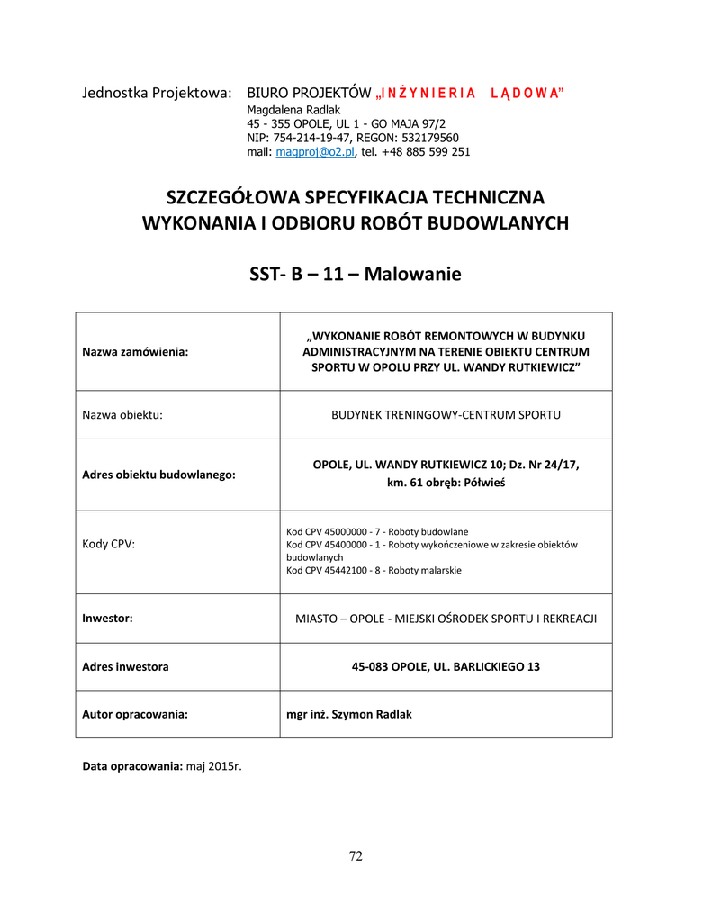 Jednostka Projektowa: BIURO PROJEKTÓW „I N Ż Y N I E R I A L Ą D O W A” Magdalena Radlak 45 - 355 OPOLE, UL 1 - GO MAJA 97/2 NIP: 754-214-19-47, REGON: 532179560 mail: [email protected], tel. +48 885 599 251 SZCZEGÓŁOWA SPECYFIKACJA TECHNICZNA WYKONANIA I ODBIORU ROBÓT BUDOWLANYCH SST- B – 11 – Malowanie Nazwa zamówienia: Nazwa obiektu: Adres obiektu budowlanego: Kody CPV: Inwestor: Adres inwestora Autor opracowania: „WYKONANIE ROBÓT REMONTOWYCH W BUDYNKU ADMINISTRACYJNYM NA TERENIE OBIEKTU CENTRUM SPORTU W OPOLU PRZY UL. WANDY RUTKIEWICZ” BUDYNEK TRENINGOWY-CENTRUM SPORTU OPOLE, UL. WANDY RUTKIEWICZ 10; Dz. Nr 24/17, km. 61 obręb: Półwieś Kod CPV 45000000 - 7 - Roboty budowlane Kod CPV 45400000 - 1 - Roboty wykończeniowe w zakresie obiektów budowlanych Kod CPV 45442100 - 8 - Roboty malarskie MIASTO – OPOLE - MIEJSKI OŚRODEK SPORTU I REKREACJI 45-083 OPOLE, UL. BARLICKIEGO 13 mgr inż. Szymon Radlak Data opracowania: maj 2015r. 72 I.CZĘŚĆ OGÓLNA Nazwa nadana zamówieniu przez zamawiającego: „WYKONANIE ROBÓT REMONTOWYCH W BUDYNKU ADMINISTRACYJNYM NA TERENIE OBIEKTU CENTRUM SPORTU W OPOLU PRZY UL. WANDY RUTKIEWICZ” Przedmiot i zakres robót budowlanych: Przedmiotem niniejszej szczegółowej specyfikacji technicznej (SST) są wymagania dotyczące wykonania i odbioru robot wykończeniowych malarskich, przewidzianych do wykonania w ramach robot budowlanych przy realizacji projektu pn.: „WYKONANIE ROBÓT REMONTOWYCH W BUDYNKU ADMINISTRACYJNYM NA TERENIE OBIEKTU CENTRUM SPORTU W OPOLU PRZY UL. WANDY RUTKIEWICZ” SST jest jednym z dokumentów przetargowych i kontraktowych przy zlecaniu ww. robót zgodnie z ustawą o zamówieniach publicznych. Stosowany jest również przy realizacji, odbiorach i rozliczaniu robót malarskich. Odstępstwa od wymagań podanych w niniejszej specyfikacji mogą mieć miejsce tylko w przypadkach małych prostych robót i konstrukcji drugorzędnych o niewielkim znaczeniu, dla których istnieje pewność, że podstawowe wymagania będą spełnione przy zastosowaniu metod wykonania na podstawie doświadczenia i przy przestrzeganiu zasad sztuki budowlanej. Zakres robót: Ustalenia zawarte w niniejszej specyfikacji obejmują wszystkie czynności umożliwiające i mające na celu: Zeskrobanie starej farby, Przygotowaniem podłoża pod malowanie, Malowanie tynków wewnętrznych - zakres zgodnie z projektem, Malowanie elementów stalowych. Informacje o terenie budowy zawierające wszystkie niezbędne dane istotne z punktu widzenia: Informacje dotyczące organizacji robót budowlanych, zabezpieczenia interesów osób trzecich, ochrony środowiska, warunków bezpieczeństwa pracy, zaplecza dla potrzeb wykonawcy, warunków dotyczących organizacji ruchu, ogrodzenia, zabezpieczenia chodników i jezdni zawarte są w Ogólnej Specyfikacji Technicznej Wykonania i Odbioru Robót Budowlanych OST. Określenia podstawowe, zawierające definicje pojęć i określeń nigdzie wcześniej niezdefiniowanych, a wymagających zdefiniowania w celu jednoznacznego rozumienia zapisów dokumentacji projektowej i specyfikacji technicznej wykonania i odbioru robót budowlanych. Określenia podane w niniejszej STT są zgodne z ustawą Prawa budowlanego, wydanymi do niej rozporządzeniami wykonawczymi, nomenklaturą Polskich Norm, aprobat technicznych, a mianowicie: Podłoże malarskie - surowa, zagruntowana lub wygładzona (np. szpachlówką) powierzchnia (np. muru, tynku, betonu, drewna, płyt drewnopodobnych, itp.), na której będzie wykonywana powłoka malarska. Powłoka malarska - stwardniała warstwa farby, lakieru lub emalii nałożona i rozprowadzona na podłożu, decydująca o właściwościach użytkowych i walorach estetycznych pomalowanej powierzchni. Farba - płynna lub półpłynna zawiesina bądź mieszanina bardzo rozdrobnionych ciał stałych (np. pigmentu barwnika i rożnych wypełniaczy) w roztworze spoiwa. II. WYMAGANIA DOTYCZĄCE WŁAŚCIWOŚCI WYROBÓW BUDOWLANYCH ORAZ NIEZBĘDNE WYMAGANIA ZWIĄZANE Z ICH PRZECHOWYWANIEM, TRANSPORTEM, WARUNKAMI DOSTAWY, SKŁADOWANIEM I KONTROLĄ JAKOŚCI - POSZCZEGÓLNE WYMAGANIA ODNOSI SIĘ DO POSTANOWIEŃ NORM Materiały do robot malarskich: PODSTAWOWE WYMAGANIA DOTYCZĄCE WŁAŚCIWOŚCI WYROBÓW BUDOWLANYCH ZGODNIE Z DOKUMENTACJĄ PROJEKTOWĄ. rozcieńczalniki, w tym: woda, inne rozcieńczalniki przygotowane fabrycznie, 73 środki do odtłuszczania, mycia i usuwania zanieczyszczeń podłoża, środki do likwidacji zacieków i wykwitów, kity i masy szpachlowe do naprawy podłoża, Dopuszcza się zamienne rozwiązania pod warunkiem: spełnienia tych samych właściwości technicznych, przedstawienia zamiennych rozwiązań na piśmie (dane techniczne, atesty, dopuszczenia do stosowania). Warunki przechowywania wyrobów do robot malarskich Wszystkie materiały powinny być przechowywane i magazynowane zgodnie z instrukcją producenta oraz wymaganiami norm wymienionych w dokumentach odniesienia. Pomieszczenie magazynowe do przechowywania wyrobów powinno być suche i zabezpieczone przed zawilgoceniem. III. WYMAGANIA DOTYCZĄCE SPRZĘTU I MASZYN NIEZBĘDNYCH LUB ZALECANYCH DO WYKONANIA ROBÓT BUDOWLANYCH ZGODNIE Z ZAŁOŻONĄ JAKOŚCIĄ Wykonawca przystępujący do robot malarskich, powinien posiadać elektronarzędzia i drobny sprzętu budowlany taki jak: Szczotki o sztywnym włosiu, Pędzle i wałki, Mieszadła napędzane wiertarka, Agregaty malarskie, Drabiny i rusztowania. IV. WYMAGANIA DOTYCZĄCE ŚRODKÓW TRANSPORTU Zgodnie z OST w punkcie IV. Pakowanie i magazynowanie Przechowywanie w magazynach półotwartych lub zamkniętych, suchych i przewiewnych, zabezpieczonych przed opadami atmosferycznymi. Transport materiałów należy wykonać zgodnie z zaleceniami producenta farb. Środki transportu powinny zabezpieczać załadowane wyroby przed wpływami atmosferycznymi. V. WYMAGANIA DOTYCZĄCE WYKONANIA ROBÓT BUDOWLANYCH Z PODANIEM SPOSOBU WYKOŃCZENIA POSZCZEGÓLNYCH ELEMENTÓW, TOLERANCJI WYMIAROWYCH, 