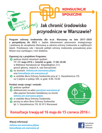 Jak chronić środowisko przyrodnicze w Warszawie? Program ochrony środowiska dla m.st. Warszawy na lata 2017–2020 z perspektywą do 2023 r. będzie dokumentem planowania strategicznego i podstawą do zarządzania Warszawą w zakresie ochrony środowiska w najbliższych latach. Przedstawia cele i kierunki polityki ochrony środowiska prowadzonej przez Miasto oraz wynikające z nich działania. Zapoznaj się z projektem Programu: podczas dwóch otwartych spotkań: 17 i 31 maja 2016 r. (wtorki) w godz. 17.00–20.00 w Bibliotece Narodowej (al. Niepodległości 213, gmach główny, wejście A, sala Darczyńców) na stronach: zielona.um.warszawa.pl/pos oraz konsultacje.um.warszawa.pl w siedzibie Biura Ochrony Środowiska przy pl. S. Starynkiewicza 7/9, na V piętrze w pokoju 504, w godz. 8.00–16.00 Przekaż swoje uwagi i wnioski: podczas spotkań elektronicznie na adres [email protected] albo poprzez formularz kontaktowy na stronie zielona.um.warszawa.pl/pos w siedzibie Biura Ochrony Środowiska pocztą na adres Biura Ochrony Środowiska (pl. S. Starynkiewicza 7/9, 02-015 Warszawa) PROGRAM OCHRONY ¥52'2:,6.$ Konsultacje trwają od 16 maja do 15 czerwca 2016 r. Więcej informacji: zielona.um.warszawa.pl/pos konsultacje.um.warszawa.pl