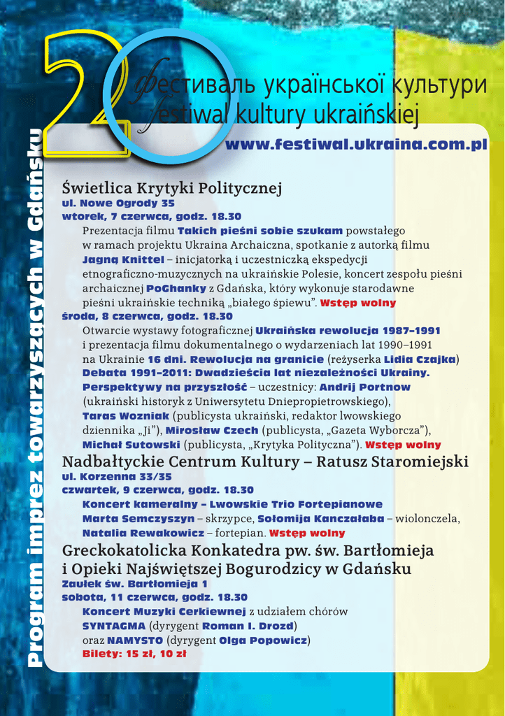 www.festiwal.ukraina.com.pl Świetlica Krytyki Politycznej ul. Nowe Ogrody 35 wtorek, 7 czerwca, godz. 18.30 Prezentacja filmu Takich pieśni sobie szukam powstałego w ramach projektu Ukraina Archaiczna, spotkanie z autorką filmu Jagną Knittel – inicjatorką i uczestniczką ekspedycji etnograficzno-muzycznych na ukraińskie Polesie, koncert zespołu pieśni archaicznej PoGhanky z Gdańska, który wykonuje starodawne pieśni ukraińskie techniką „białego śpiewu”. Wstęp wolny środa, 8 czerwca, godz. 18.30 Otwarcie wystawy fotograficznej Ukraińska rewolucja 1987–1991 i prezentacja filmu dokumentalnego o wydarzeniach lat 1990–1991 na Ukrainie 16 dni. Rewolucja na granicie (reżyserka Lidia Czajka) Debata 1991–2011: Dwadzieścia lat niezależności Ukrainy. Perspektywy na przyszłość – uczestnicy: Andrij Portnow (ukraiński historyk z Uniwersytetu Dniepropietrowskiego), Taras Wozniak (publicysta ukraiński, redaktor lwowskiego dziennika „Ji”), Mirosław Czech (publicysta, „Gazeta Wyborcza”), Michał Sutowski (publicysta, „Krytyka Polityczna”). Wstęp wolny Nadbałtyckie Centrum Kultury – Ratusz Staromiejski ul. Korzenna 33/35 czwartek, 9 czerwca, godz. 18.30 Koncert kameralny – Lwowskie Trio Fortepianowe Marta Semczyszyn – skrzypce, Sołomija Kanczałaba – wiolonczela, Natalia Rewakowicz – fortepian. Wstęp wolny Greckokatolicka Konkatedra pw. św. Bartłomieja i Opieki Najświętszej Bogurodzicy w Gdańsku Zaułek św. Bartłomieja 1 sobota, 11 czerwca, godz. 18.30 Koncert Muzyki Cerkiewnej z udziałem chórów SYNTAGMA (dyrygent Roman I. Drozd) oraz NAMYSTO (dyrygent Olga Popowicz) Bilety: 15 zł, 10 zł współpraca patronat medialny zrealizowano dzięki dotacji ] ] organizator ] Parafia Greckokatolicka w Gdańsku