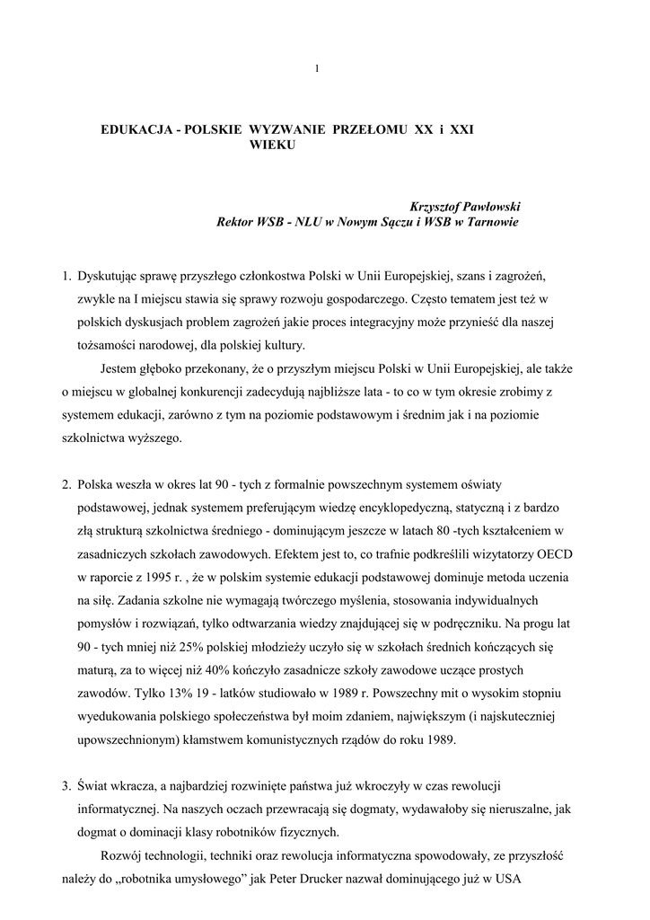 1 EDUKACJA - POLSKIE WYZWANIE PRZEŁOMU XX i XXI WIEKU Krzysztof Pawłowski Rektor WSB - NLU w Nowym Sączu i WSB w Tarnowie 1. Dyskutując sprawę przyszłego członkostwa Polski w Unii Europejskiej, szans i zagrożeń, zwykle na I miejscu stawia się sprawy rozwoju gospodarczego. Często tematem jest też w polskich dyskusjach problem zagrożeń jakie proces integracyjny może przynieść dla naszej tożsamości narodowej, dla polskiej kultury. Jestem głęboko przekonany, że o przyszłym miejscu Polski w Unii Europejskiej, ale także o miejscu w globalnej konkurencji zadecydują najbliższe lata - to co w tym okresie zrobimy z systemem edukacji, zarówno z tym na poziomie podstawowym i średnim jak i na poziomie szkolnictwa wyższego. 2. Polska weszła w okres lat 90 - tych z formalnie powszechnym systemem oświaty podstawowej, jednak systemem preferującym wiedzę encyklopedyczną, statyczną i z bardzo złą strukturą szkolnictwa średniego - dominującym jeszcze w latach 80 -tych kształceniem w zasadniczych szkołach zawodowych. Efektem jest to, co trafnie podkreślili wizytatorzy OECD w raporcie z 1995 r. , że w polskim systemie edukacji podstawowej dominuje metoda uczenia na siłę. Zadania szkolne nie wymagają twórczego myślenia, stosowania indywidualnych pomysłów i rozwiązań, tylko odtwarzania wiedzy znajdującej się w podręczniku. Na progu lat 90 - tych mniej niż 25% polskiej młodzieży uczyło się w szkołach średnich kończących się maturą, za to więcej niż 40% kończyło zasadnicze szkoły zawodowe uczące prostych zawodów. Tylko 13% 19 - latków studiowało w 1989 r. Powszechny mit o wysokim stopniu wyedukowania polskiego społeczeństwa był moim zdaniem, największym (i najskuteczniej upowszechnionym) kłamstwem komunistycznych rządów do roku 1989. 3. Świat wkracza, a najbardziej rozwinięte państwa już wkroczyły w czas rewolucji informatycznej. Na naszych oczach przewracają się dogmaty, wydawałoby się nieruszalne, jak dogmat o dominacji klasy robotników fizycznych. Rozwój technologii, techniki oraz rewolucja informatyczna spowodowały, ze przyszłość należy do „robotnika umysłowego” jak Peter Drucker nazwał dominującego już w USA 2 pracownika, posiadającego formalne wykształcenie wyższe oraz umiejętność pracy teoretycznej i analitycznej a także zwyczaju, który staje się już regułą - zwyczaju nieustannego uczenia się. Jeden z najtęższych umysłów europejskich prof. Phillippe de Woot swój raport dla Europejskiego Stołu Przedsiębiorców nazwał „The learning society” - społeczeństwo uczące się, a Białą Księgę edukacji i kształcenia Komisji Wspólnot Europejskich V i XXII Dyrekcji Generalnej otrzymała podtytuł „Nauczać i uczyć się. W stronę społeczeństwa poznającego” Najważniejszym, moim zdaniem zaleceniem zawartym w wytycznych Białej Księgi jest stwierdzenie, że priorytet dla jakości edukacji i kształcenia stał się źródłowym dla utrzymania konkurencyjności Unii Europejskiej i dla podtrzymania jej modelu społecznego oraz zalecenie zmniejszenia przedziału pomiędzy tymi, którzy wiedzą i tymi którzy nie wiedzą. 4. Polska wchodzi w XXI wiek z niezwykle korzystną dla zasadniczej przebudowy systemu edukacji sytuację demograficzną. Do szkół podstawowych już wchodzą, a do szkół średnich od 1999 roku zaczną wchodzić coraz mniej liczne roczniki niżu demograficznego, co w sposób zasadniczy ułatwia (i obniża koszty) reformę polskiego systemu edukacyjnego. Czy wykorzystamy tę szansę? Uważam, że zasadniczym polskim zadaniem na najlepsze lata jest upowszechnienie wykształcenia średniego, co znaczyć będzie wydłużenie tzw. obowiązku szkolnego z obecnych 14 lat do 17 lat, przy jednoczesnym przyśpieszeniu inicjacji szkolnej z 7 do 6 lat. Dominującą formą szkoły średniej powinno być liceum ogólnokształcące, a do matury powinno dochodzić ok. 85% młodzieży rozpoczynającej naukę w szkołach średnich. Zasadnicze szkoły zawodowe powinny kształcić nie więcej niż 5 - 10% młodzieży niezdolnej do posługiwania się wiedzą teoretyczną. Przeciętny poziom skolaryzacji na poziomie wyższym w grupie młodzieży w wieku 19 24 lat wynosił w 1990 r. w rozwiniętych państwach świata od 36% (Niemcy, Hiszpania) do 43% (Francja, Norwegia). W tym samym roku w Finlandii ten wskaźnik przekroczył 50%, w USA osiągnął 70% a w Kanadzie 96%! W tym 1990 roku w Polsce wynosił on 13%. Obecnie, po eksplozyjnym rozwoju niepaństwowych szkół wyższych i ostrym rozwoju studiów zaocznych w uczelniach państwowych wynosi ok. 20%. Pokazuje to stopień opóźnienia Polski ale i pokazuje nasze szanse. Warto choć parę słów poświęcić niezwykłemu zjawisku (nietypowemu nawet w skali Europy) to jest powstawaniu niepaństwowych szkół wyższych po 1991 r. Ilościowo liczba szkół 3 prywatnych przekroczyła już dawno liczbę uczelni państwowych (odpowiednio...) natomiast liczba studentów kształcących się w uczelniach niepaństwowych przekroczyła już 100 000 osób i zapewne rosnąć będzie nadal i osiągnie moim zdaniem 20 - 25% ogółu studentów. Ale już rok temu liczba osób przyjętych na I rok stacjonarnych studiów biznesowych w szkołach prywatnych dorównała liczbie studentów przyjętych do państwowych akademii i uniwersytetów na studia stacjonarne (13 600 i 13 800). Ten obszar edukacji już jest obszarem wyraźnie konkurencyjnym i moim zdaniem najbliższe lata przyniosą przewagę szkołom prywatnym (z których już 15 uzyskało także uprawnienia akademickie). Stawiam tezę (i potrafię ją obronić), że inwestycja w edukację, jest inwestycją relatywnie tanią, a sposób tworzenia instytucji edukacyjnych (poprzez rozłożenie procesu tworzenia na kilka lat) powoduje, że wydatki inwestycyjne mogą być także rozłożone w czasie. Przykład Szkoły Sądeckiej a obecnie także Szkoły Tarnowskiej pokazuje, że można w ciągu kilku l