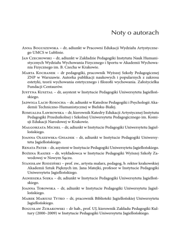 Noty o autorach Anna Boguszewska – dr, adiunkt w Pracowni Edukacji Wydziału Artystycznego UMCS w Lublinie. Jan Czechowski – dr, adiunkt w Zakładzie Pedagogiki Instytutu Nauk Humanistycznych Wydziału Wychowania Fizycznego i Sportu w Akademii Wychowania Fizycznego im. B. Czecha w Krakowie. Marta Kochanek – dr pedagogiki, pracownik Wyższej Szkoły Pedagogicznej ZNP w Warszawie. Autorka publikacji naukowych i popularnych z zakresu estetyki, teorii wychowania estetycznego i filozofii wychowania. Założycielka Fundacji Centaurów. Justyna Kusztal – dr, asystent w Instytucie Pedagogiki Uniwersytetu Jagiellońskiego. Jadwiga Lach-Rosocha – dr, adiunkt w Katedrze Pedagogiki i Psychologii Akademii Techniczno-Humanistycznej w Bielsku-Białej. Romualda Ławrowska – dr, kierownik Katedry Edukacji Artystycznej Instytutu Pedagogiki Przedszkolnej i Szkolnej Uniwersytetu Pedagogicznego im. Komisji Edukacji Narodowej w Krakowie. Małgorzata Michel – dr, adiunkt w Instytucie Pedagogiki Uniwersytetu Jagiellońskiego. Joanna Olszewska-Gniadek – dr, adiunkt w Instytucie Pedagogiki Uniwersytetu Jagiellońskiego. Renata Pater – dr, asystent w Instytucie Pedagogiki Uniwersytetu Jagiellońskiego. Bożena Raszke – dr, wykładowca w Instytucie Pedagogiki Wyższej Szkoły Zawodowej w Nowym Sączu. Stanisław Rodziński – prof. zw., artysta malarz, pedagog, b. rektor krakowskiej Akademii Sztuk Pięknych im. Jana Matejki, profesor w Instytucie Pedagogiki Uniwersytetu Jagiellońskiego. Agnieszka Sojka – dr, adiunkt w Instytucie Pedagogiki Uniwersytetu Jagiellońskiego. Joanna Torowska – dr, adiunkt w Instytucie Pedagogiki Uniwersytetu Jagiellońskiego. Marek Mariusz Tytko – dr, pracownik Biblioteki Jagiellońskiej Uniwersytetu Jagiellońskiego. Bogusław Żurakowski – dr hab., prof. UJ, kierownik Zakładu Pedagogiki Kultury (2000–2009) w Instytucie Pedagogiki Uniwersytetu Jagiellońskiego.