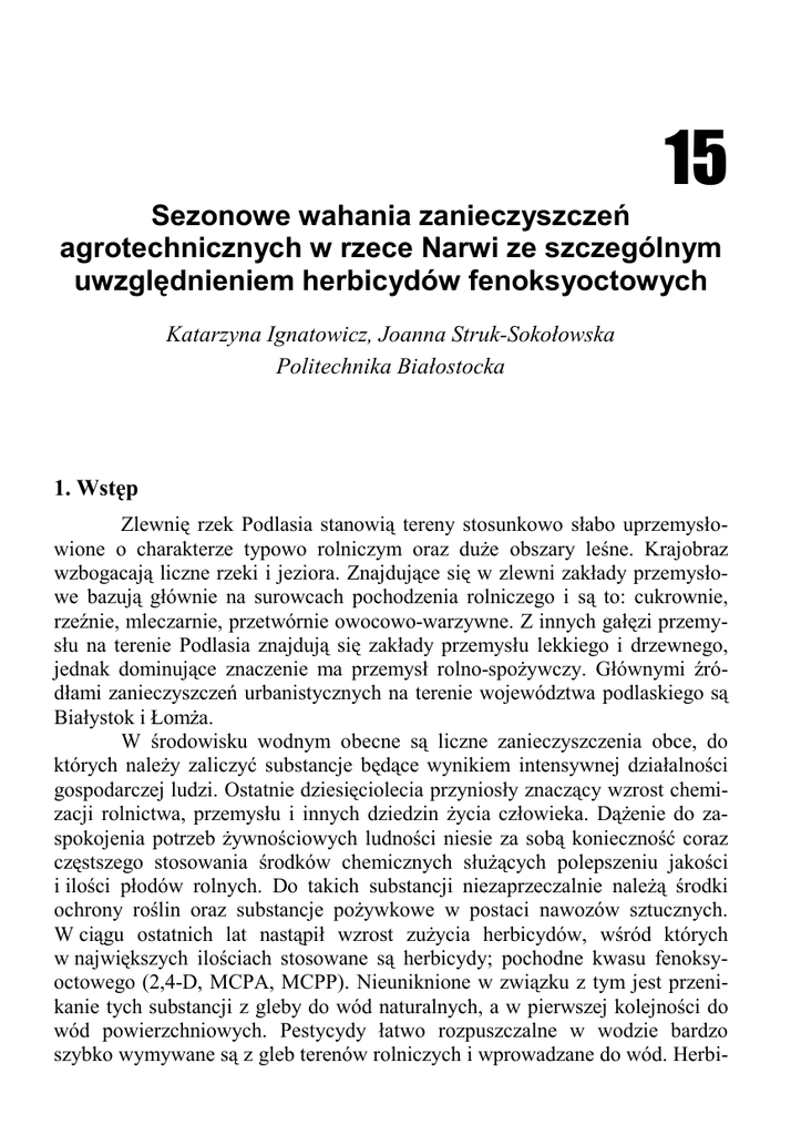 15 Sezonowe wahania zanieczyszczeń agrotechnicznych w rzece Narwi ze szczególnym uwzględnieniem herbicydów fenoksyoctowych Katarzyna Ignatowicz, Joanna Struk-Sokołowska Politechnika Białostocka 1. Wstęp Zlewnię rzek Podlasia stanowią tereny stosunkowo słabo uprzemysłowione o charakterze typowo rolniczym oraz duŜe obszary leśne. Krajobraz wzbogacają liczne rzeki i jeziora. Znajdujące się w zlewni zakłady przemysłowe bazują głównie na surowcach pochodzenia rolniczego i są to: cukrownie, rzeźnie, mleczarnie, przetwórnie owocowo-warzywne. Z innych gałęzi przemysłu na terenie Podlasia znajdują się zakłady przemysłu lekkiego i drzewnego, jednak dominujące znaczenie ma przemysł rolno-spoŜywczy. Głównymi źródłami zanieczyszczeń urbanistycznych na terenie województwa podlaskiego są Białystok i ŁomŜa. W środowisku wodnym obecne są liczne zanieczyszczenia obce, do których naleŜy zaliczyć substancje będące wynikiem intensywnej działalności gospodarczej ludzi. Ostatnie dziesięciolecia przyniosły znaczący wzrost chemizacji rolnictwa, przemysłu i innych dziedzin Ŝycia człowieka. DąŜenie do zaspokojenia potrzeb Ŝywnościowych ludności niesie za sobą konieczność coraz częstszego stosowania środków chemicznych słuŜących polepszeniu jakości i ilości płodów rolnych. Do takich substancji niezaprzeczalnie naleŜą środki ochrony roślin oraz substancje poŜywkowe w postaci nawozów sztucznych. W ciągu ostatnich lat nastąpił wzrost zuŜycia herbicydów, wśród których w największych ilościach stosowane są herbicydy; pochodne kwasu fenoksyoctowego (2,4-D, MCPA, MCPP). Nieuniknione w związku z tym jest przenikanie tych substancji z gleby do wód naturalnych, a w pierwszej kolejności do wód powierzchniowych. Pestycydy łatwo rozpuszczalne w wodzie bardzo szybko wymywane są z gleb terenów rolniczych i wprowadzane do wód. Herbi- Katarzyna Ignatowicz, Joanna Struk-Sokołowska cydy fenoksyoctowe naleŜą właśnie do takich substancji. Ich rozpuszczalność w wodzie w temperaturze około 20oC wynosi odpowiednio: 2,4-D=600 mg/l, MCPA=1605 mg/l, MCPP=620 mg/l. Przepisy Unii Europejskiej precyzyjnie określają jakość wód powierzchniowych przeznaczonych do zaopatrzenia ludności w wodę przeznaczoną do spoŜycia, charakteryzują metody pomiaru i częstotliwość pobierania próbek tych wód, a takŜe podobnie jak juŜ obowiązujące przepisy polskie, określają dopuszczalne stęŜenia substancji pestycydowych. JuŜ w dyrektywie 75/440/EWG oraz w RMŚ z dn. 7 listopada 2002 roku (Dz.U. nr 204, poz.1728) [3] wśród wskaźników fizyczno-chemicznych wymienione są takŜe maksymalne zawartości pestycydów, których całkowita zawartość nie moŜe przekraczać: w wodzie powierzchniowej kategorii A1 – 0,001 mg/l, w wodzie kategorii A2 – 0,0025 mg/l, w wodzie kategorii A3 – 0,005 mg/l. PoniewaŜ region północno-wschodni naleŜy do terenów typowo rolniczych, a zuŜycie kwasów fenoksyoctowych jest tu wysokie, istnieje powaŜne niebezpieczeństwo nadmiernego przenikania tych substancji do wód powierzchniowych. Dostępna literatura nie podaje aktualnych stęŜeń tych związków w wodach Podlasia. Od lat prowadzone są jedynie pomiary ilości nie stosowanego od dziesięcioleci DDT i jego metabolitów. W związku z tym celowym wydało się podjęcie badań nad występowaniem zanieczyszczeń obszarowych na terenie białostocczyzny, szczególnie z uwagi na fakt, Ŝe wiele wód powierzchniowych tego regionu jest źródłem wody do picia. Do badań wytypowano między innymi rzekę Narew, Białą, Supraśl oraz jej dopływy, Czapliniankę, Płoskę. W pracy przedstawiono wyniki badań dotyczące ilości zanieczyszczeń obszarowych w rzece Narwi. 2. Charakterystyka rzeki Narwi Narew jest prawym dopływem Wisły, ma długość 484 km. Zlewnia tej rzeki obejmuje obszar 75175,2 km2. Jest to typowa rzeka nizinna. Warunki środowiskowe na obrzeŜach rzeki są wyraźnie uzaleŜnione od połoŜenia względem nurtu. Przy wymywanym brzegu prędkość przepływu wody, a co za tym idzie jej dynamiczne oddziaływanie jest bardzo silne. TakŜe natlenienie wody i podłoŜa jest zbliŜone do występującego w głównym nurcie. Dodatkowo wymywany brzeg dostarcza znacznej ilości róŜnych substancji nieorganicznych i organicznych wpadających do wody. Przy brzegu akumulacyjnym zwykle występują płycizny o znacznie spowolnionym przepływie. Na odcinkach pośrednich obrzeŜa rzeki są urozmaicone, często występują wiry i prądy wsteczne lub za190 Środkowo-Pomorskie Towarzystwo Naukowe Ochrony Środowiska Sezonowe wahania zanieczyszczeń agrotechnicznych w rzece Narwi ... stoiska przybrzeŜne. W zastoiskach mogą pojawiać się w osadach okresowe niedobory tlenu [1]. Zlewnię górnej Narwi stanowią tereny stosunkowo słabo uprzemysłowione o charakterze typowo rolniczym oraz duŜe obszary leśne. Przewaga obszarów rolniczych szczególnie jest widoczna w części zlewni w granicach województwa mazowieckiego, zaś obszarów leśnych w granicach województwa podlaskiego. Warunki hydrologiczne w dorzeczu Narwi są typowe dla rzek nizinnych. Charakteryzują się one wezbraniem wiosennym, powstającym w wyniku topnienia śniegu oraz dość wyrównanym odpływem letnim, wezbrania letnie występują sporadycznie. Opady przybierają wartości zbliŜone, a wielkość odpływu – nieco niŜsze od do wartości charakteryzujących zlewnię Wisły Środkowej. Ilościowy stan zasobów wodnych jest z reguły charakteryzowany za pomocą przepływów (m3/s), określanych na podstawie obserwacji stanów wody i pomiarów hydrometrycznych. W tabeli 1 zestawiono informacje dotyczące hydrologicznej sieci pomiarowej, przy czym uwzględniono tylko te posterunki, dla których obserwacje obejmują stany i przepływy wody (posterunki zlokalizowane na rzekach). KaŜdy z posterunków wodowskazowych został opisany poprzez dane określające: połoŜenie: nazwa poste
